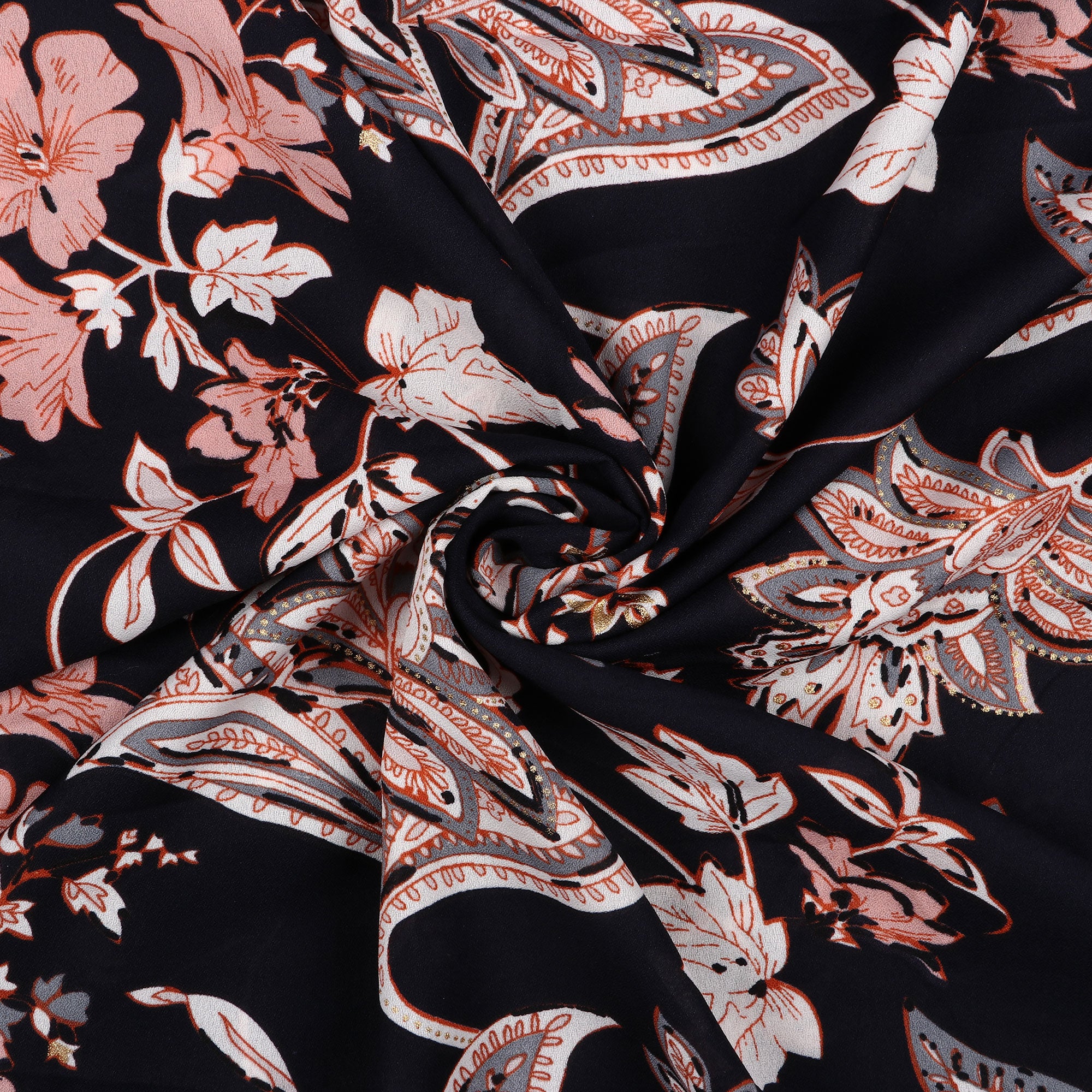 Black And Salmon Red Liberty Pattern Screen Print Polly Moss Fabric