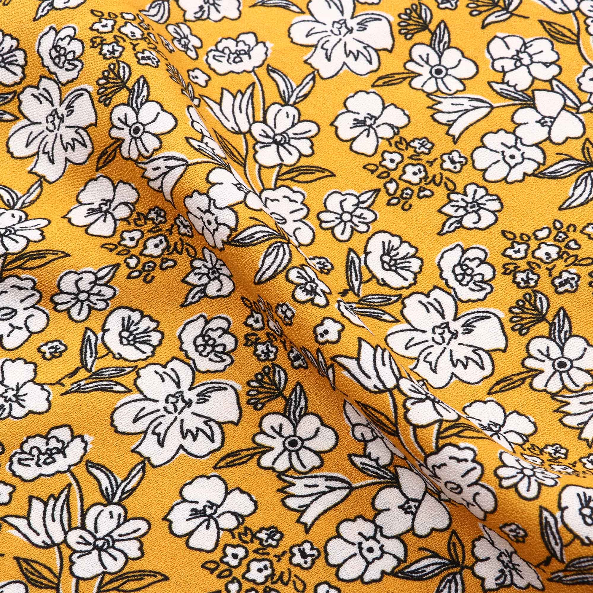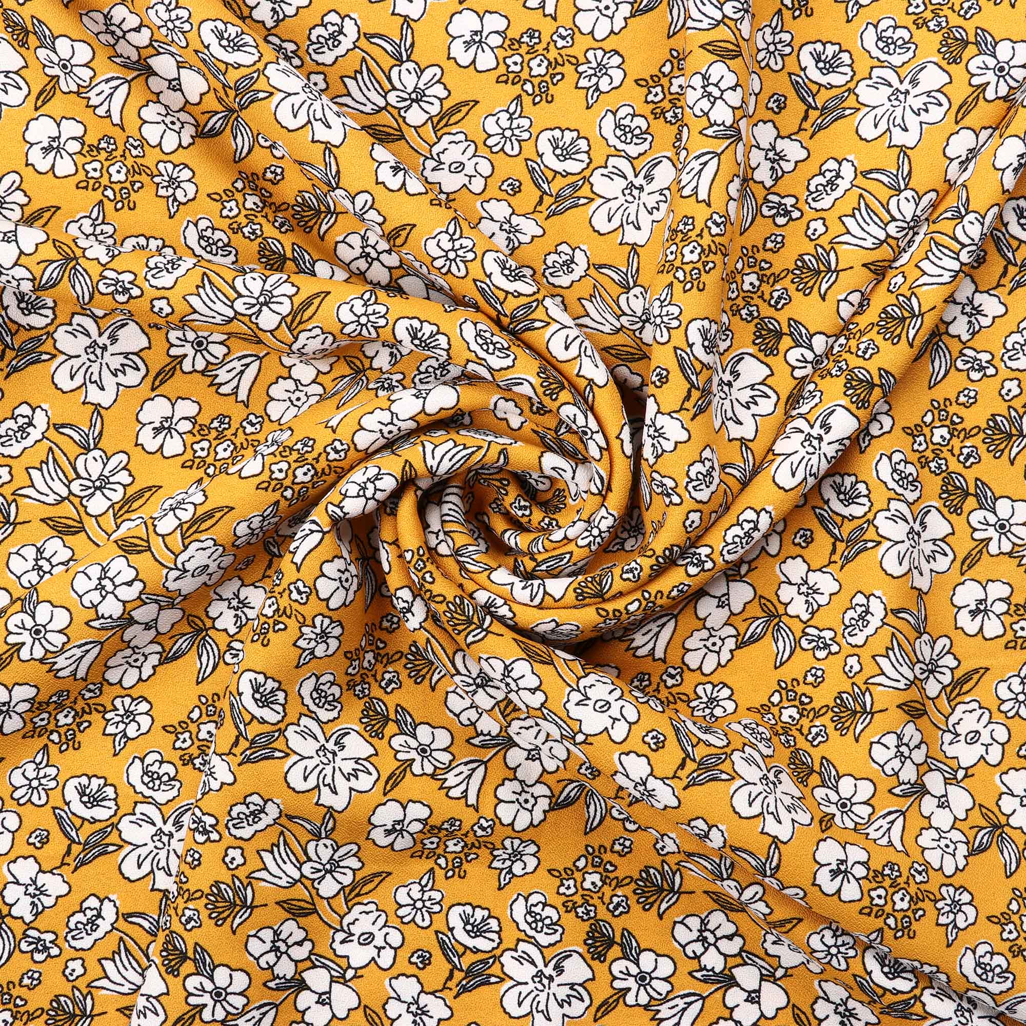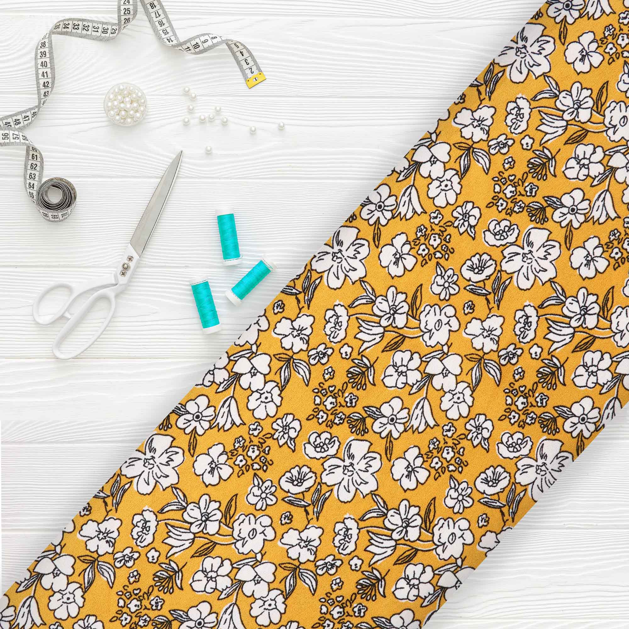 Mustard Yellow And White Floral Pattern Screen Print Moss Crepe Fabric