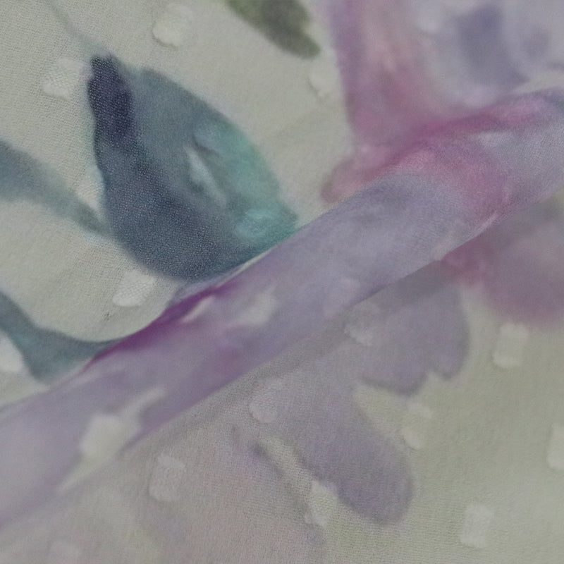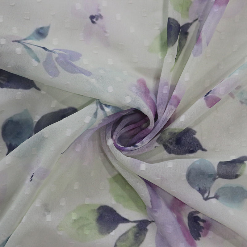 Georgette Dobby fabric is a type of polyester fabric that has a distinctive dobby weave, giving it a textured appearance. It is often printed with digital designs, which provides sharp and vibrant prints. This fabric is lightweight, durable, and easy to care for, making it a popular choice for clothing and home decor items. It has a slightly sheer appearance, drapes well, and has a soft, flowing feel.
