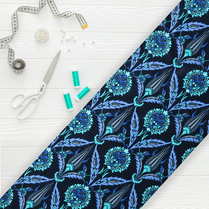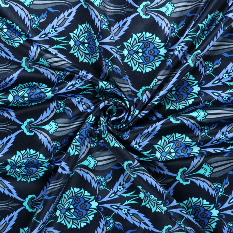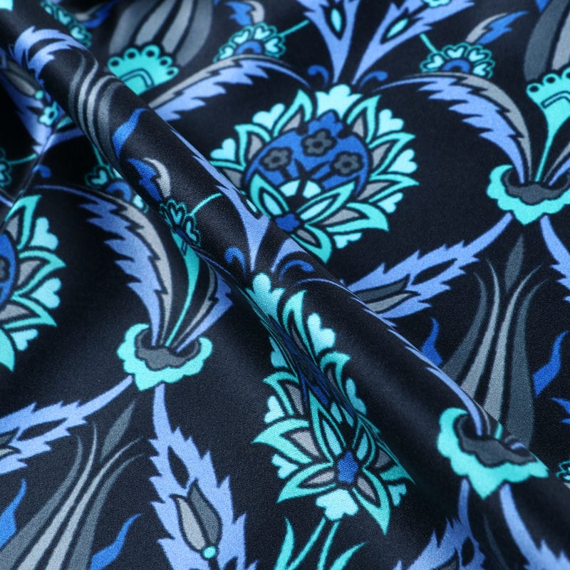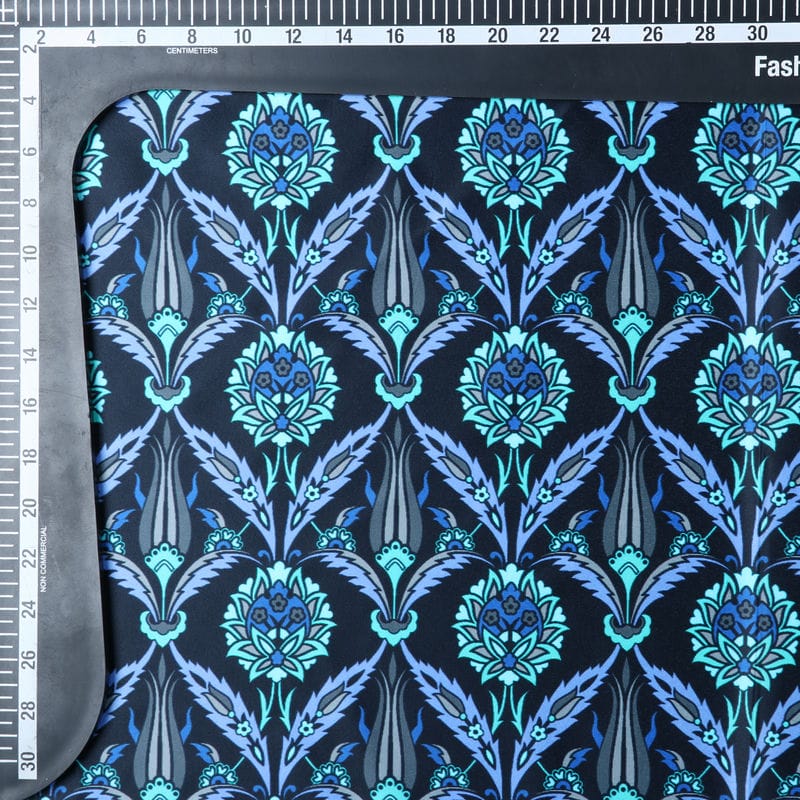 Black And Blue Floral Pattern Digital Print Silk Satin Fabric