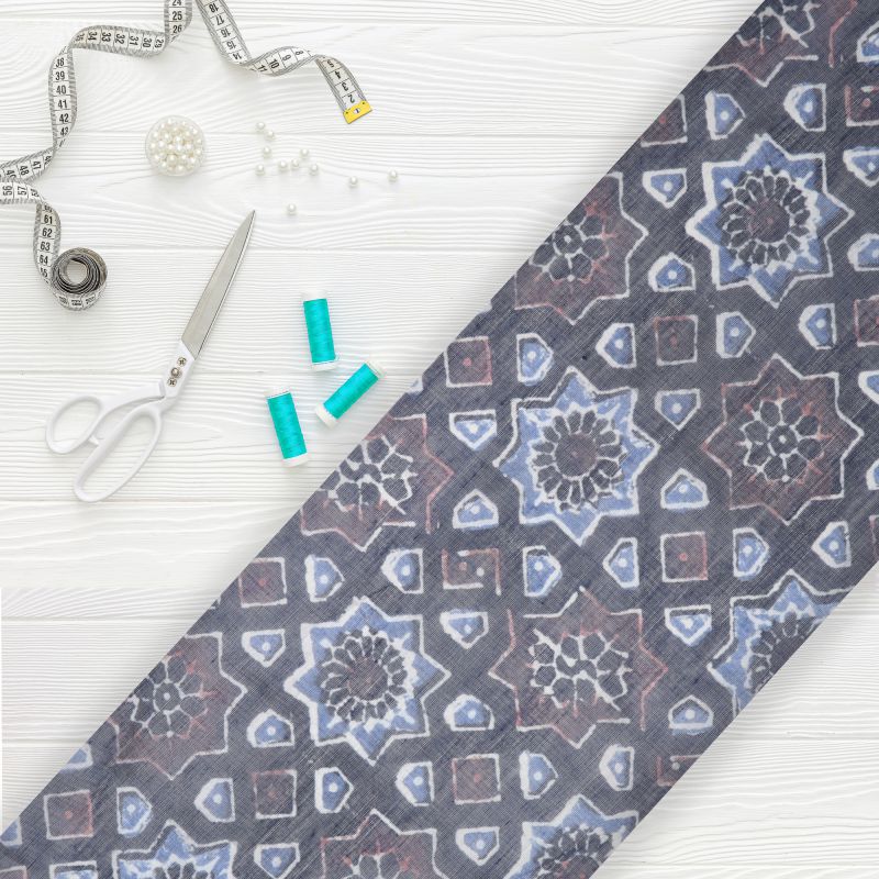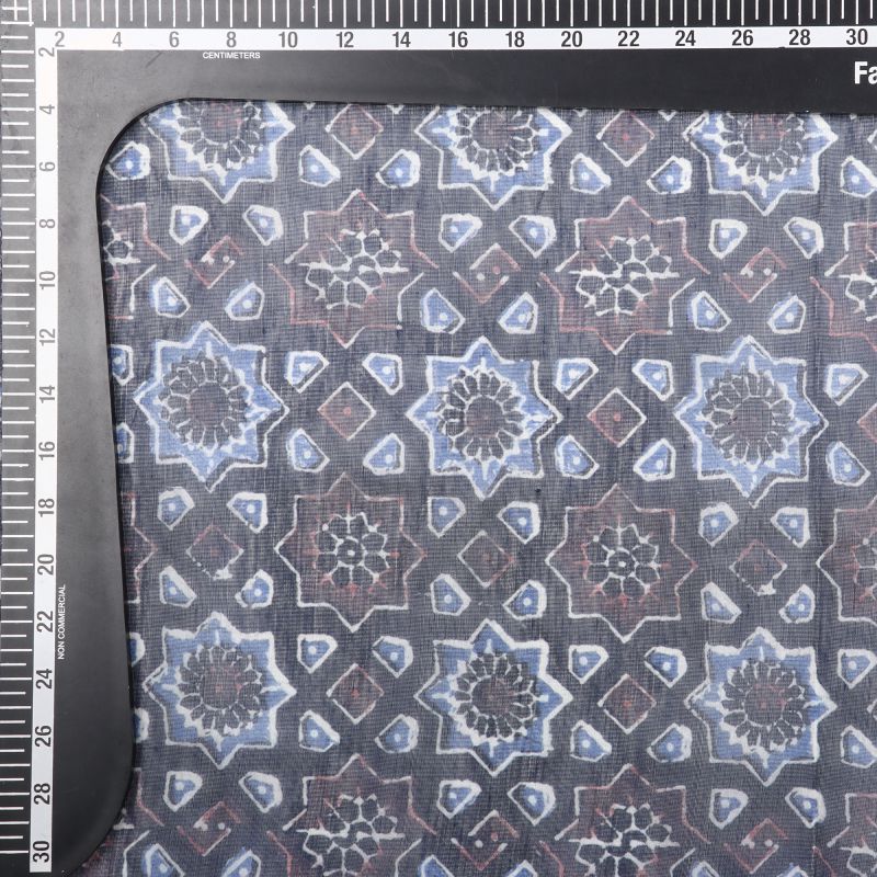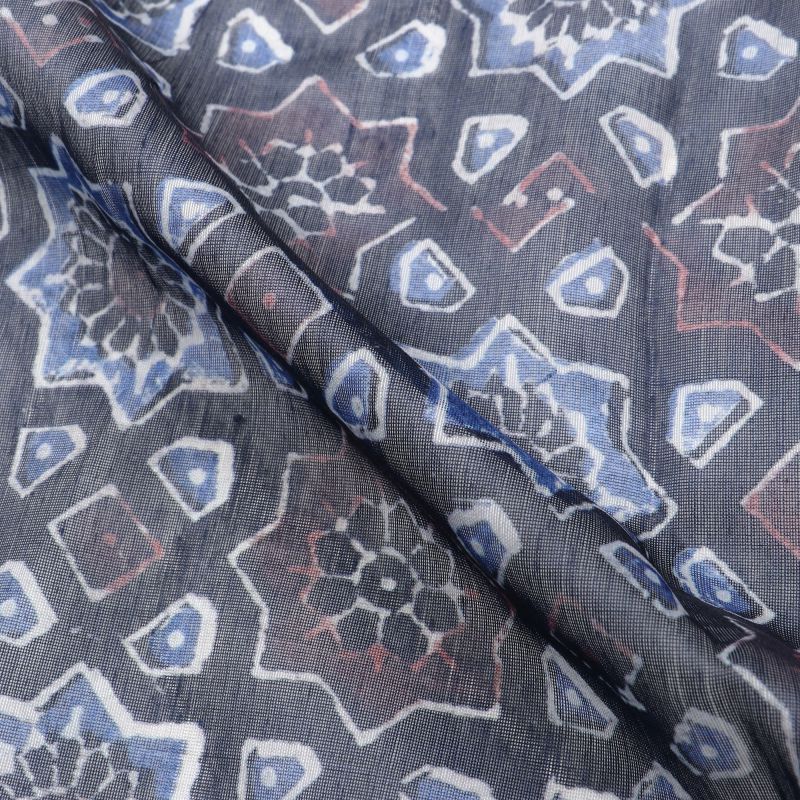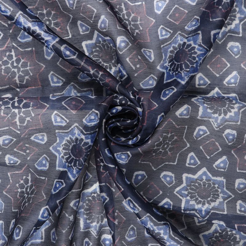 Black And Blue Geometric Pattern Digital Print Chanderi Fabric
