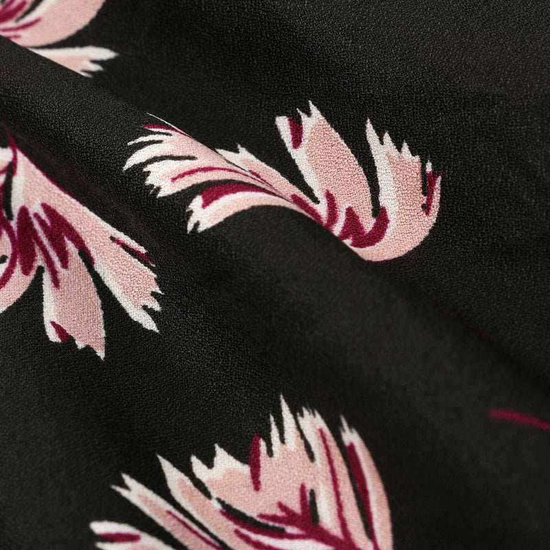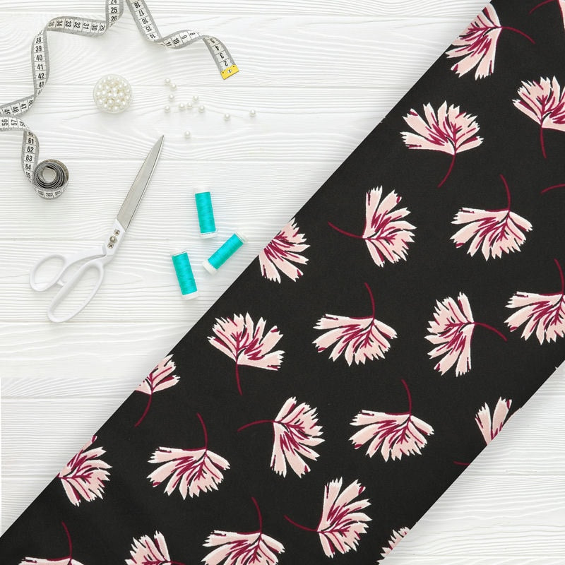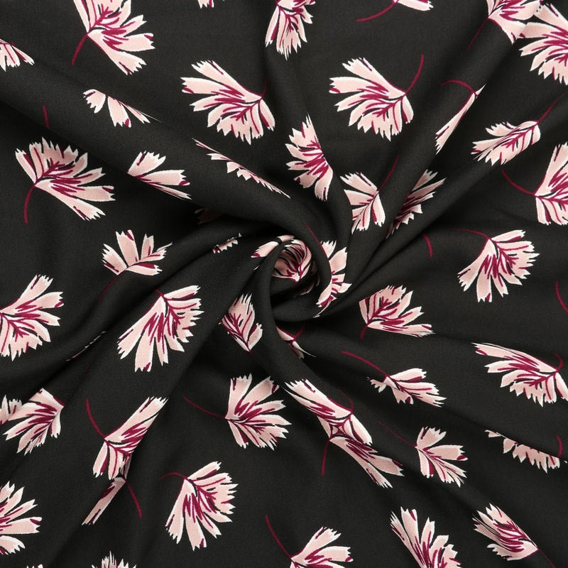 Black And Burgundy Floral Pattern Screen Print Moss Crepe Fabric
