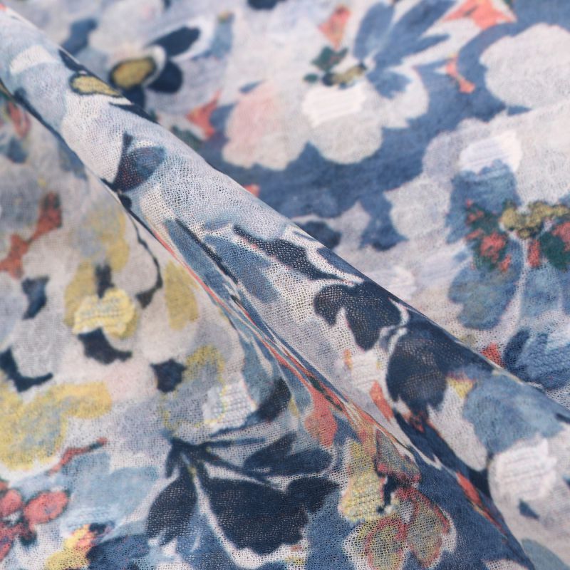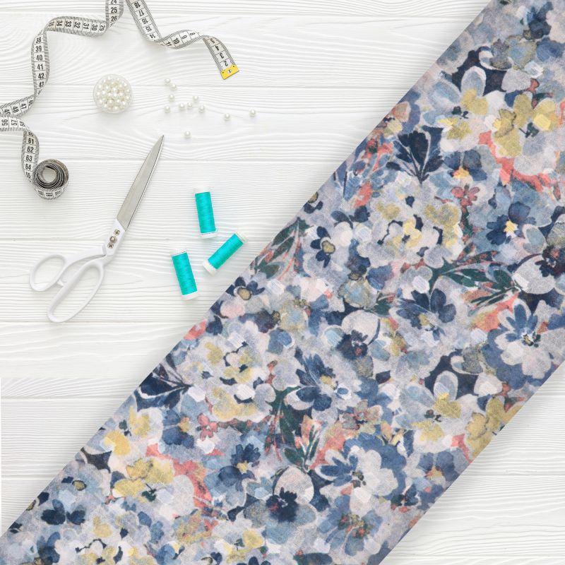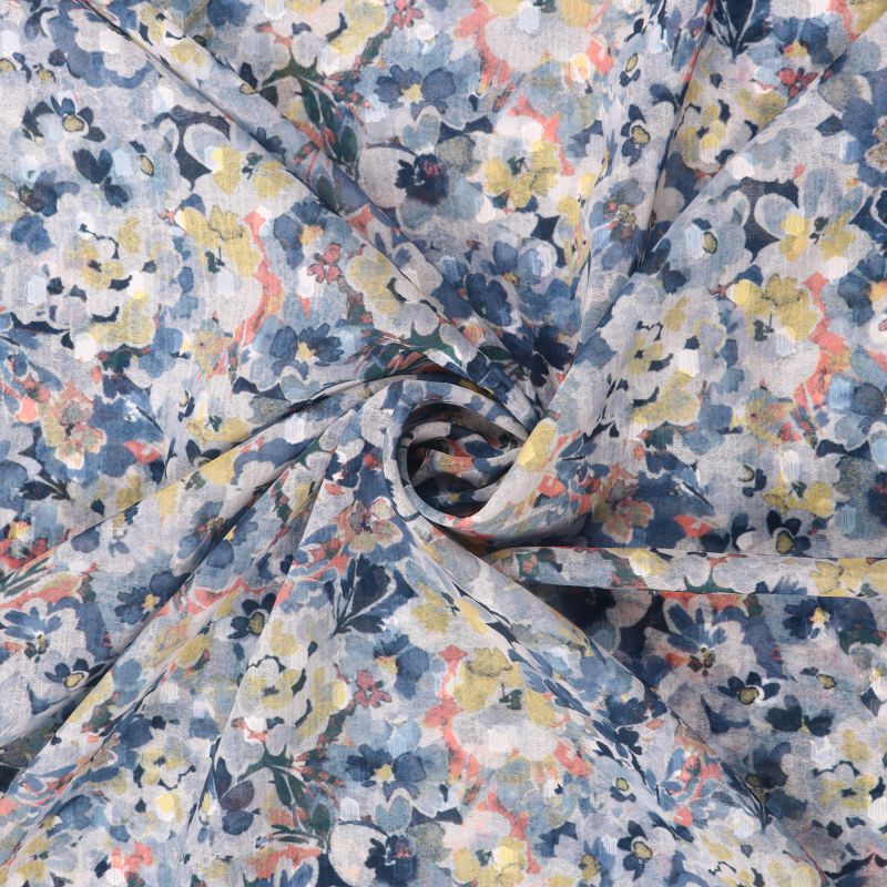 Blue And Yellow Floral Pattern Digital Print Chiffon Dobby Fabric