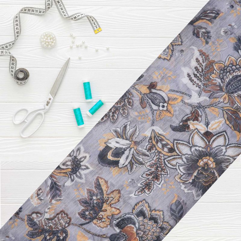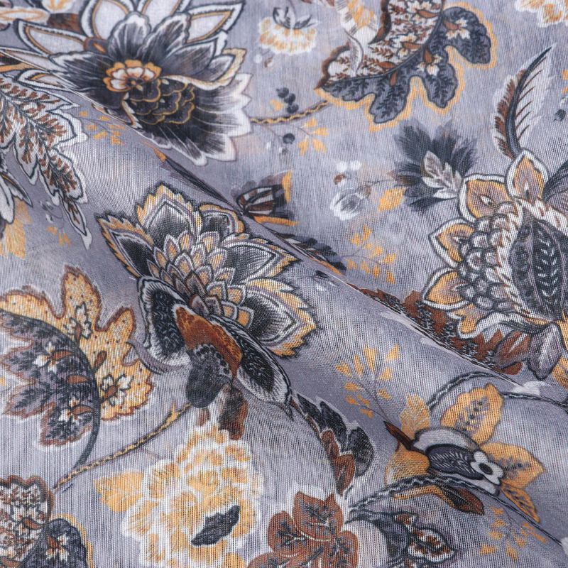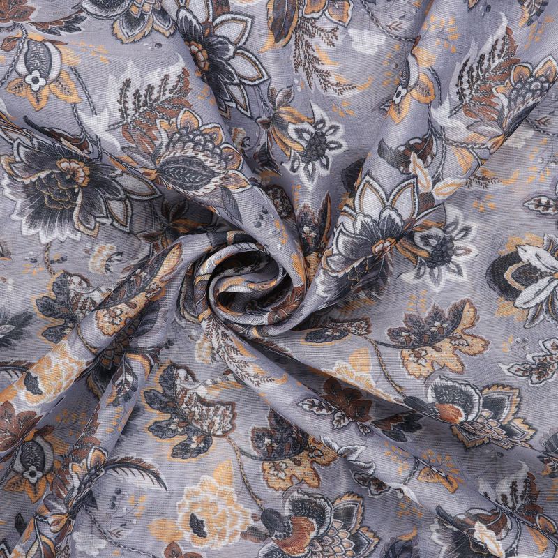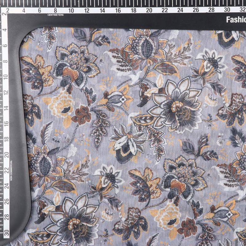 Grey And Golden Yellow Floral Pattern Digital Print Chanderi Fabric