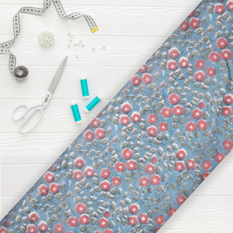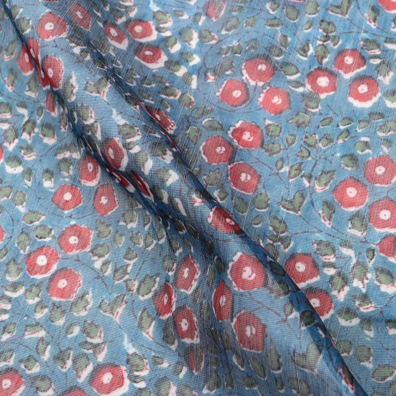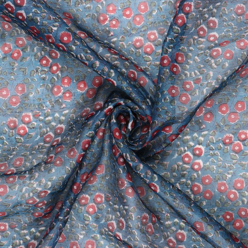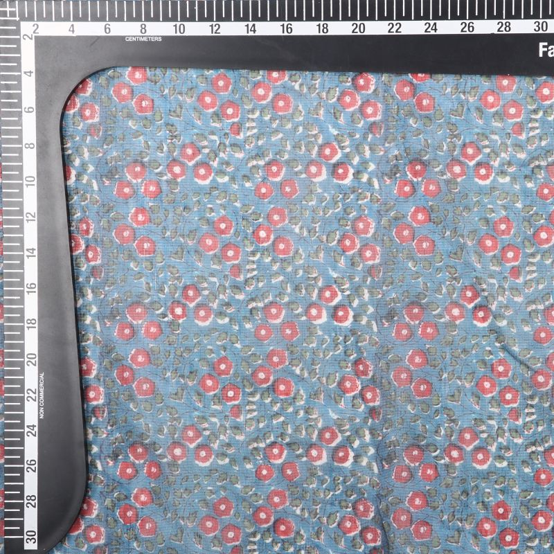 Greyish Blue And Red Floral Pattern Digital Print Chanderi Fabric