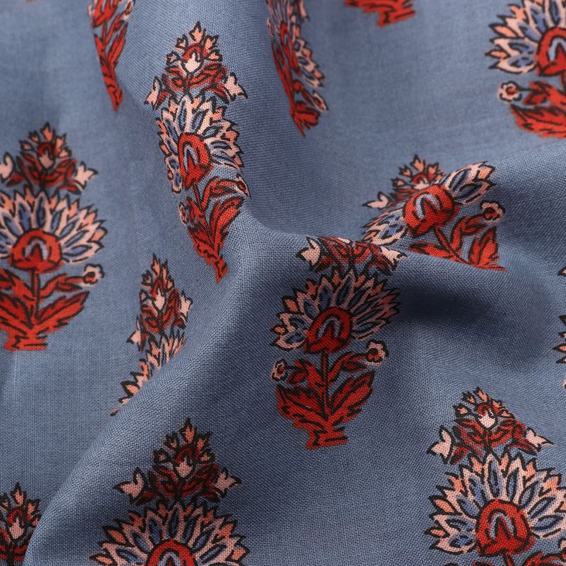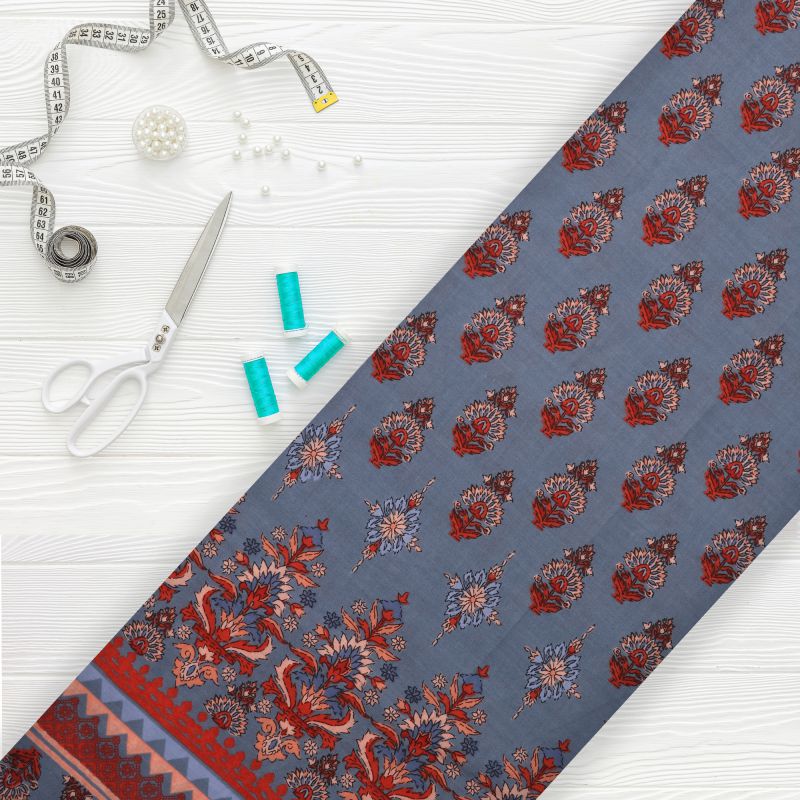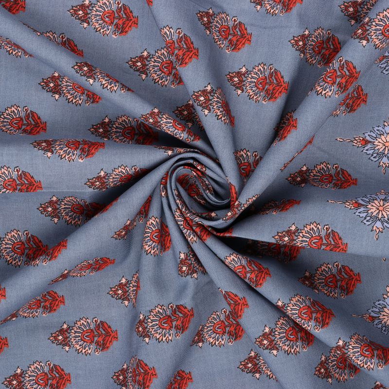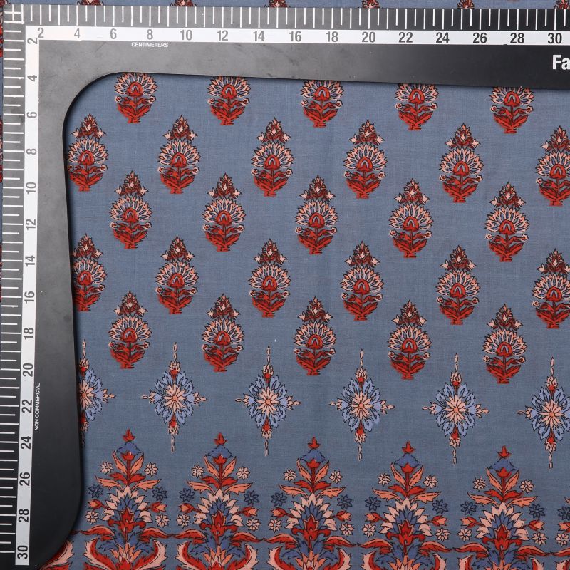 Greyish Blue And Red Traditional Pattern Screen Print Cotton Fabric