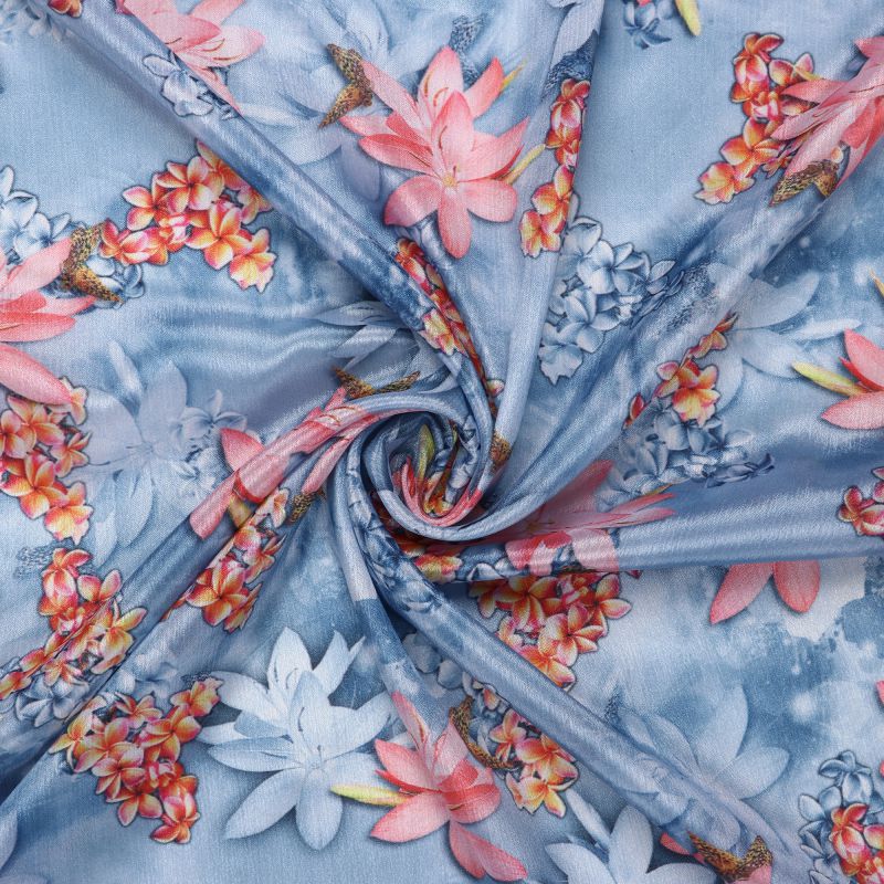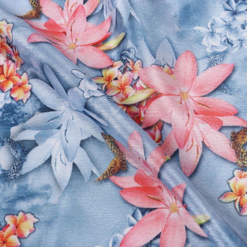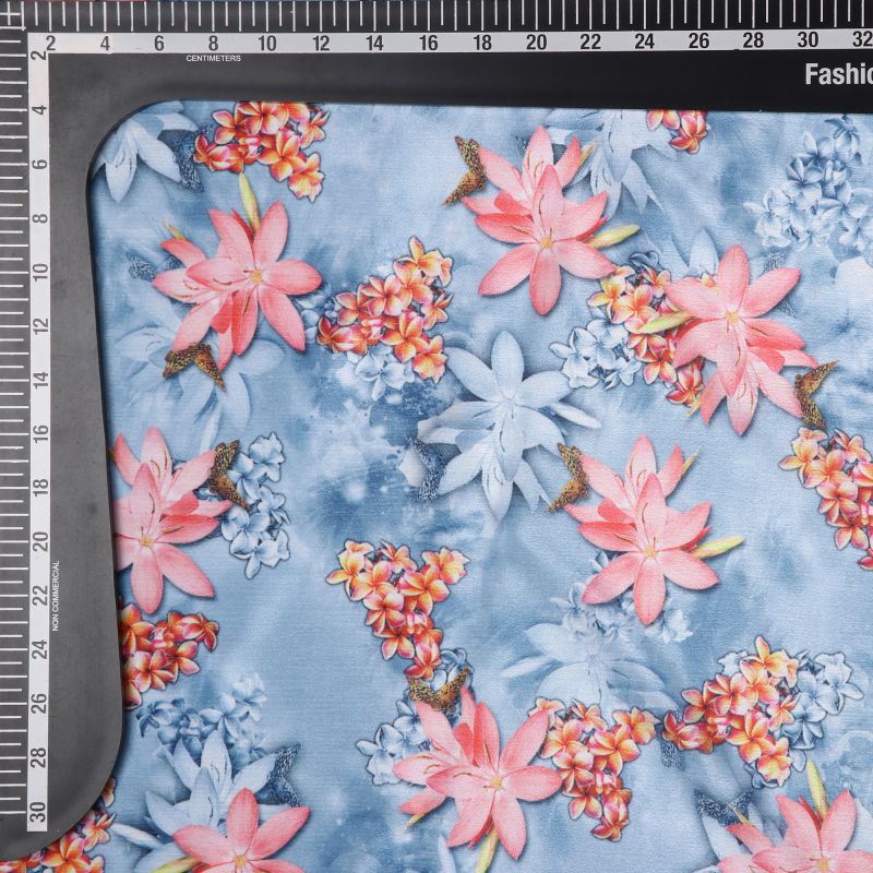 Greyish Blue And Salmon Pink Floral Pattern Digital Print Chinon Chiffon Fabric