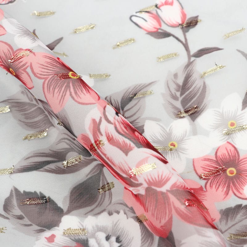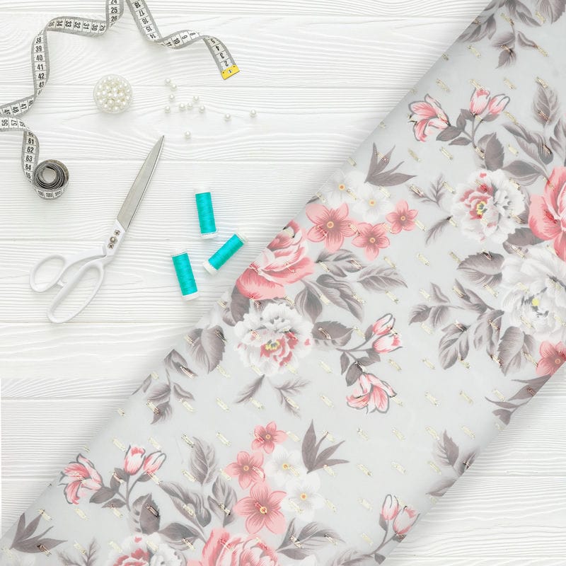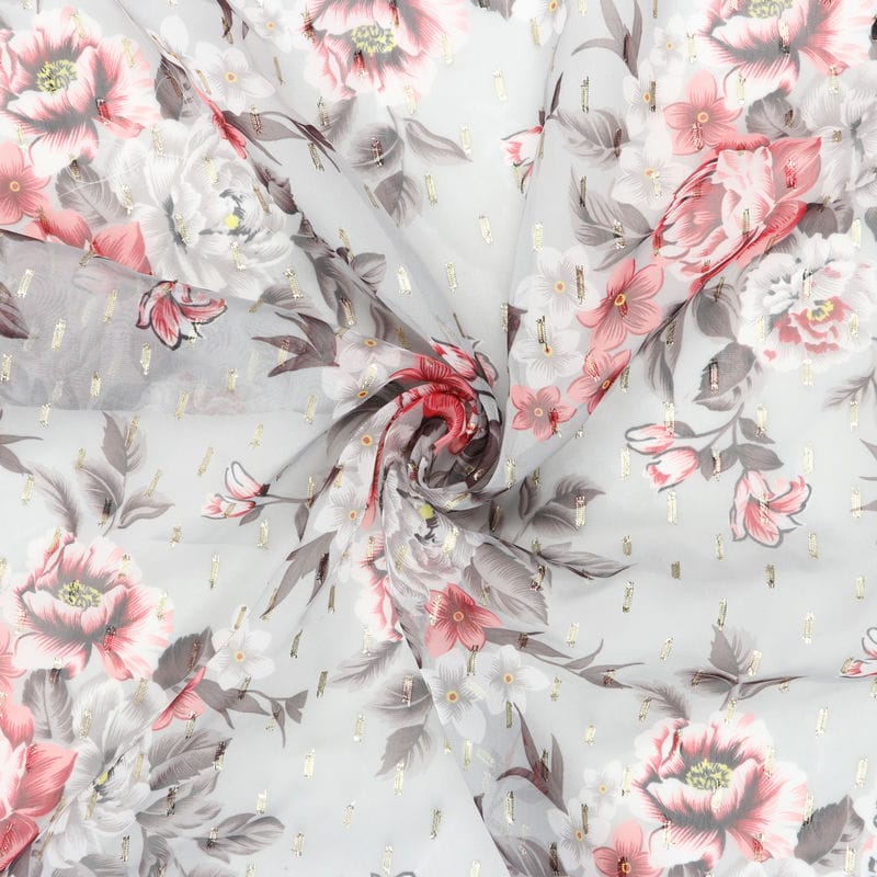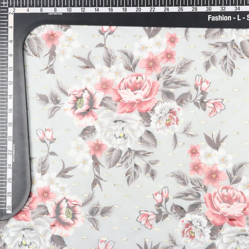 Light Grey And Dark Pink Floral Pattern Digital Print Chiffon Fabric with Golden Zari Dobby