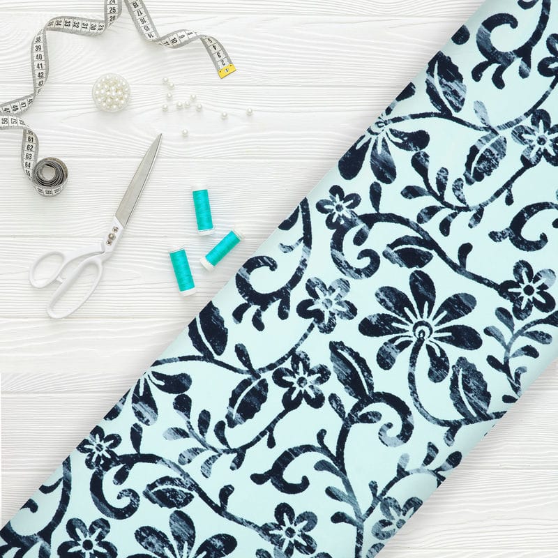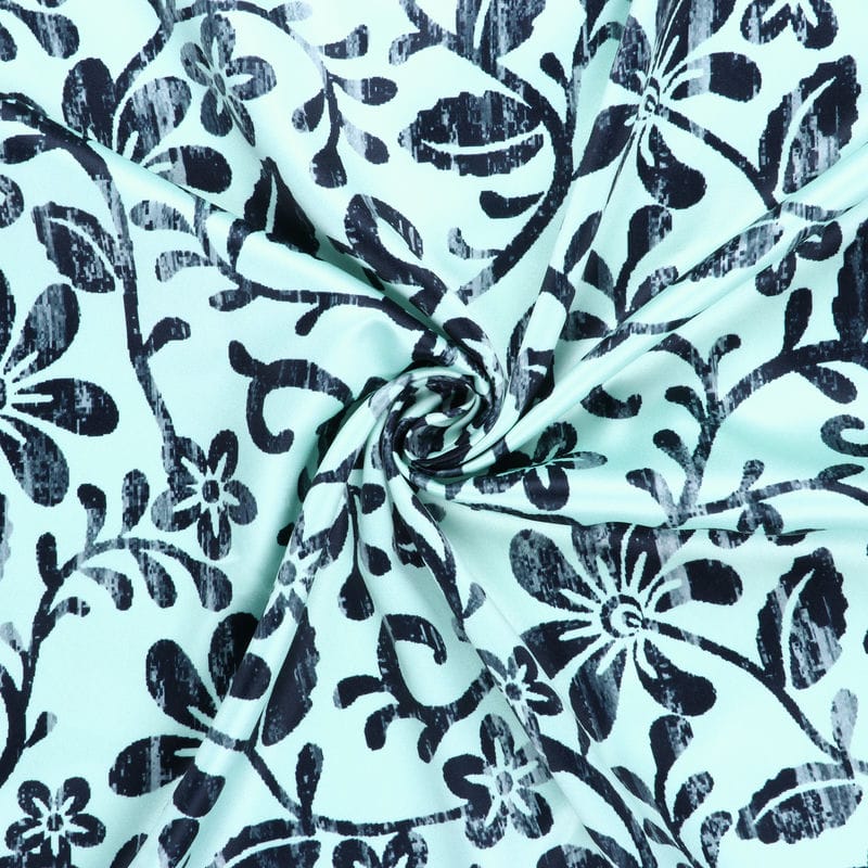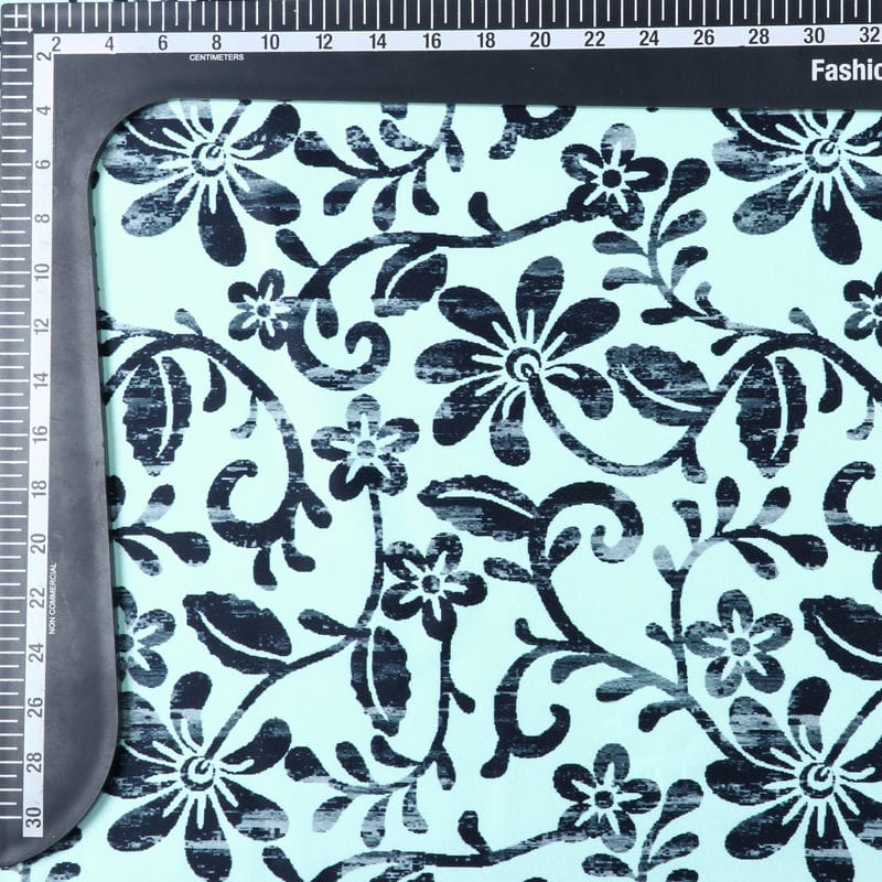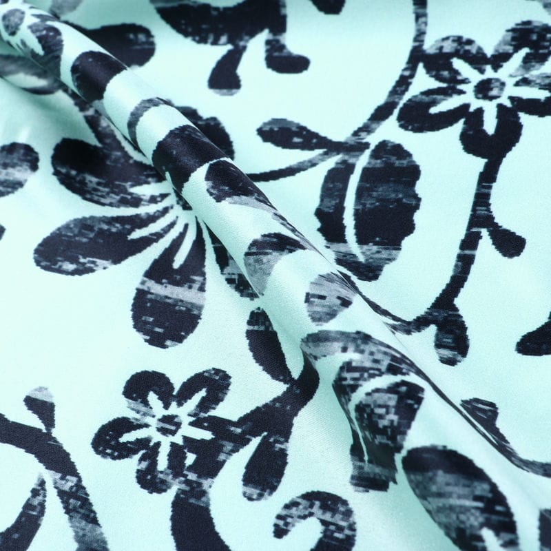 Light Sea Green And Black Floral Pattern Digital Print Silk Satin Fabric