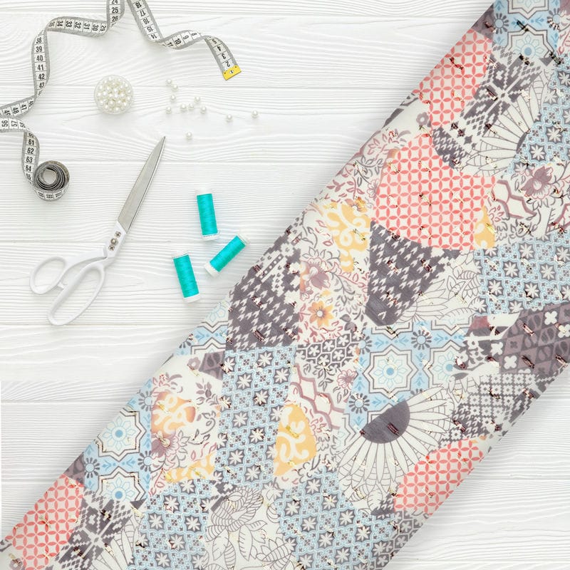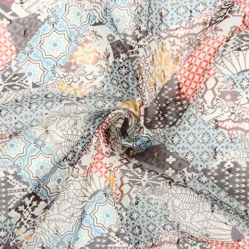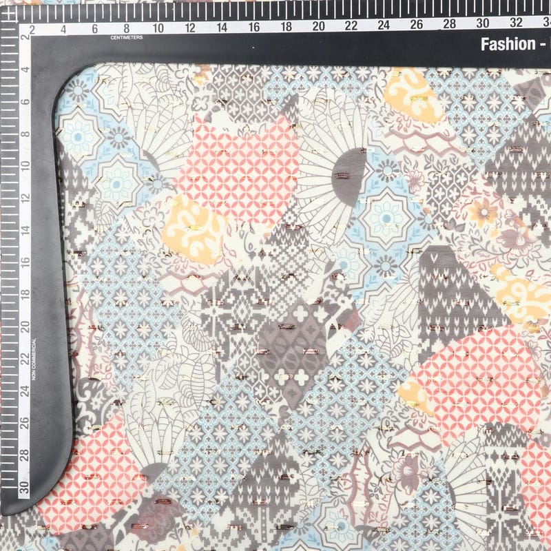 Multi Color Patch Pattern Digital Print Chiffon Fabric with Golden Zari Dobby