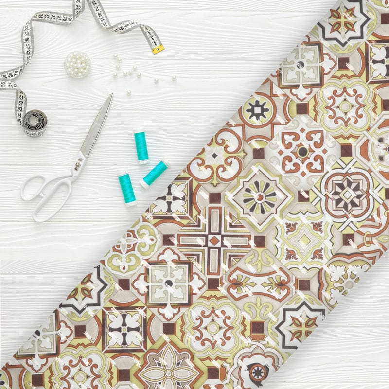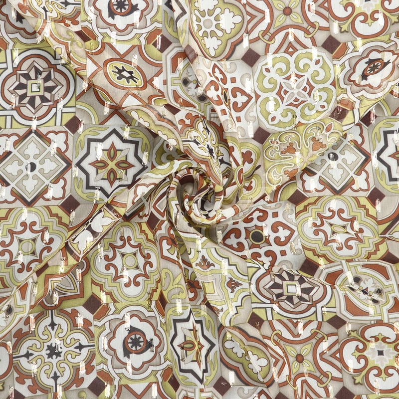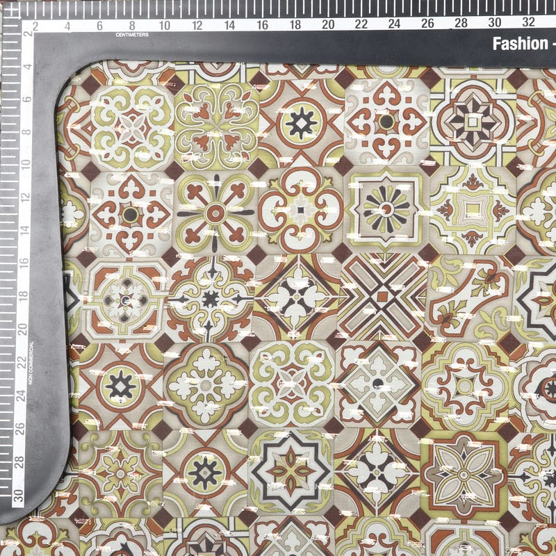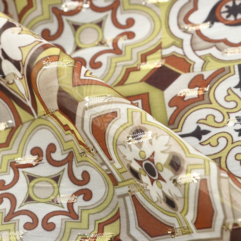 Mustard Yellow And Brown Geometric Pattern Digital Print Chiffon Fabric with Golden Zari Dobby