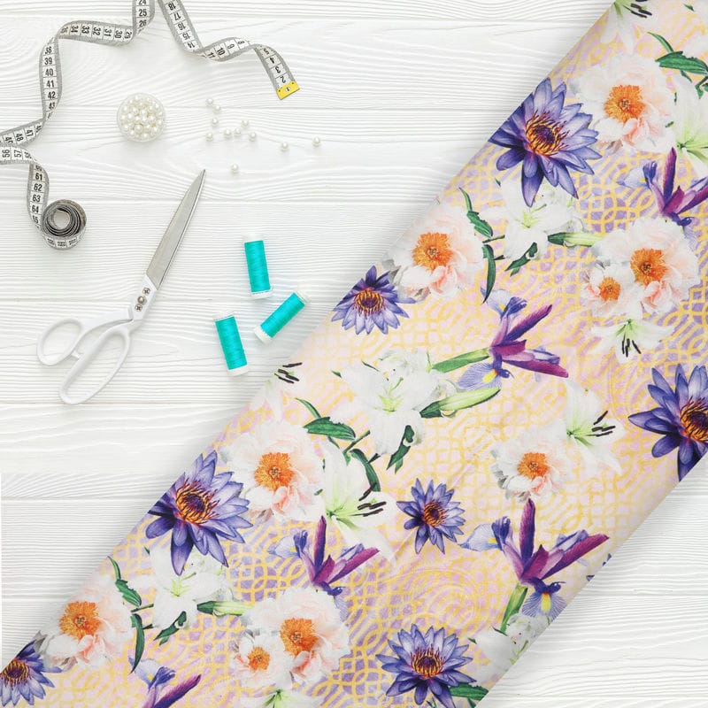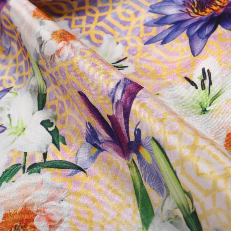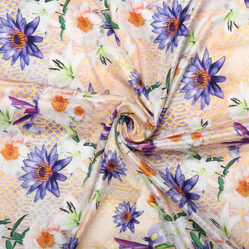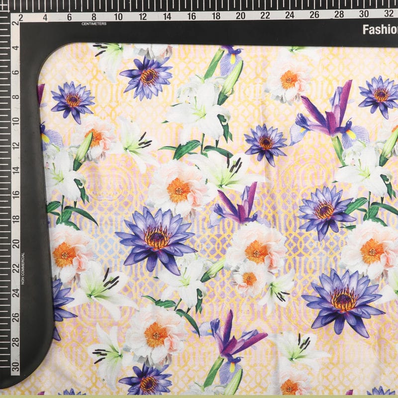 Purple And White Floral Pattern Digital Print Silk Crepe Fabric