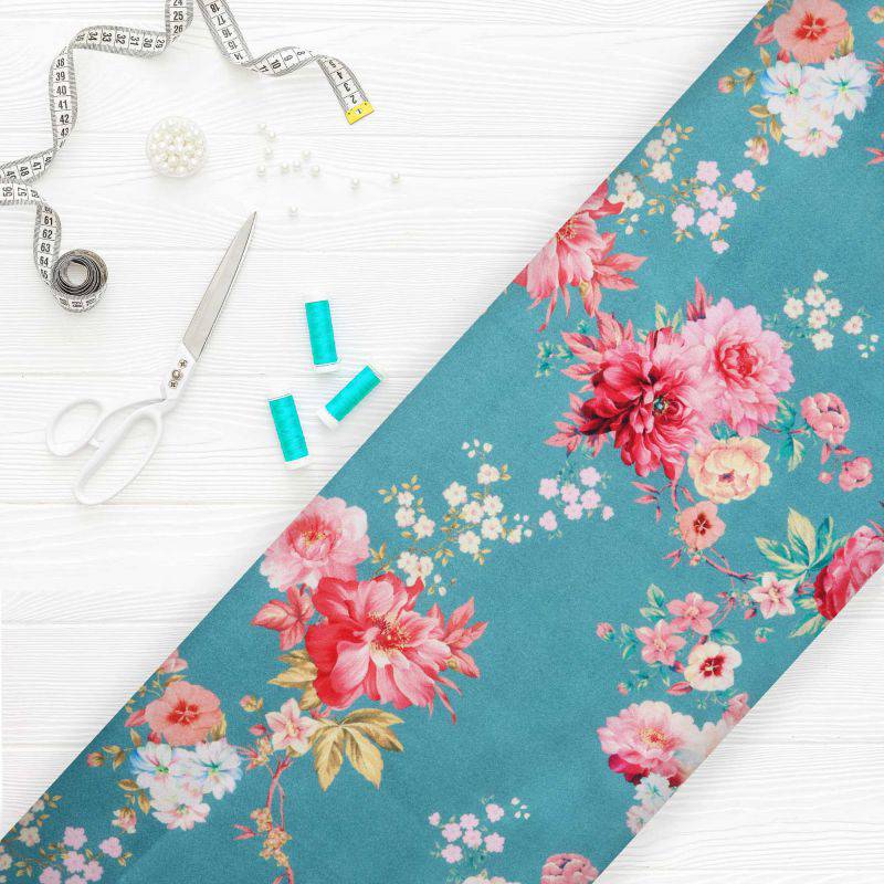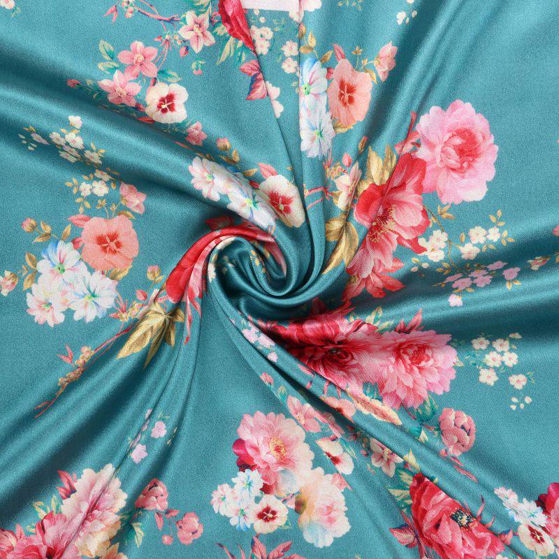 Sea Green And Pink Floral Pattern Digital Print Japan Satin Fabric