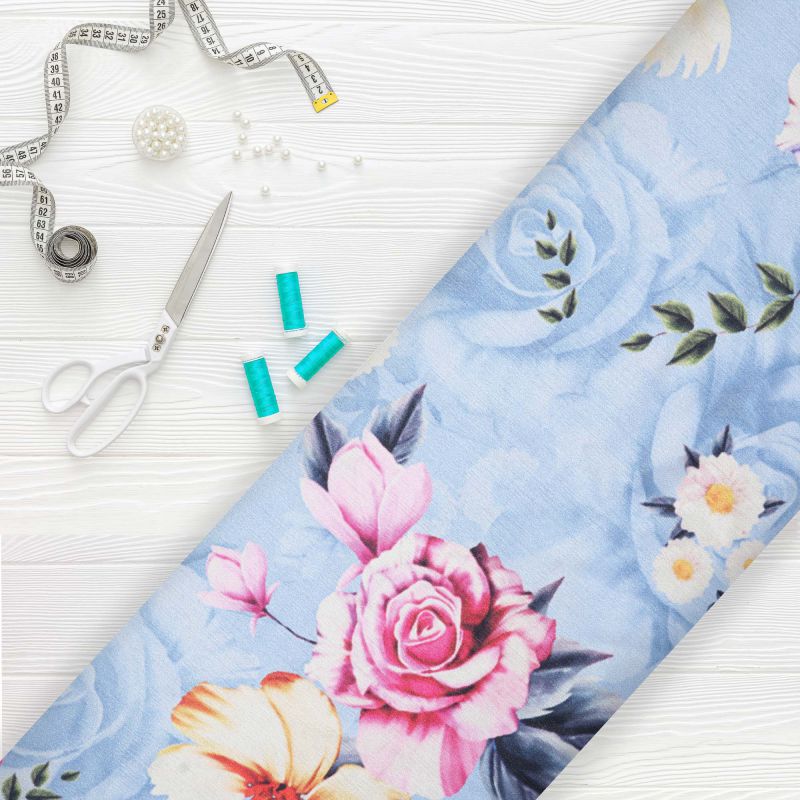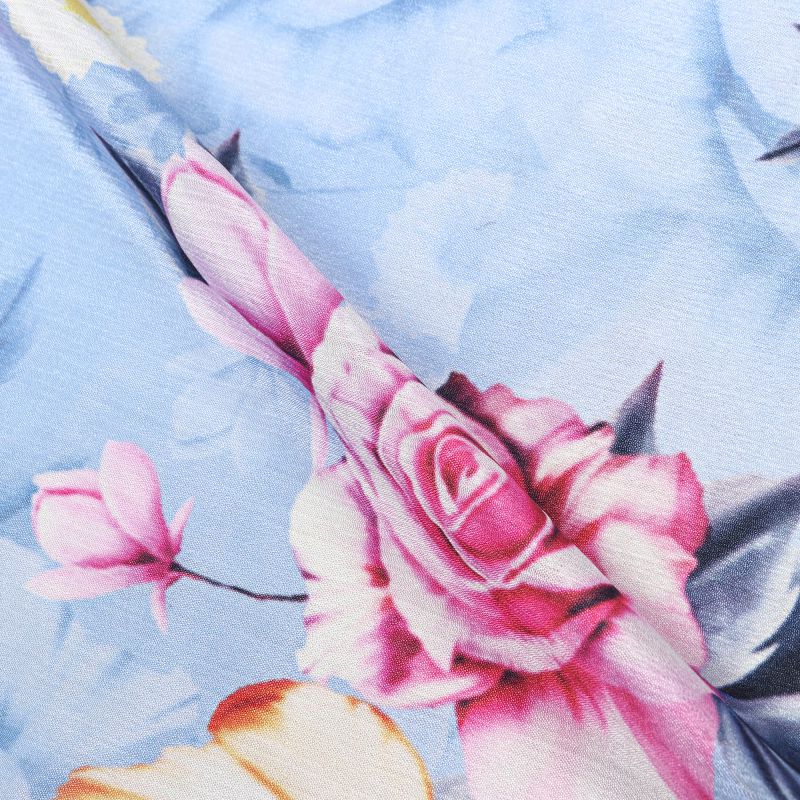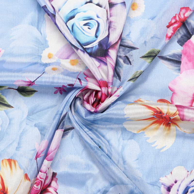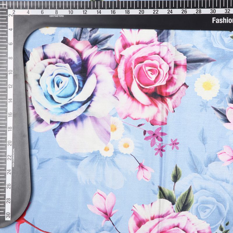 Sky Blue And Pink Floral Pattern Digital Print Chinon Chiffon Fabric