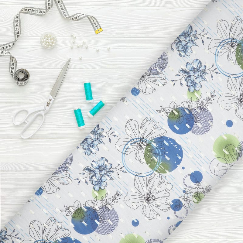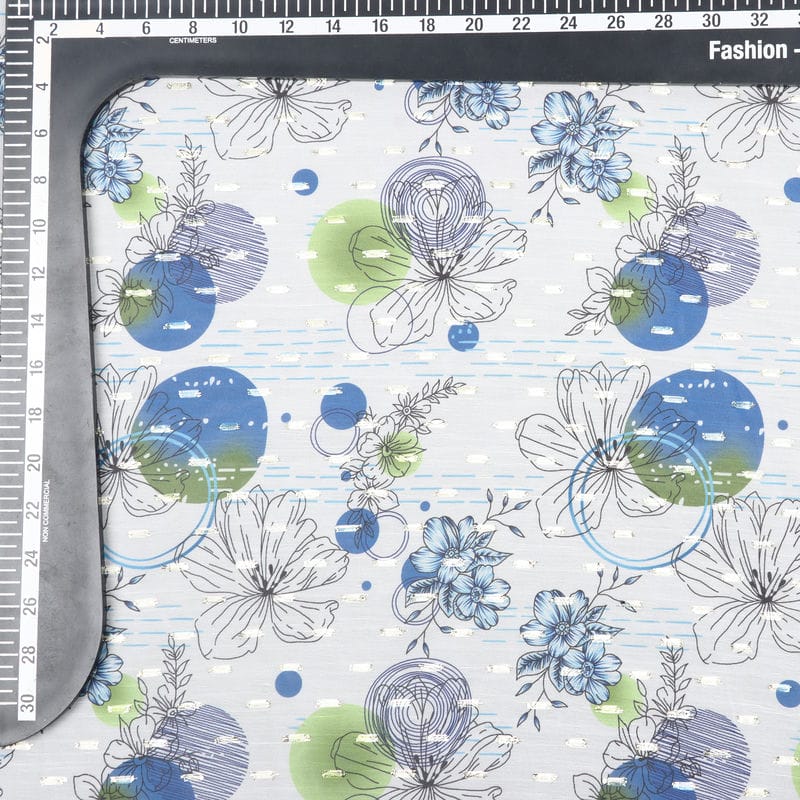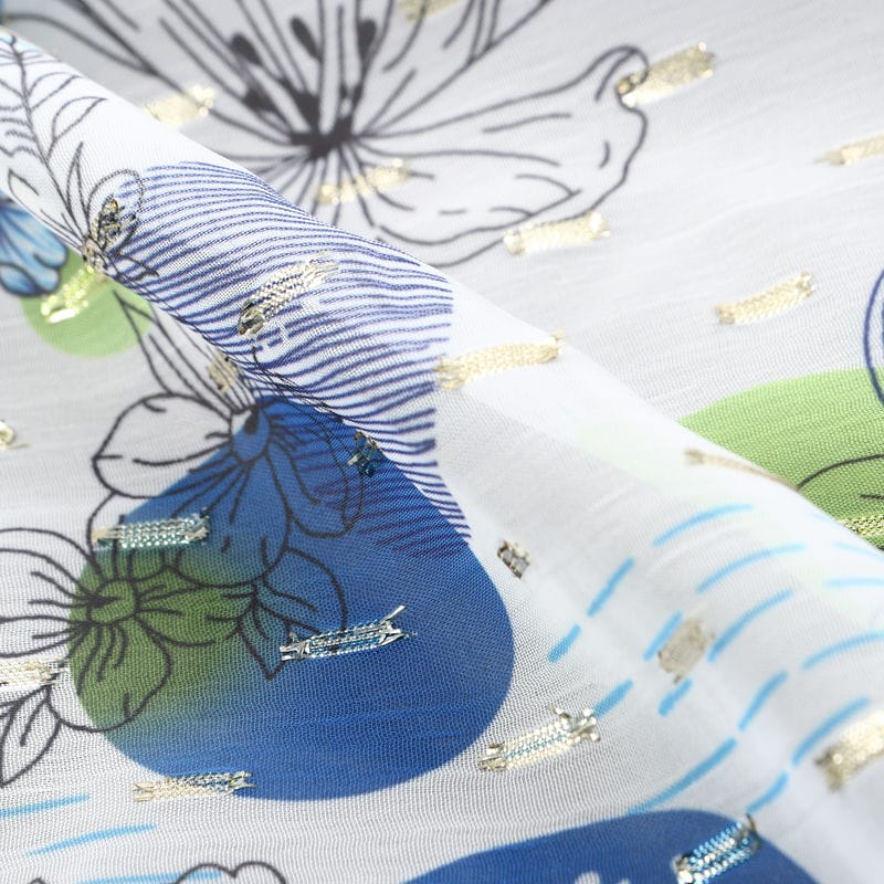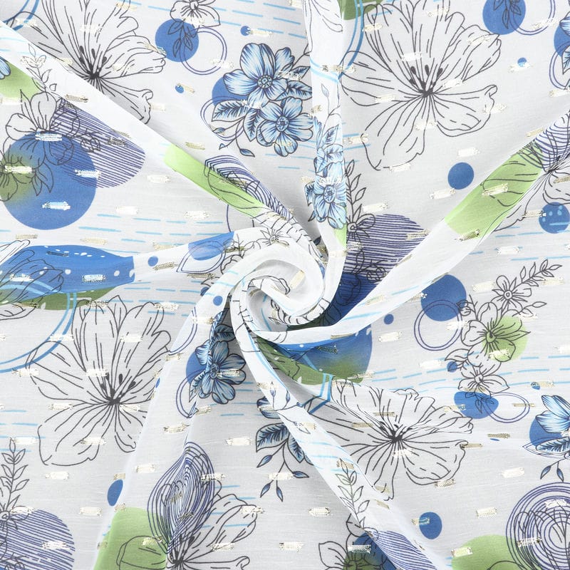 White And Blue Floral Pattern Digital Print Chiffon Fabric with Golden Zari Dobby