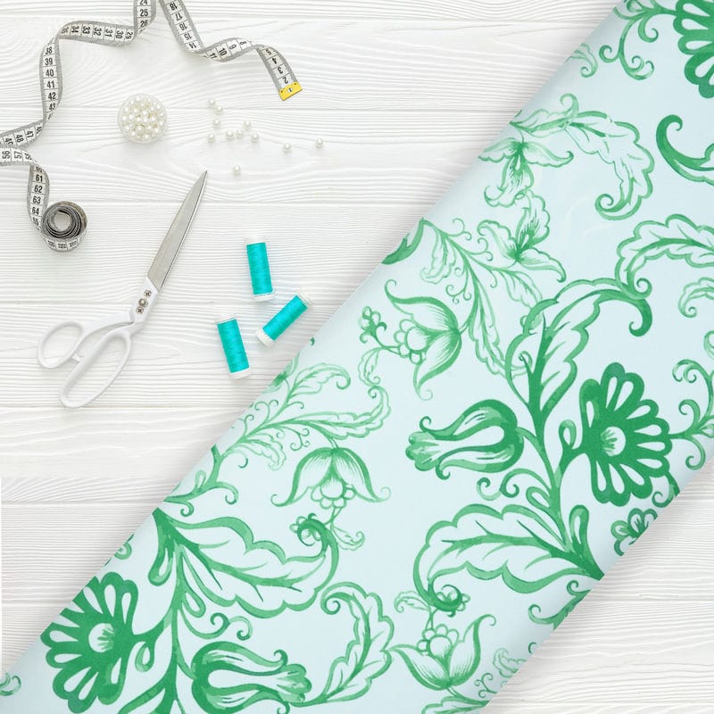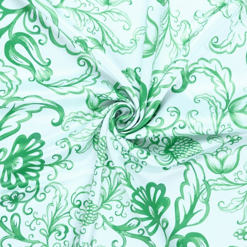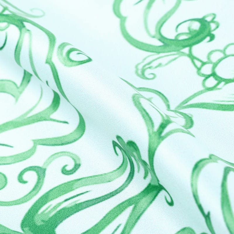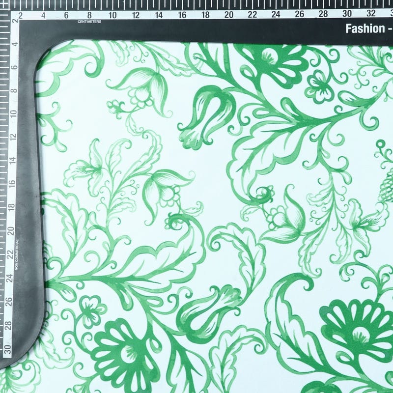 White And Green Floral Pattern Digital Print Silk Satin Fabric