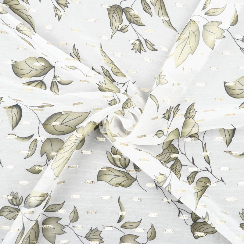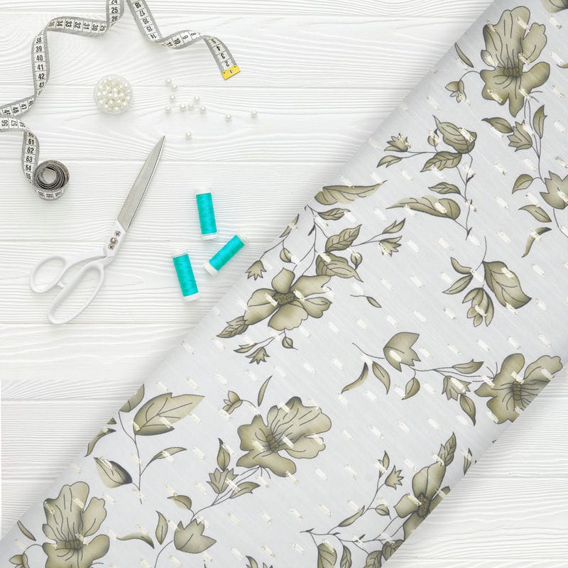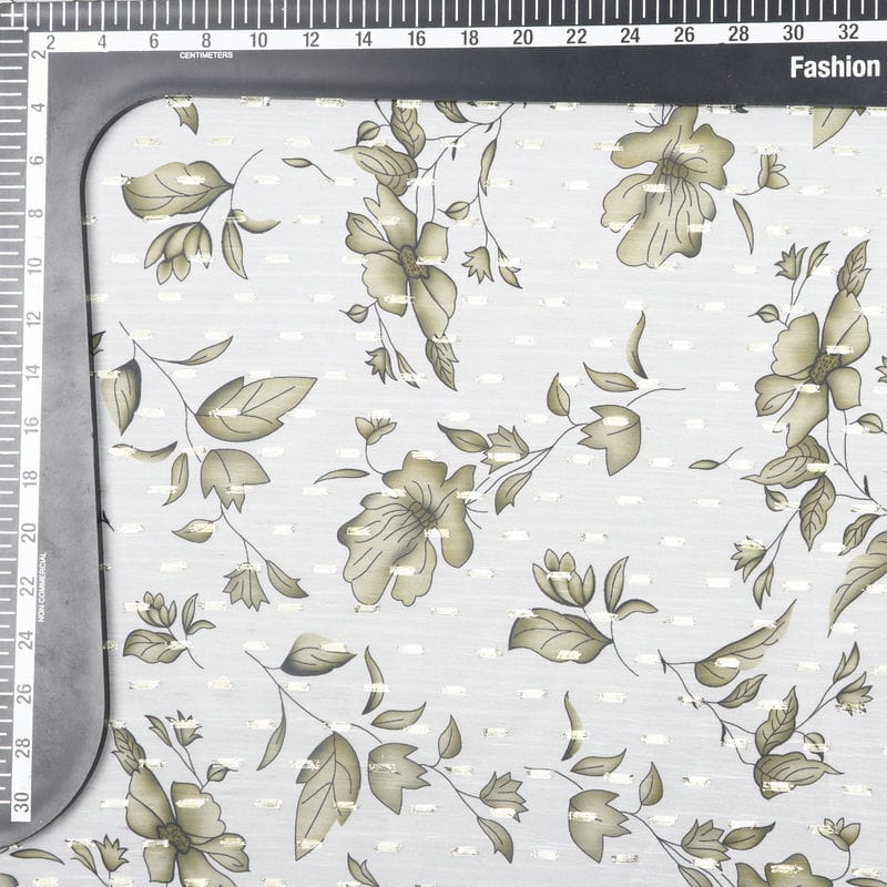 White And Olive Green Floral Pattern Digital Print Chiffon Fabric with Golden Zari Dobby