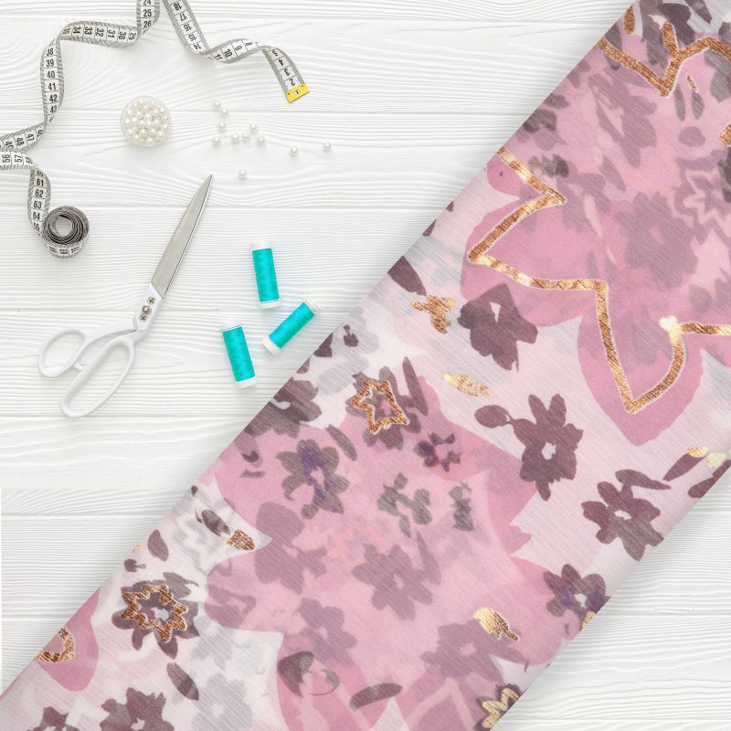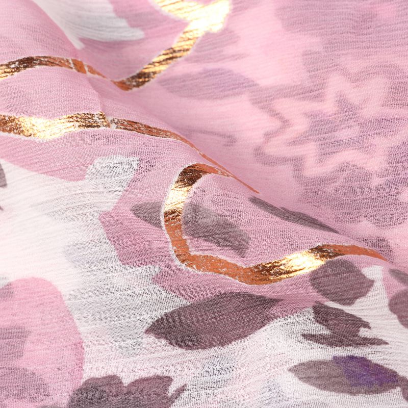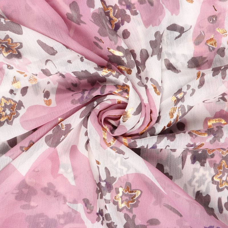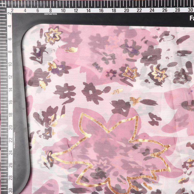 White And Baby Pink Floral Pattern Screen Print Golden Foil Chiffon Fabric