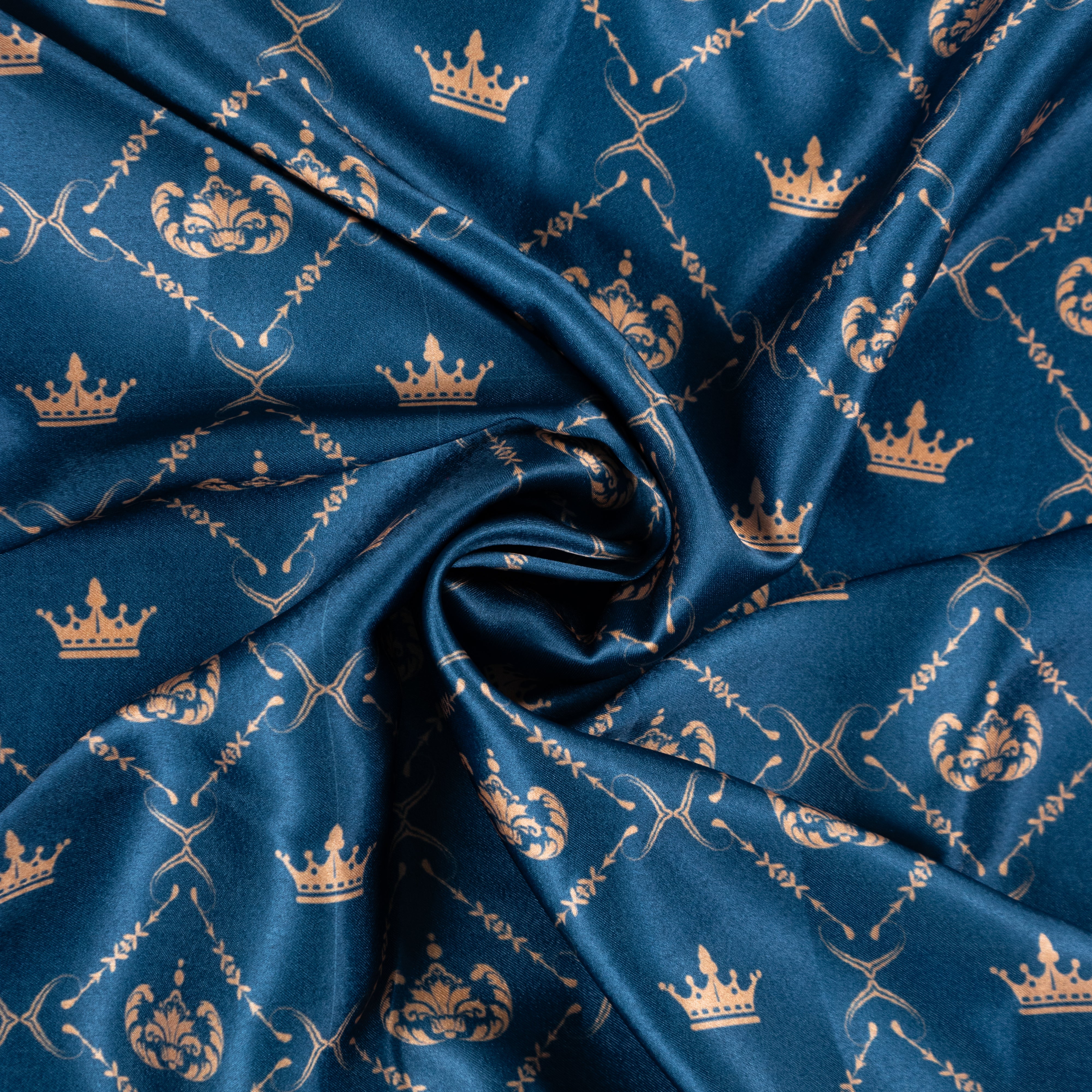 Blue And Gold Color Crown Pattern Digital Print Japan Satin Fabric