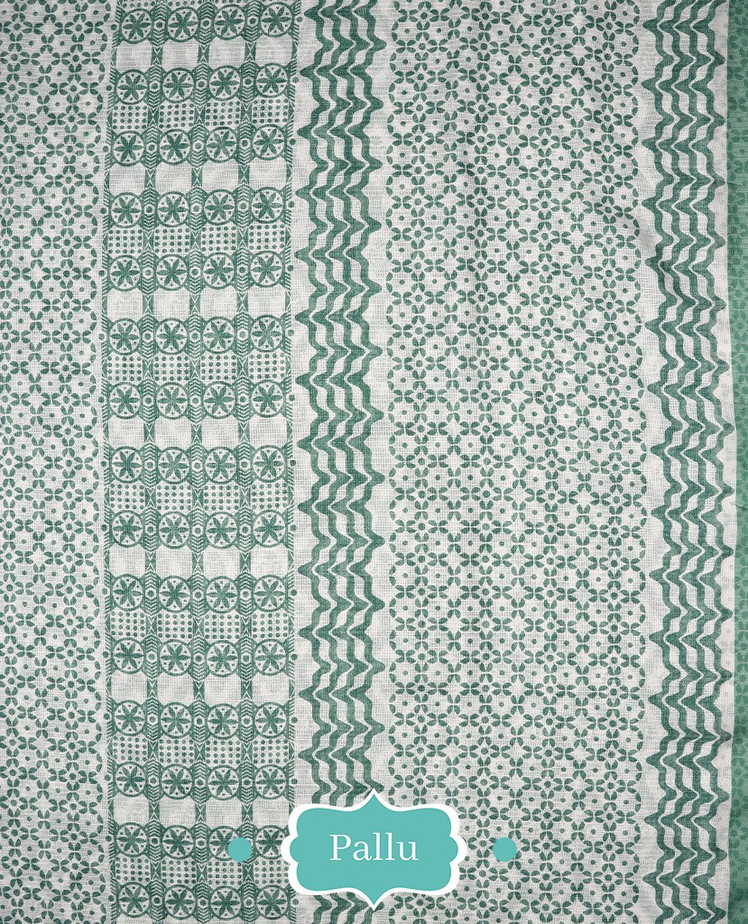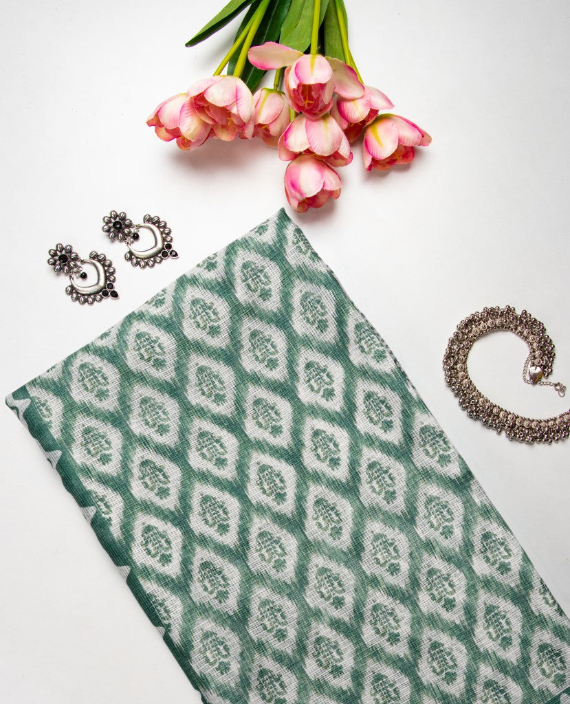 Green And White Trellis Pattern Digital Print Kota Doria Saree With Blouse
