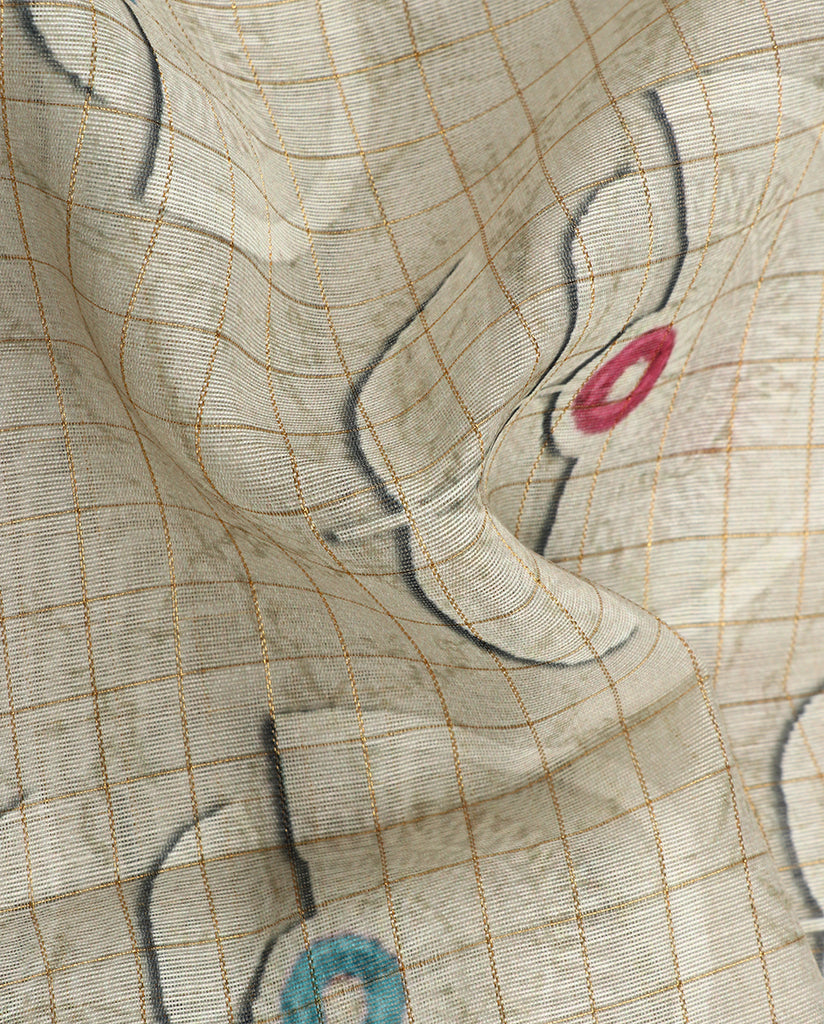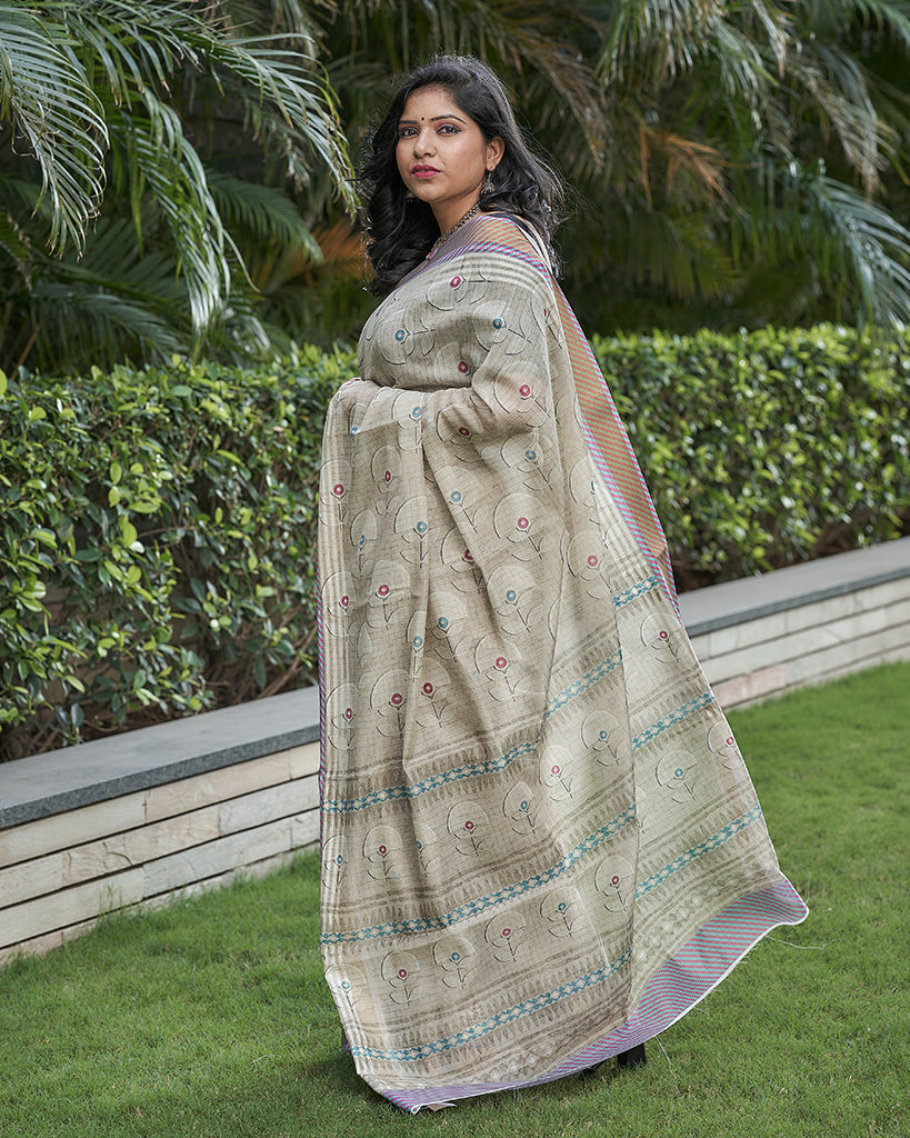 Sage Green And Beige Floral Pattern Digital Print Chanderi Lurex Saree With Blouse