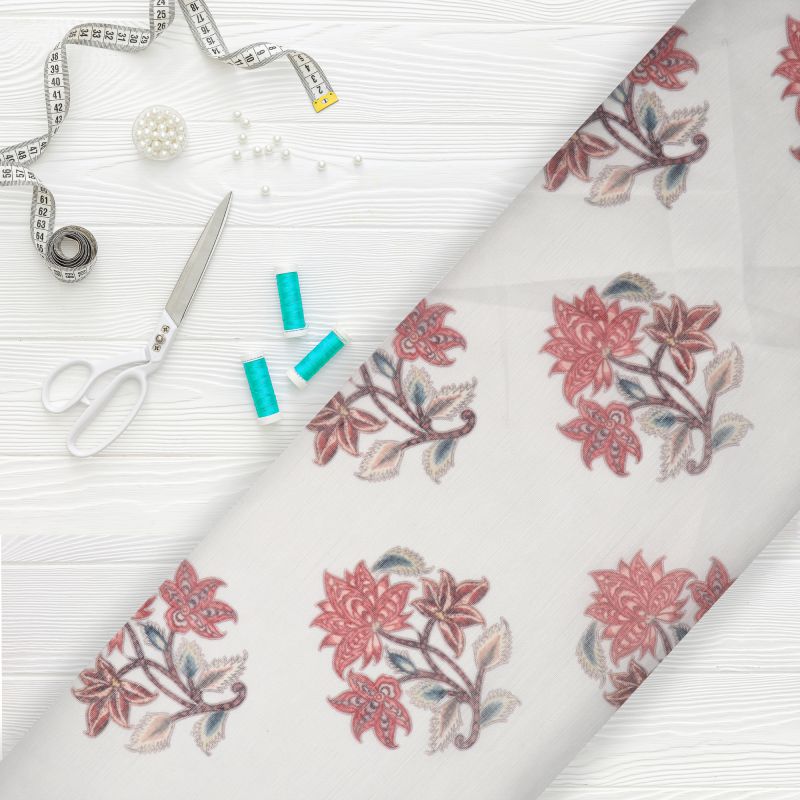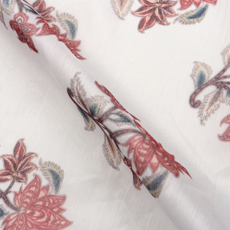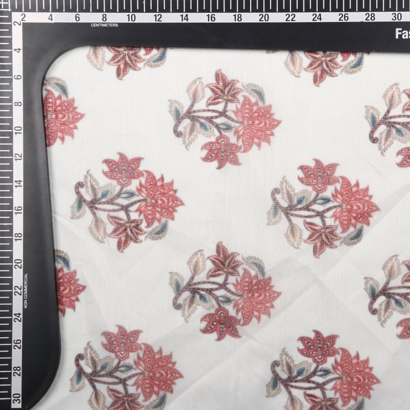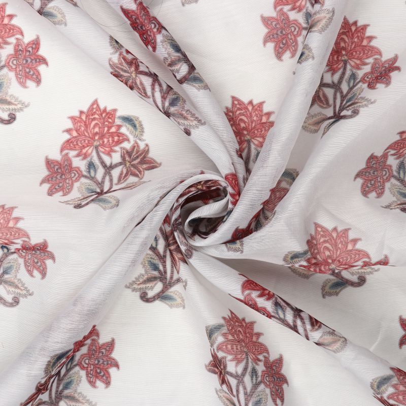 White And Red Floral Pattern Digital Print Chanderi Fabric