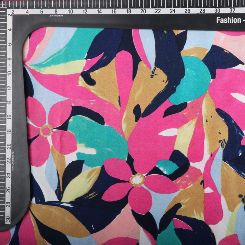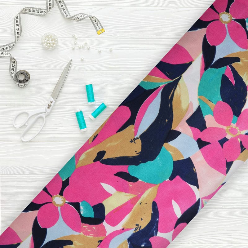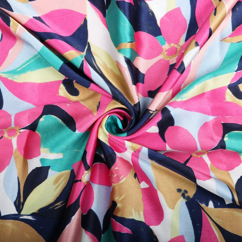 Pink And Navy Blue Floral Pattern Screen Print Japan Satin Fabric (Bulk)