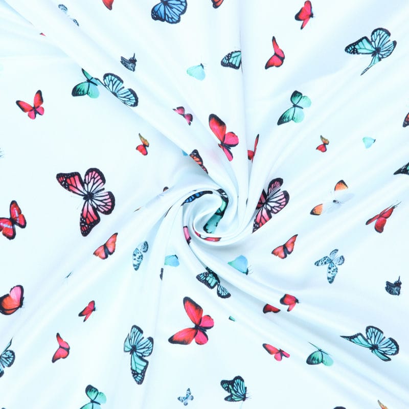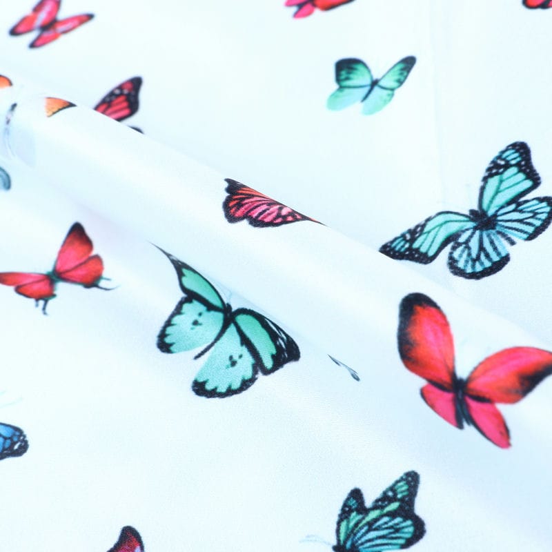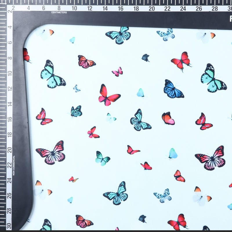 Sky Blue And Red Butterfly Pattern Digital Print Silk Satin Fabric