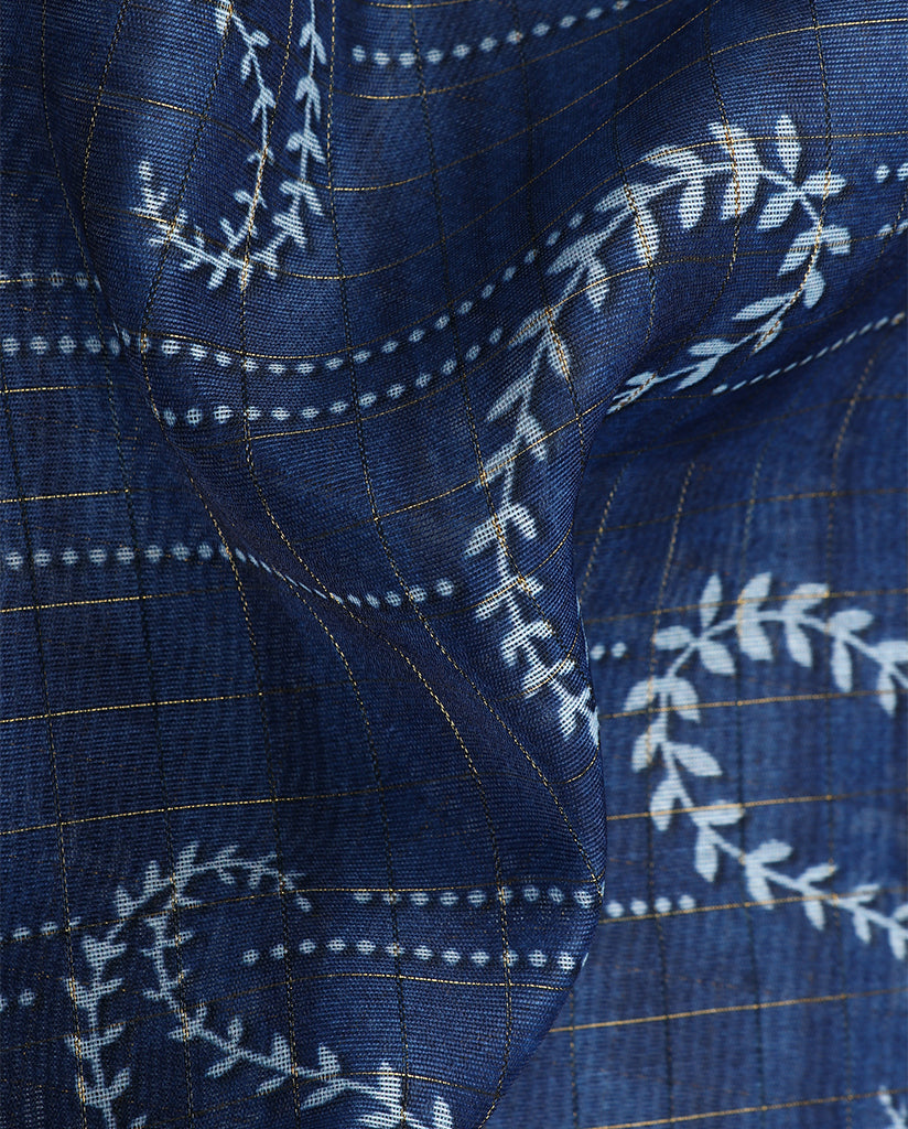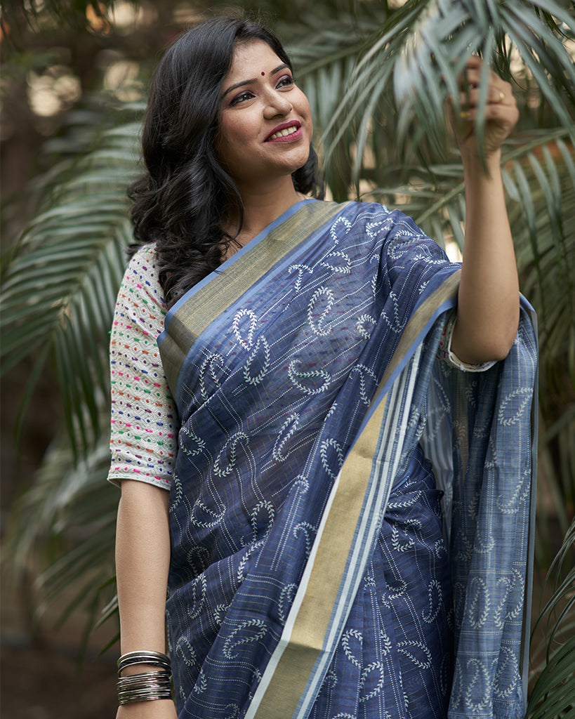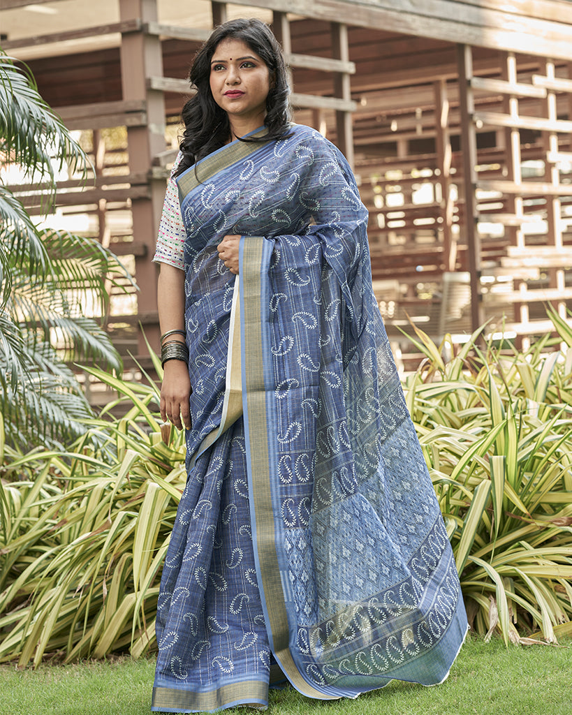 Navy Blue And White Paisley Pattern Digital Print Chanderi Lurex Saree With Blouse