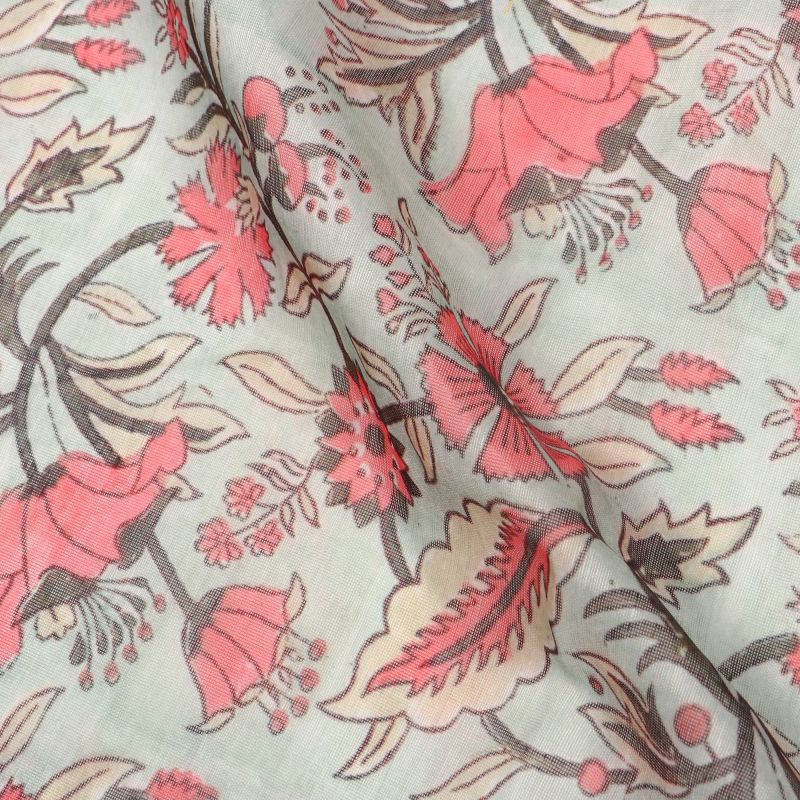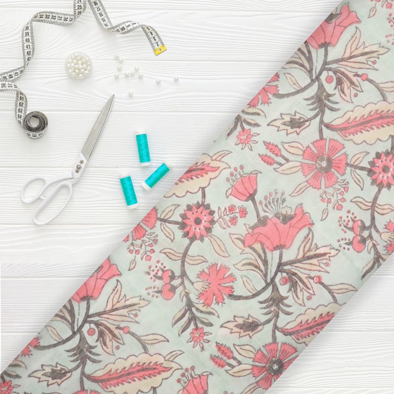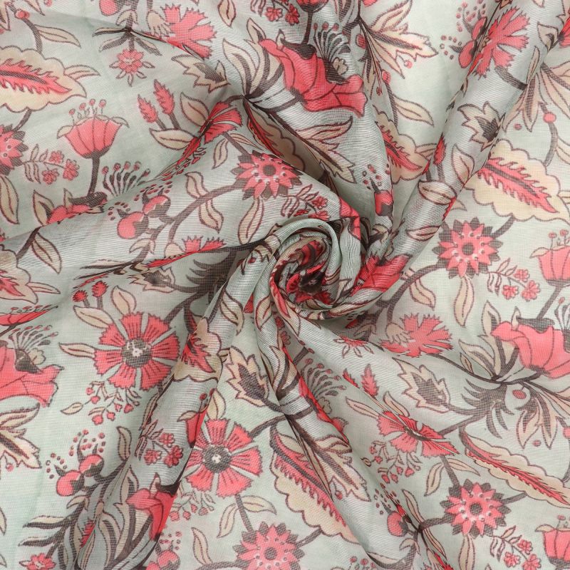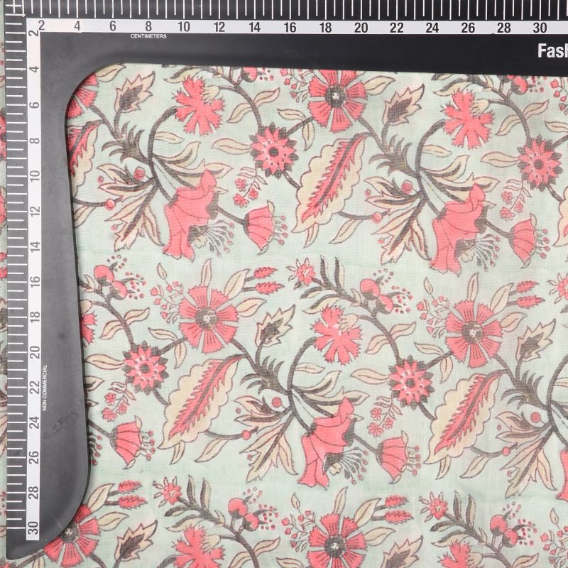 Dusty Mint Green And Salmon Pink Floral Pattern Digital Print Chanderi Fabric