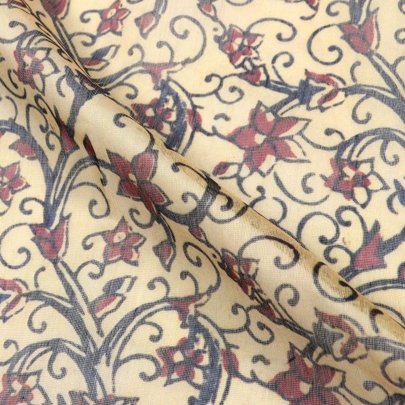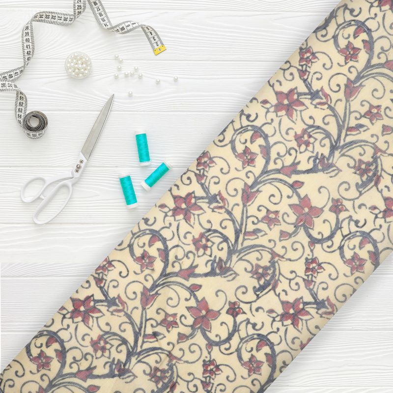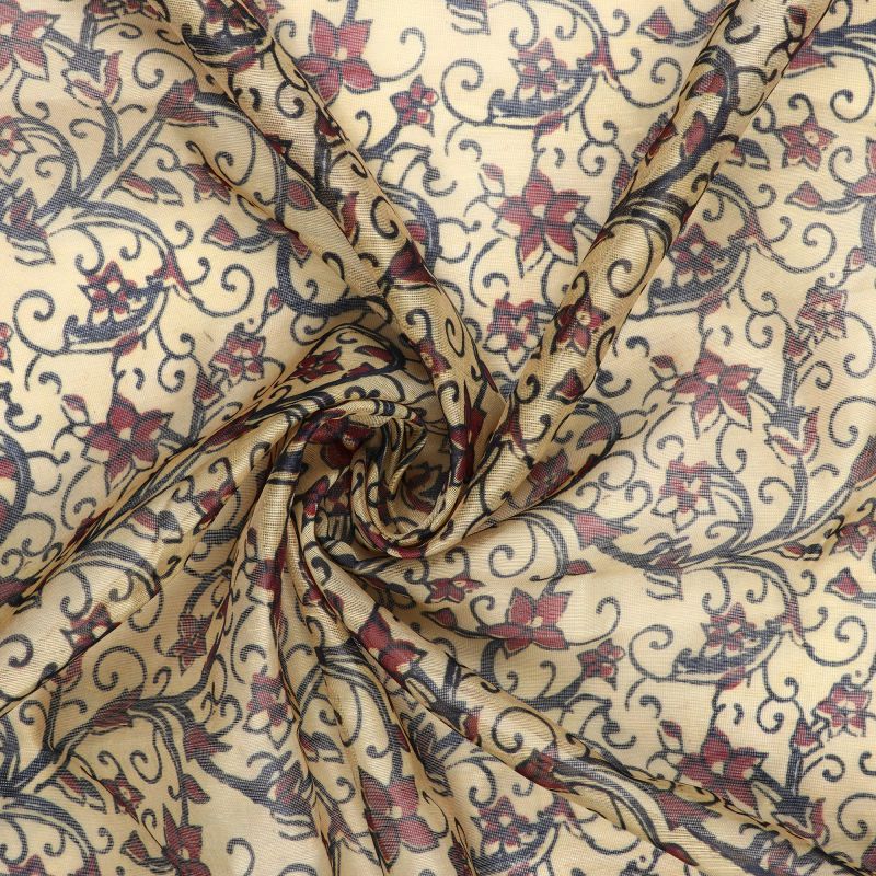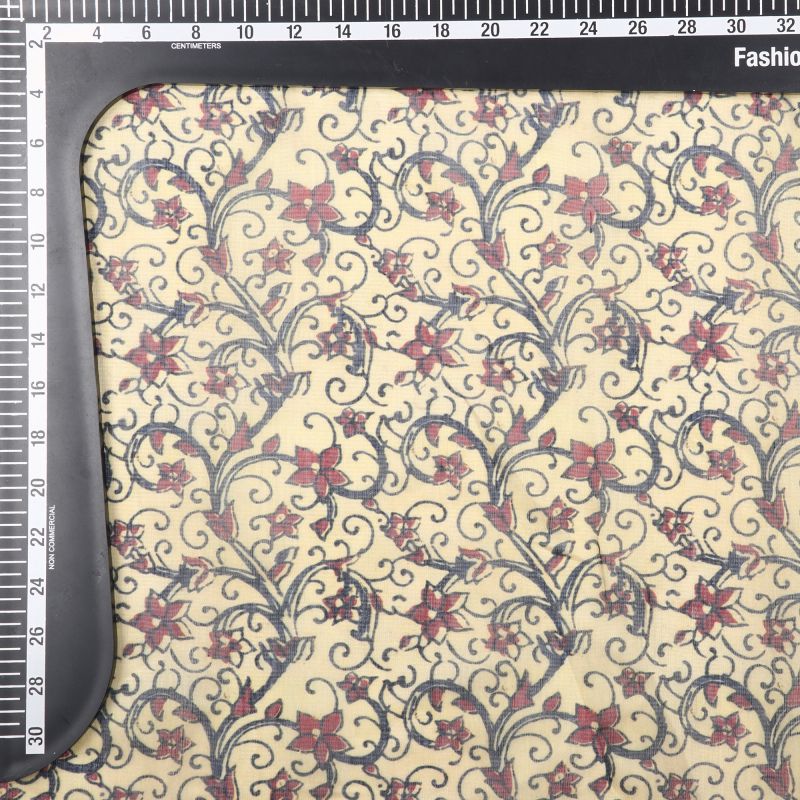 Dusty Yellow And Maroon Floral Pattern Digital Print Chanderi Fabric