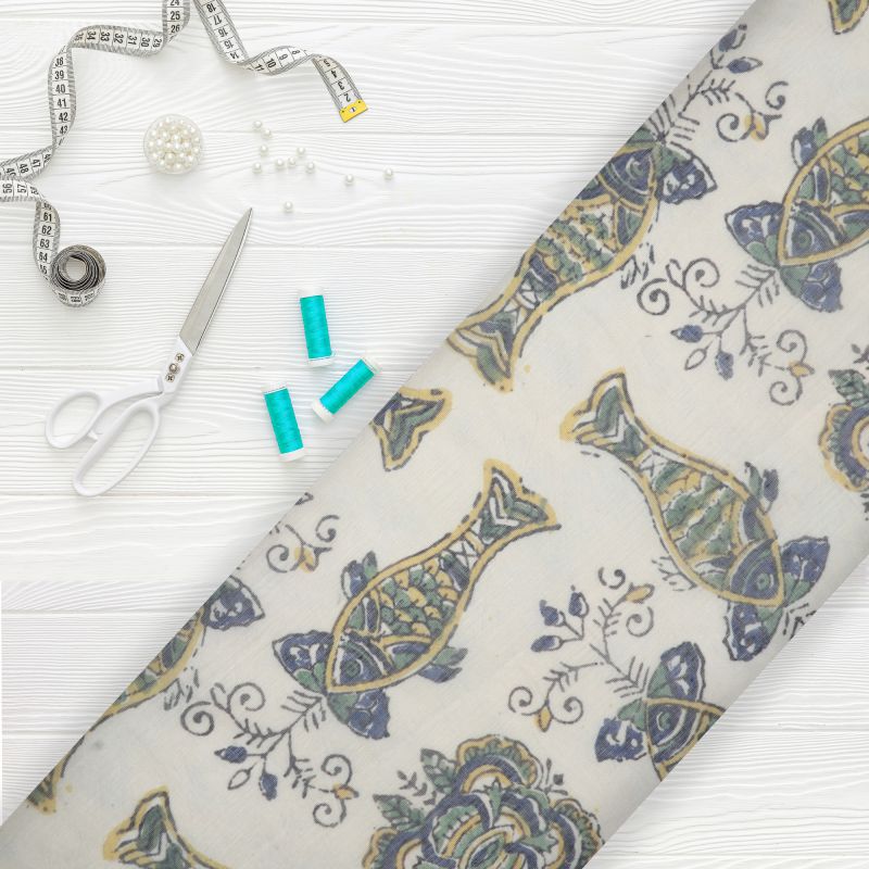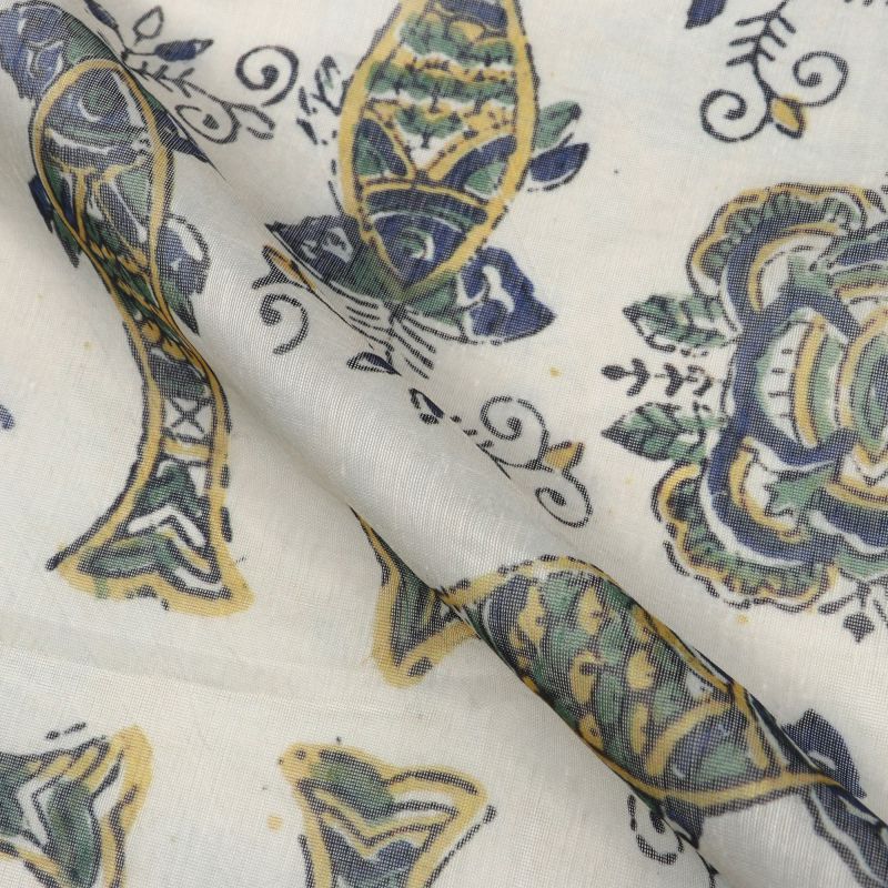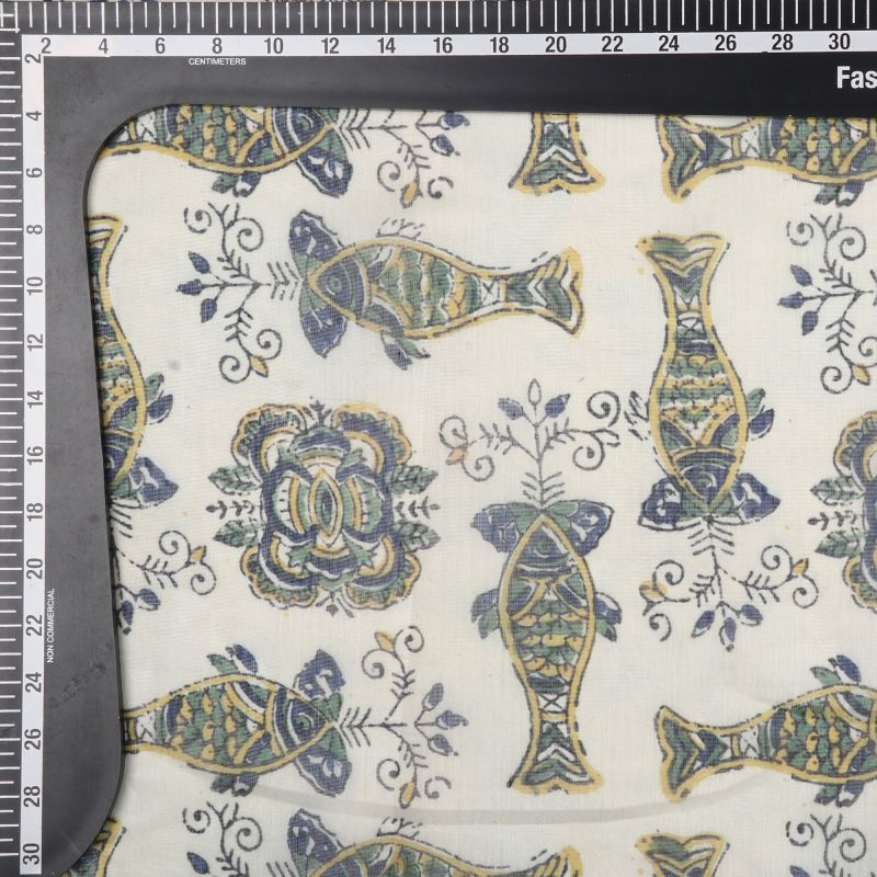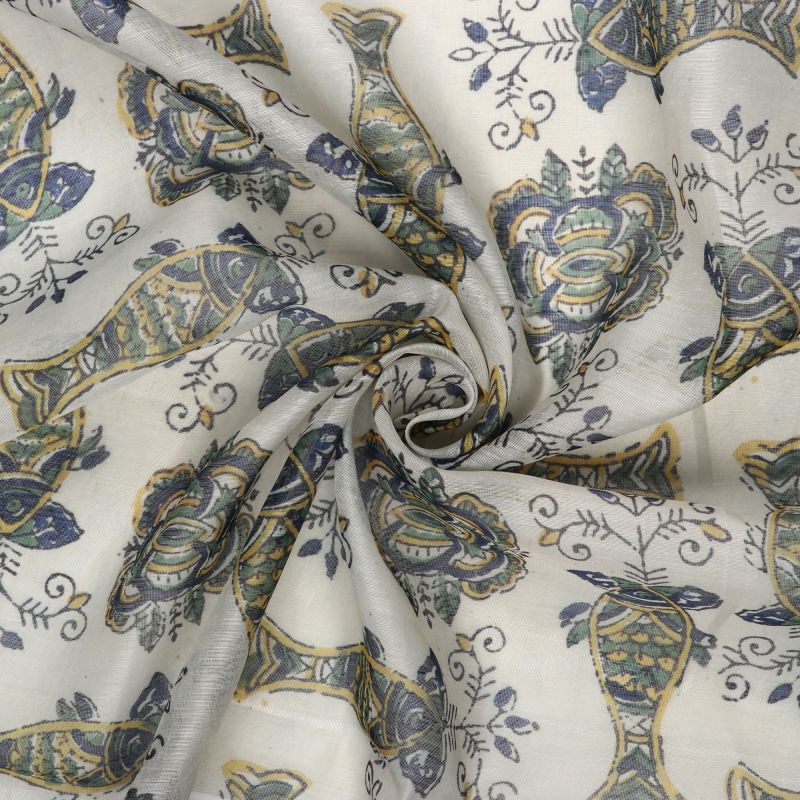 Ivory And Dusty Green Geometric Pattern Digital Print Chanderi Fabric