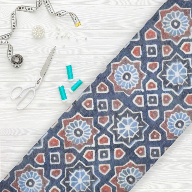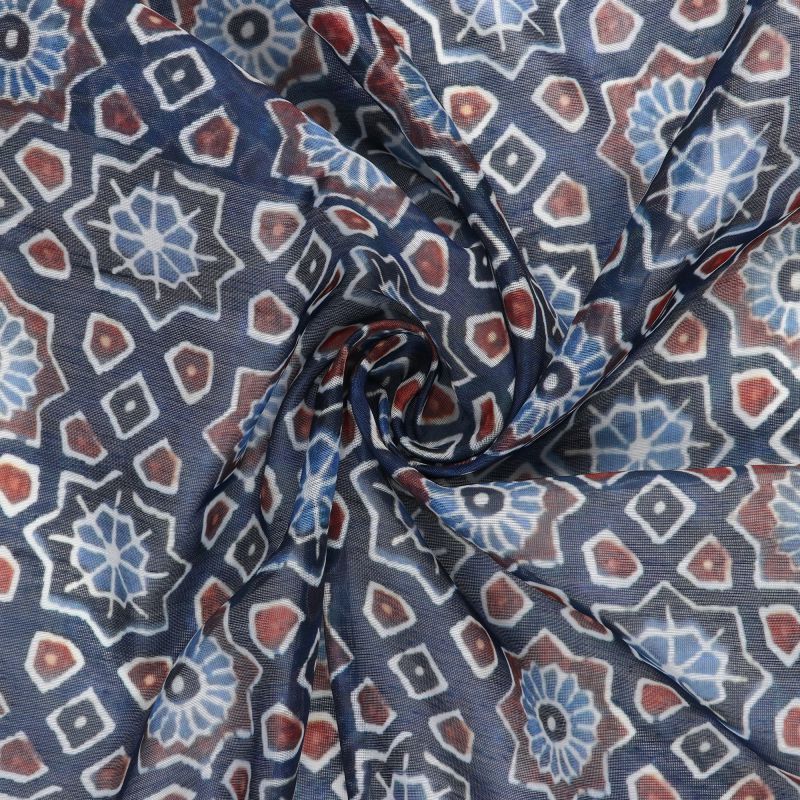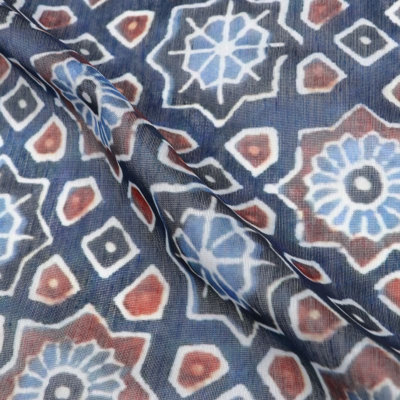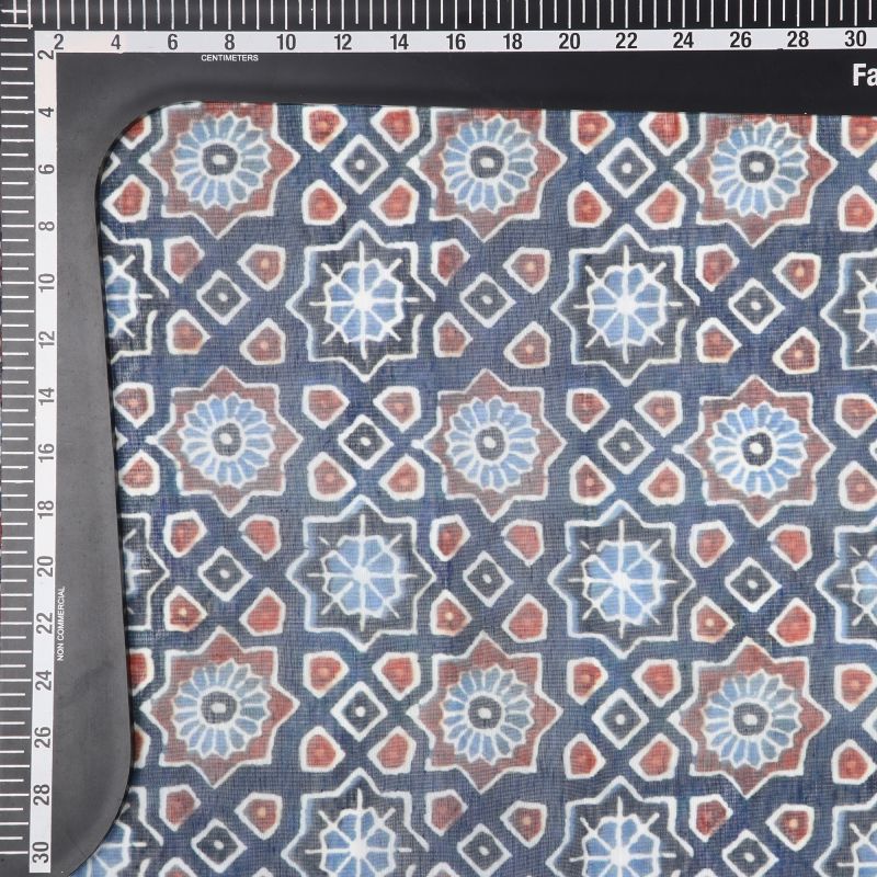 Navy Blue And Red Traditional Pattern Digital Print Chanderi Fabric