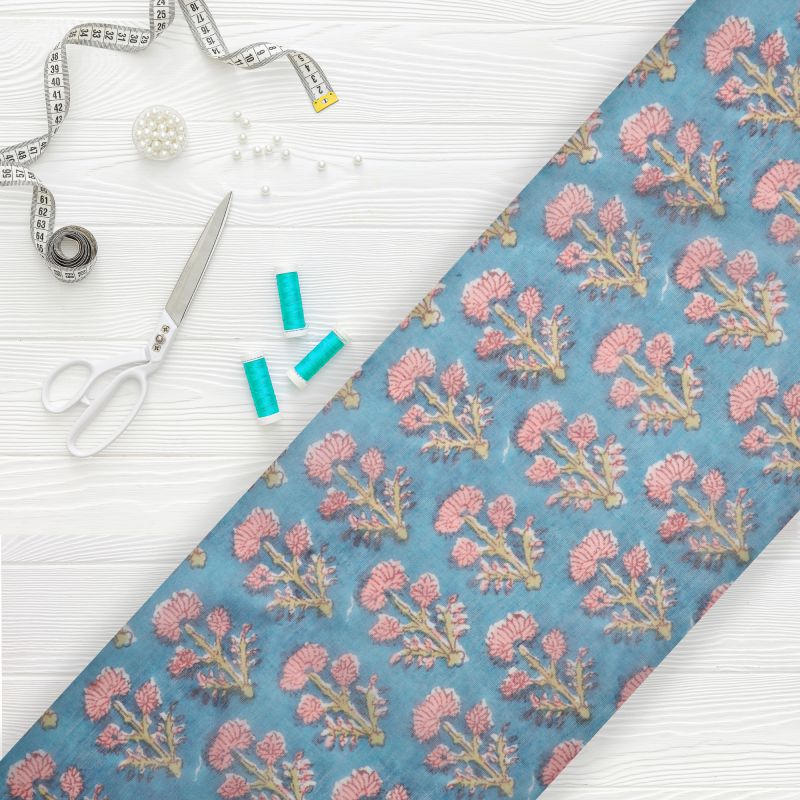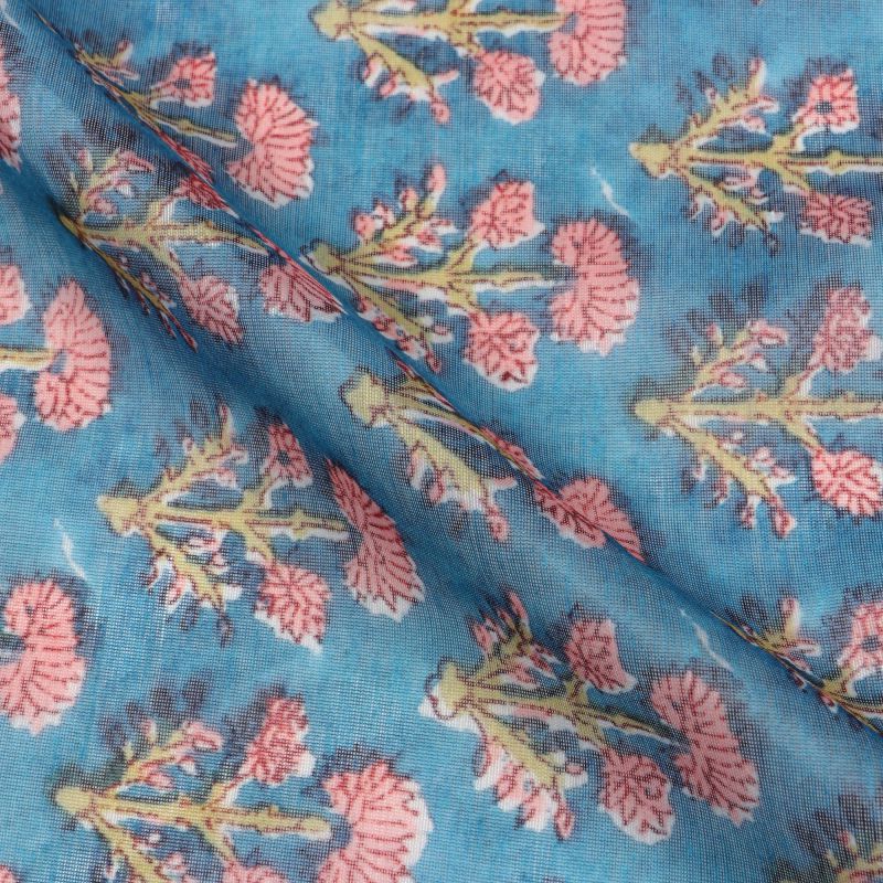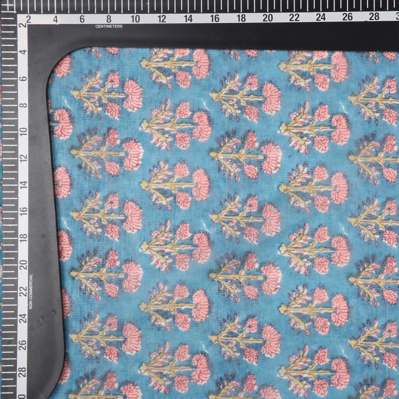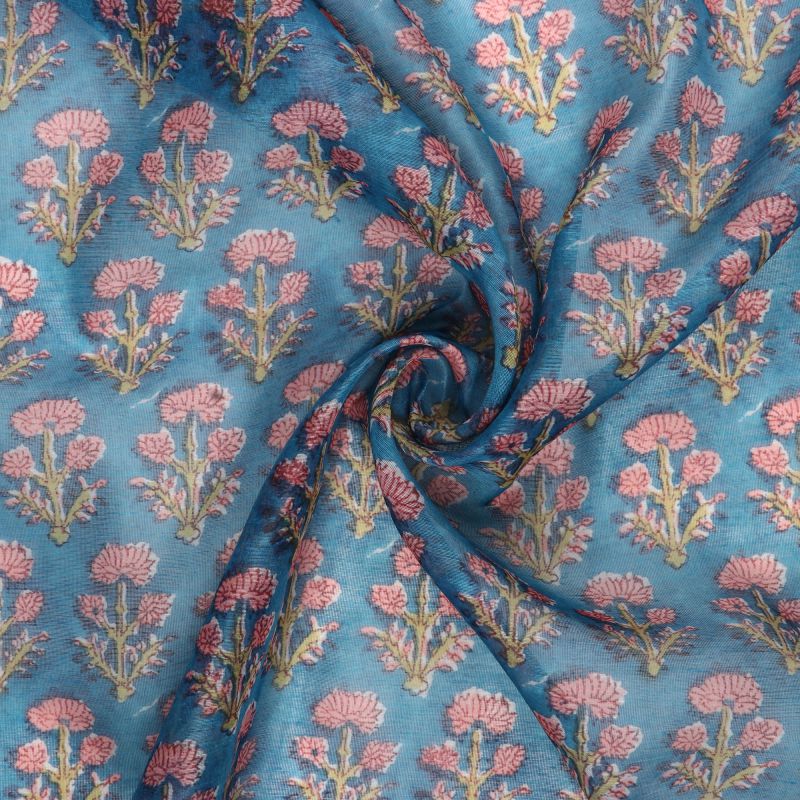 Ocen Blue And Pink Floral Pattern Digital Print Chanderi Fabric
