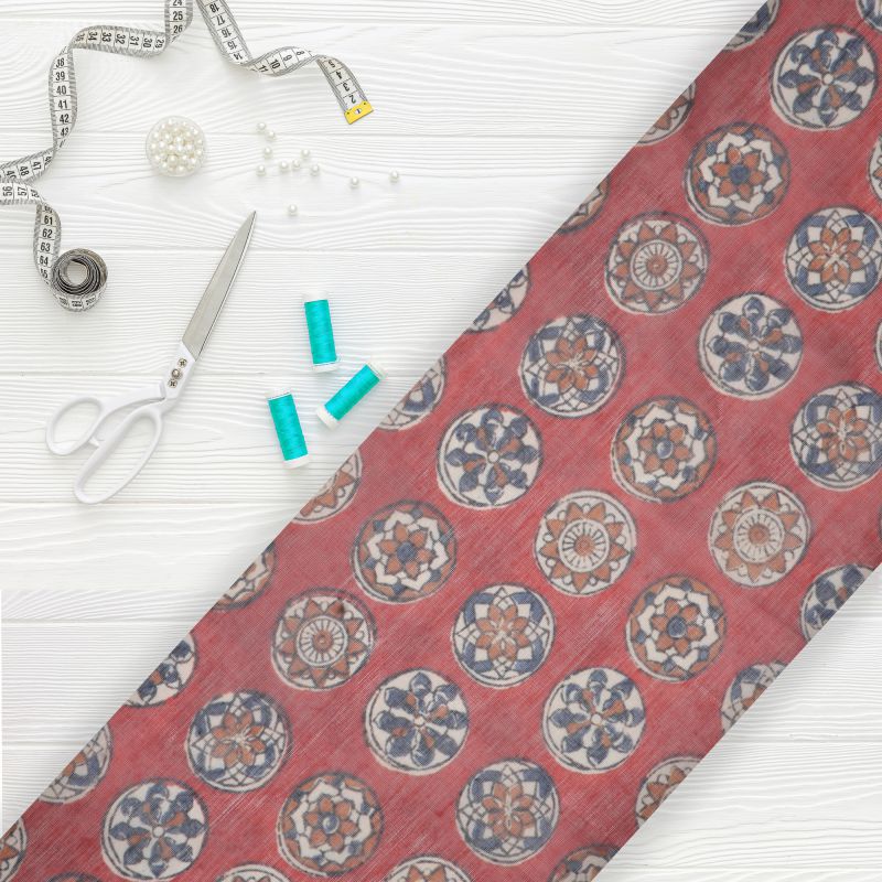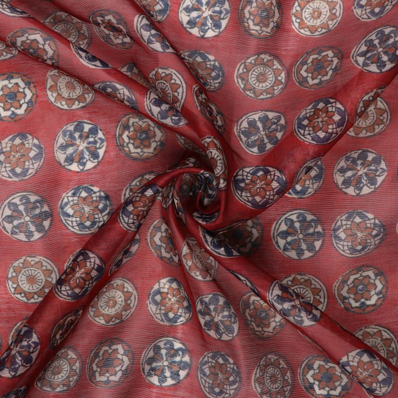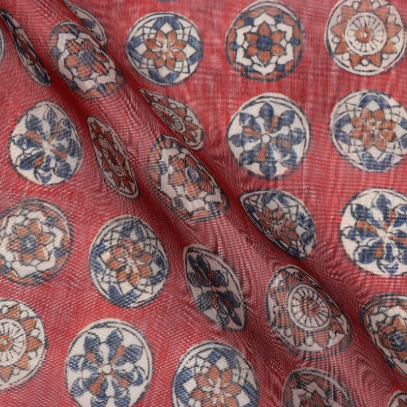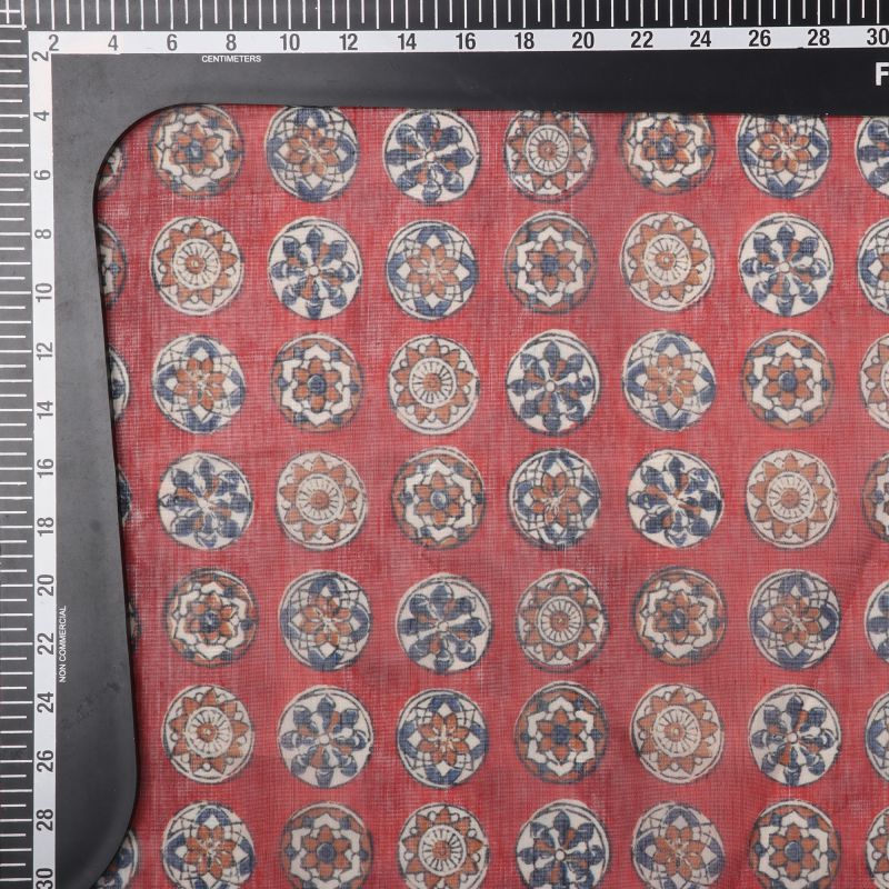 Red And Dark Blue Geometric Pattern Digital Print Chanderi Fabric