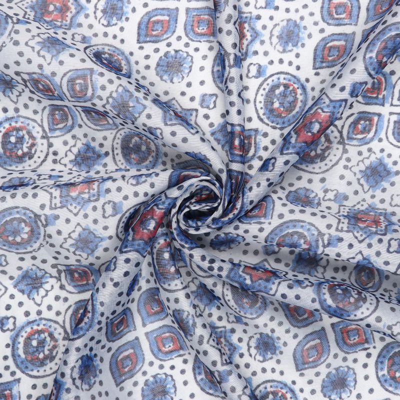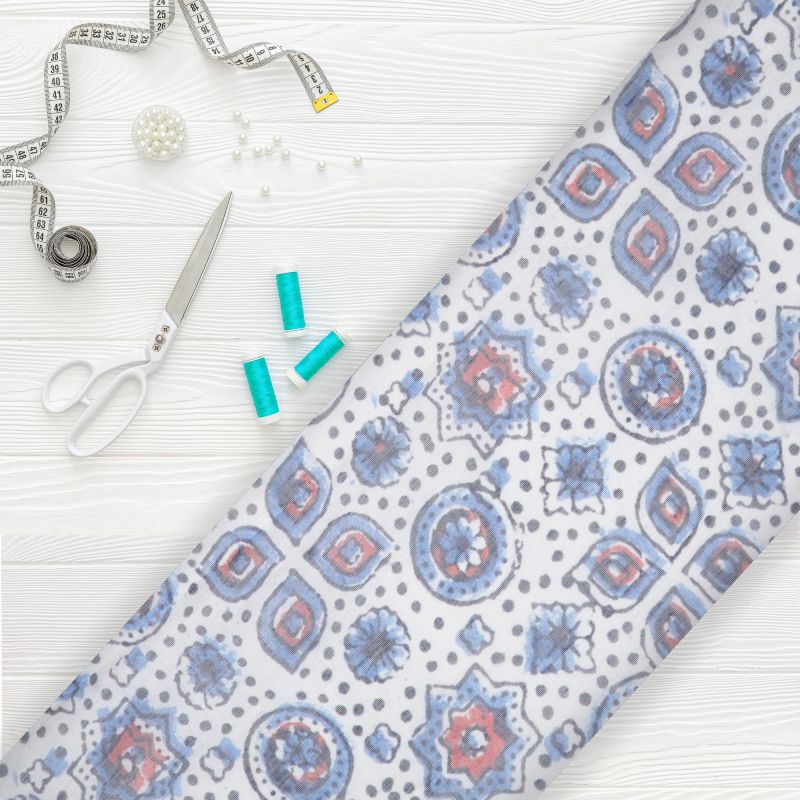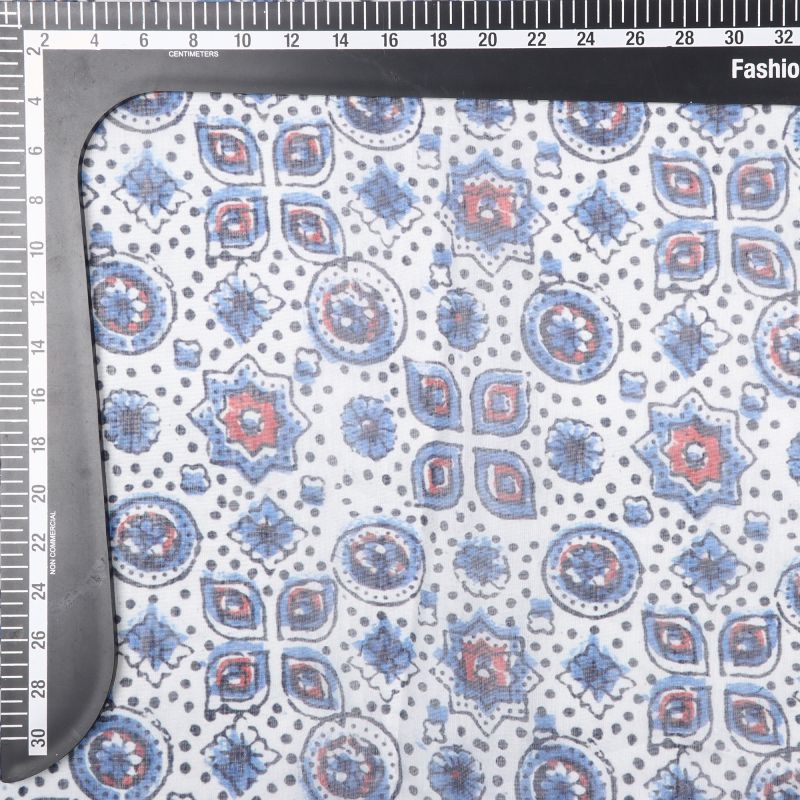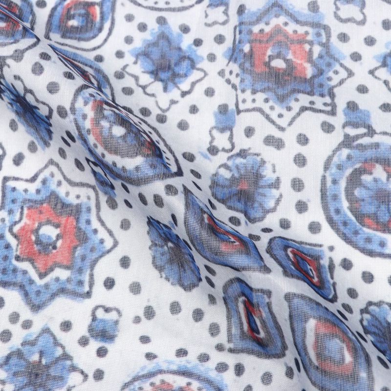 White And Blue Traditional Pattern Digital Print Chanderi Fabric