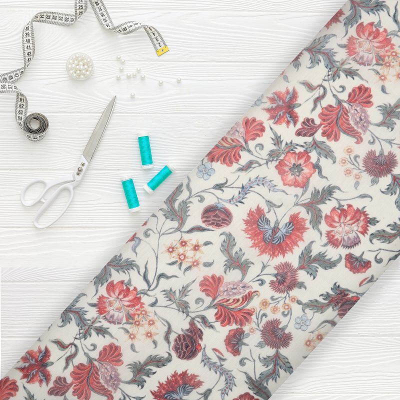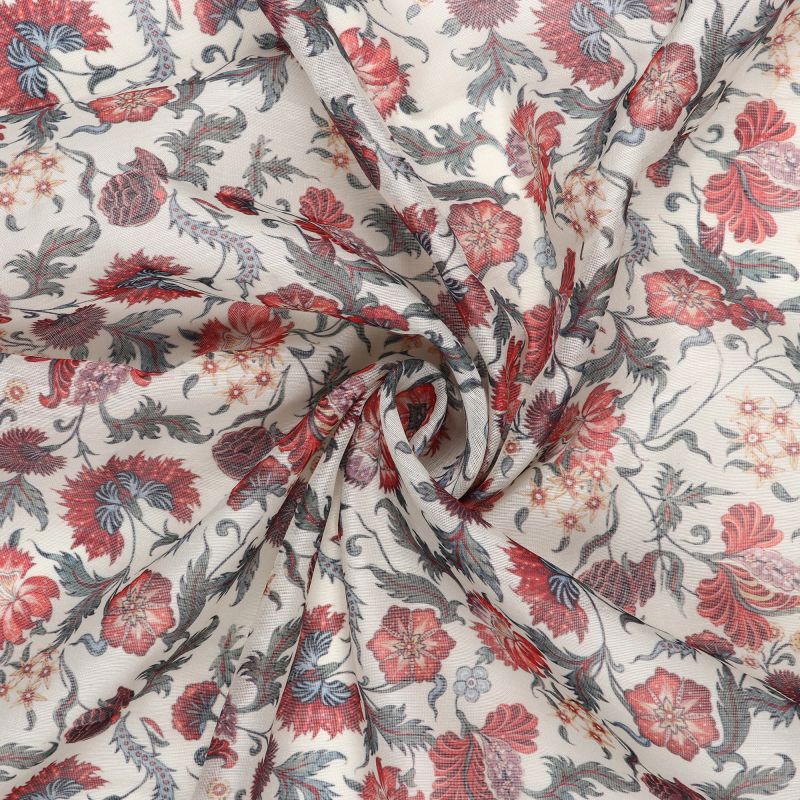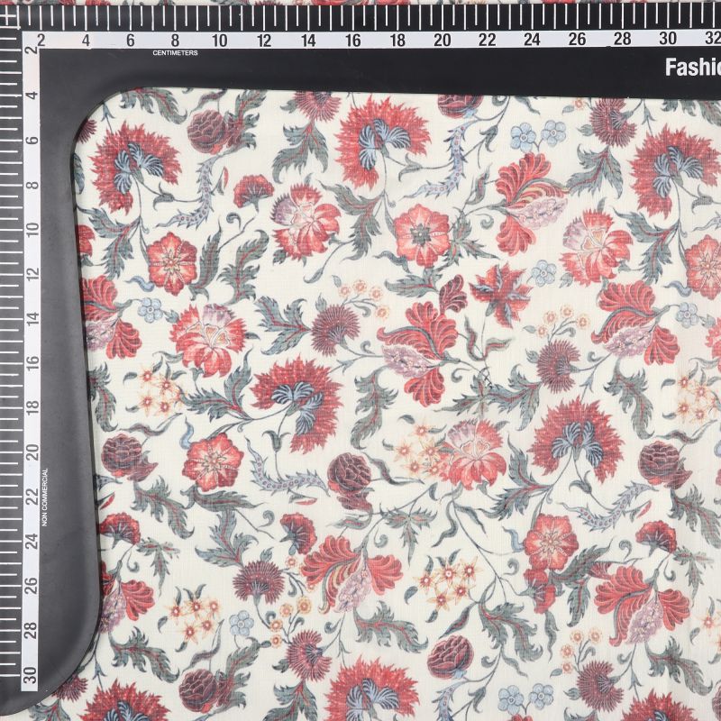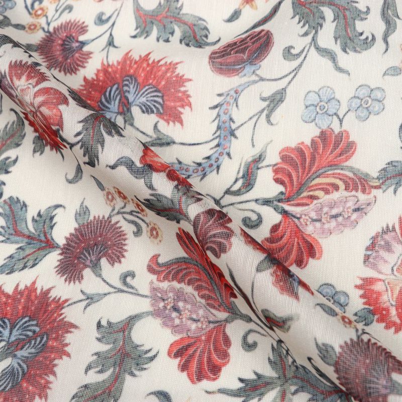 White And Red Floral Pattern Digital Print Chanderi Fabric