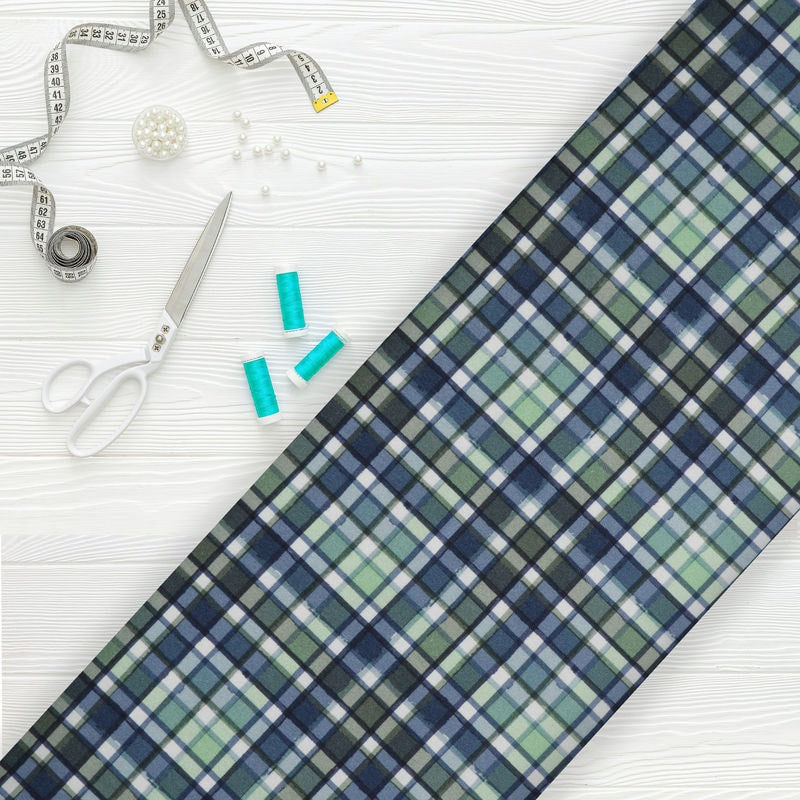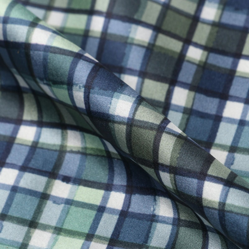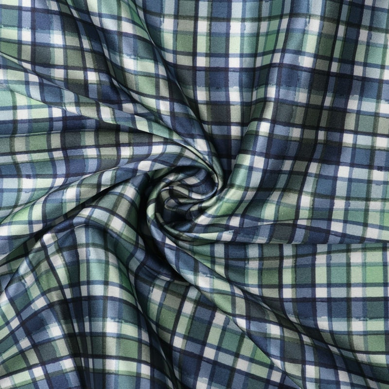 Green And Greyish Blue Checks Pattern Digital Print Japan Satin Fabric