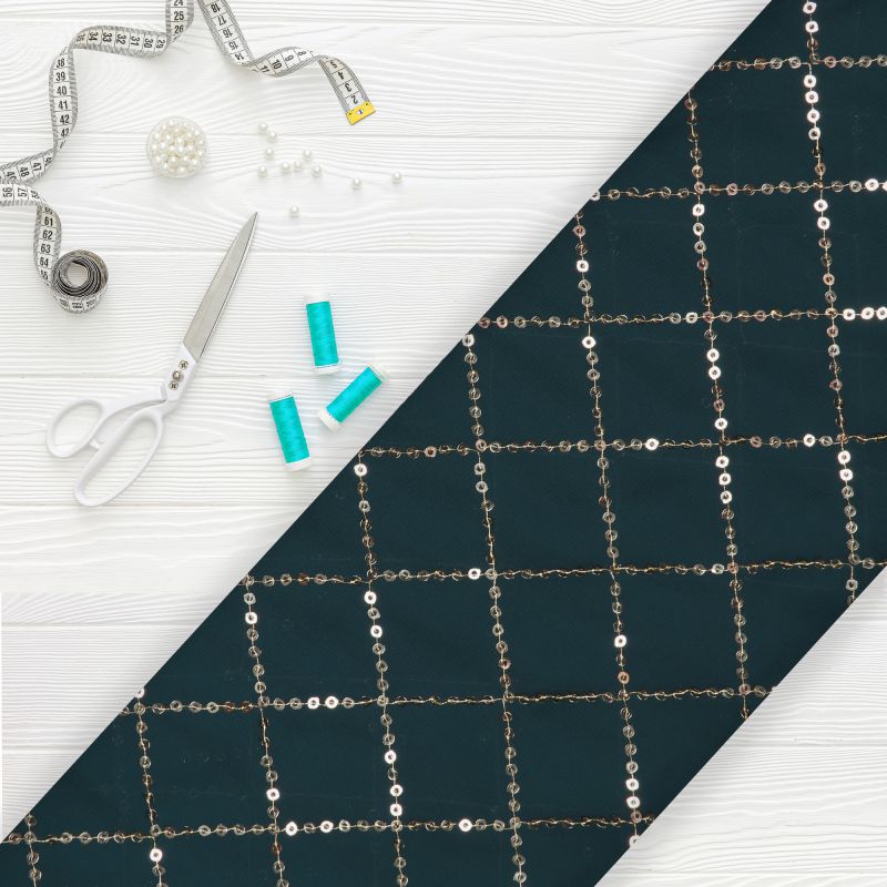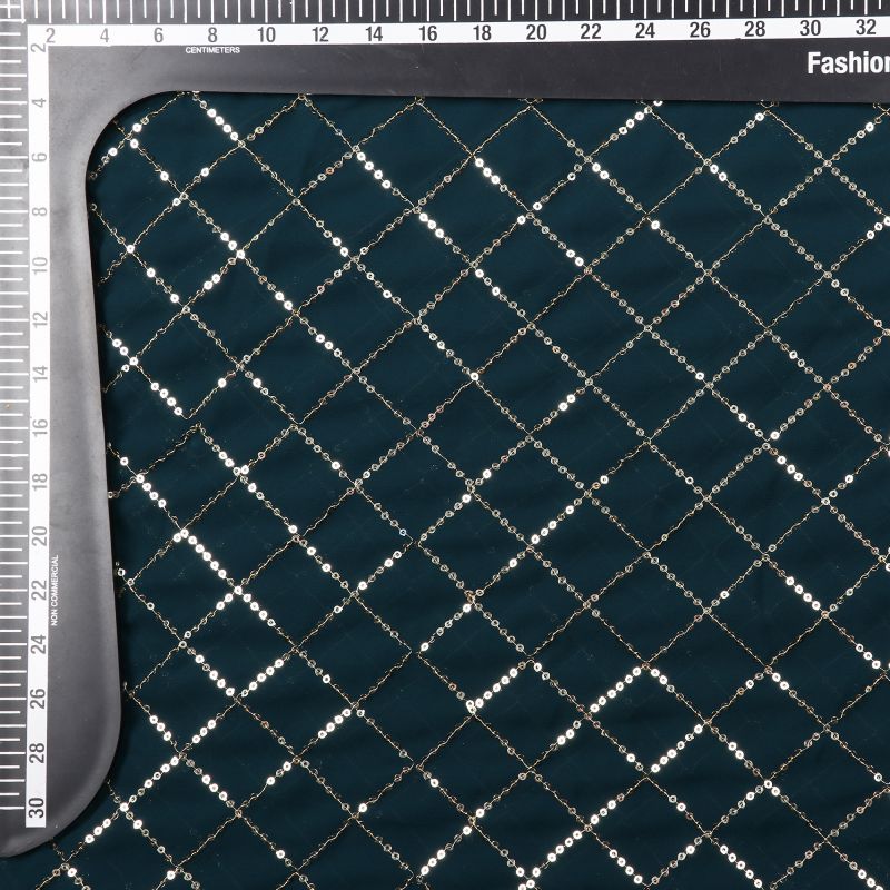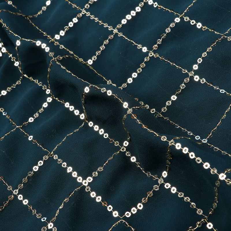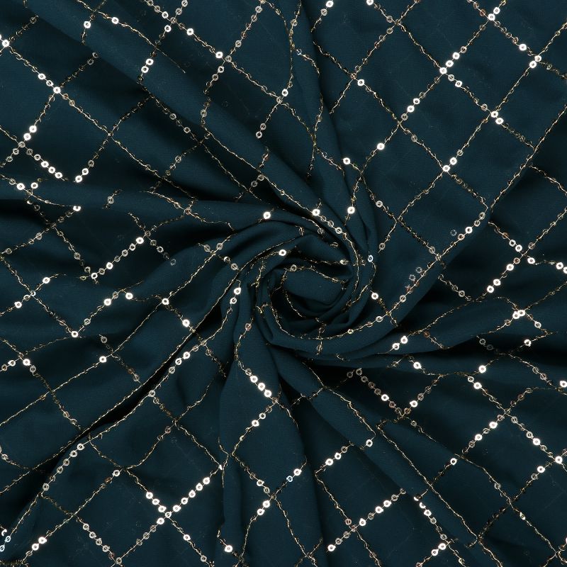 Prussian Blue Checks Pattern Sequins Embroidery Georgette Fabric