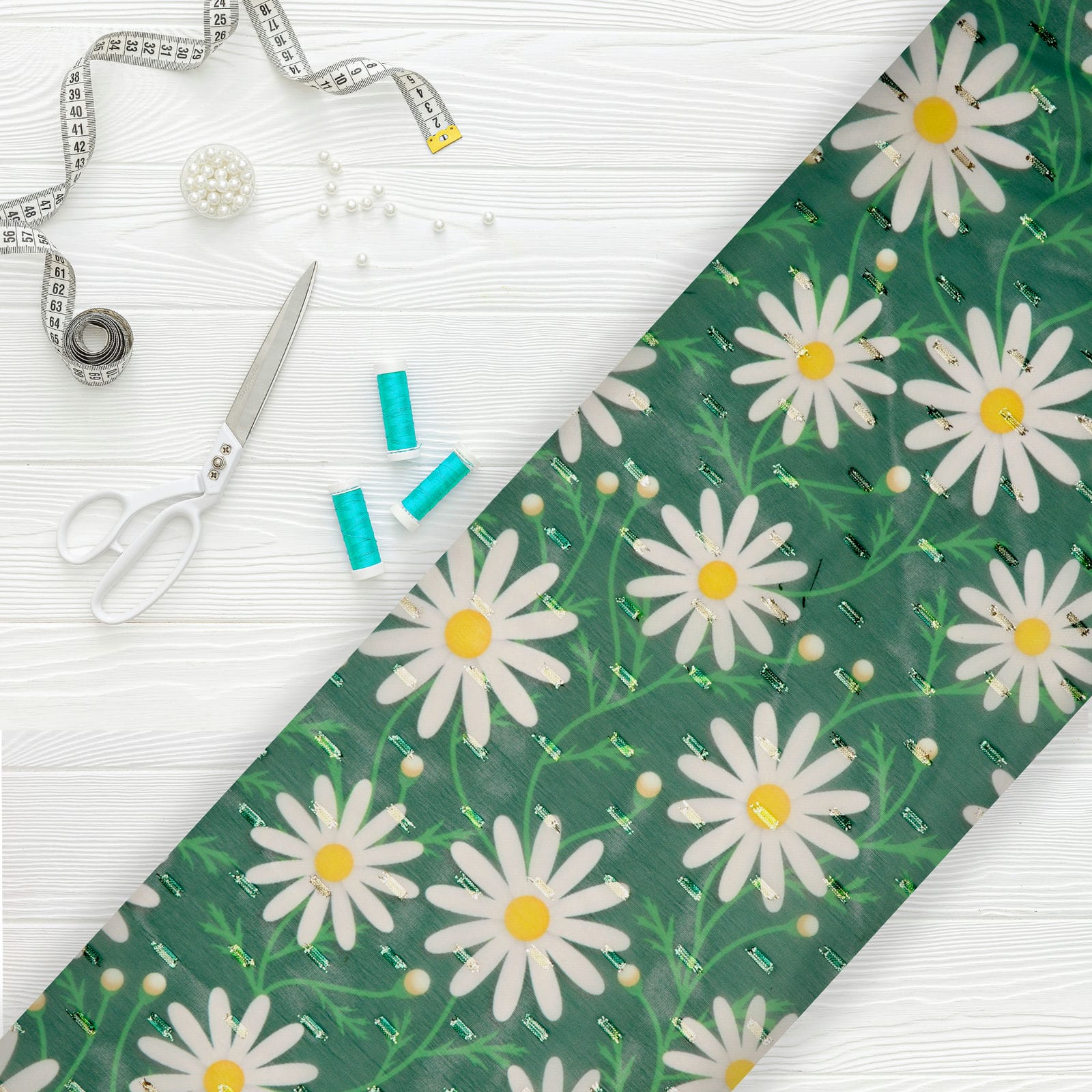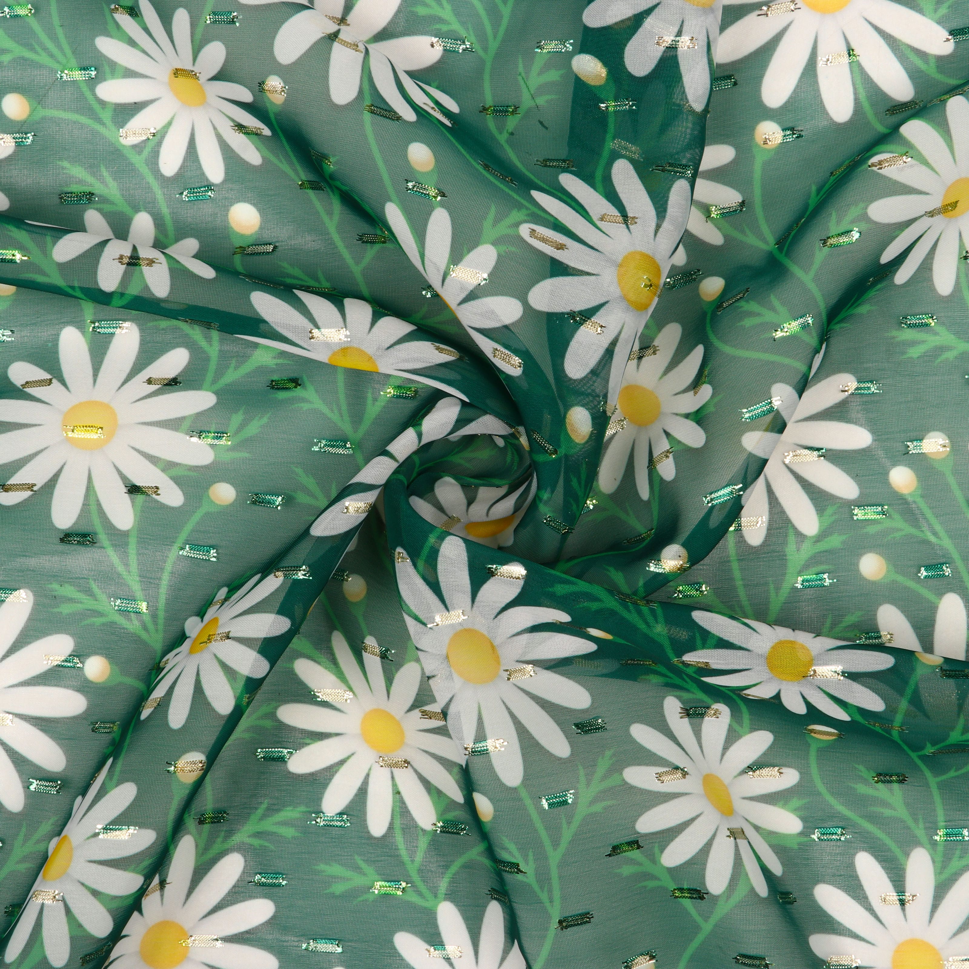 Basil Green and White Floral Pattern Digital Print Chiffon Fabric with Golden Zari Dobby