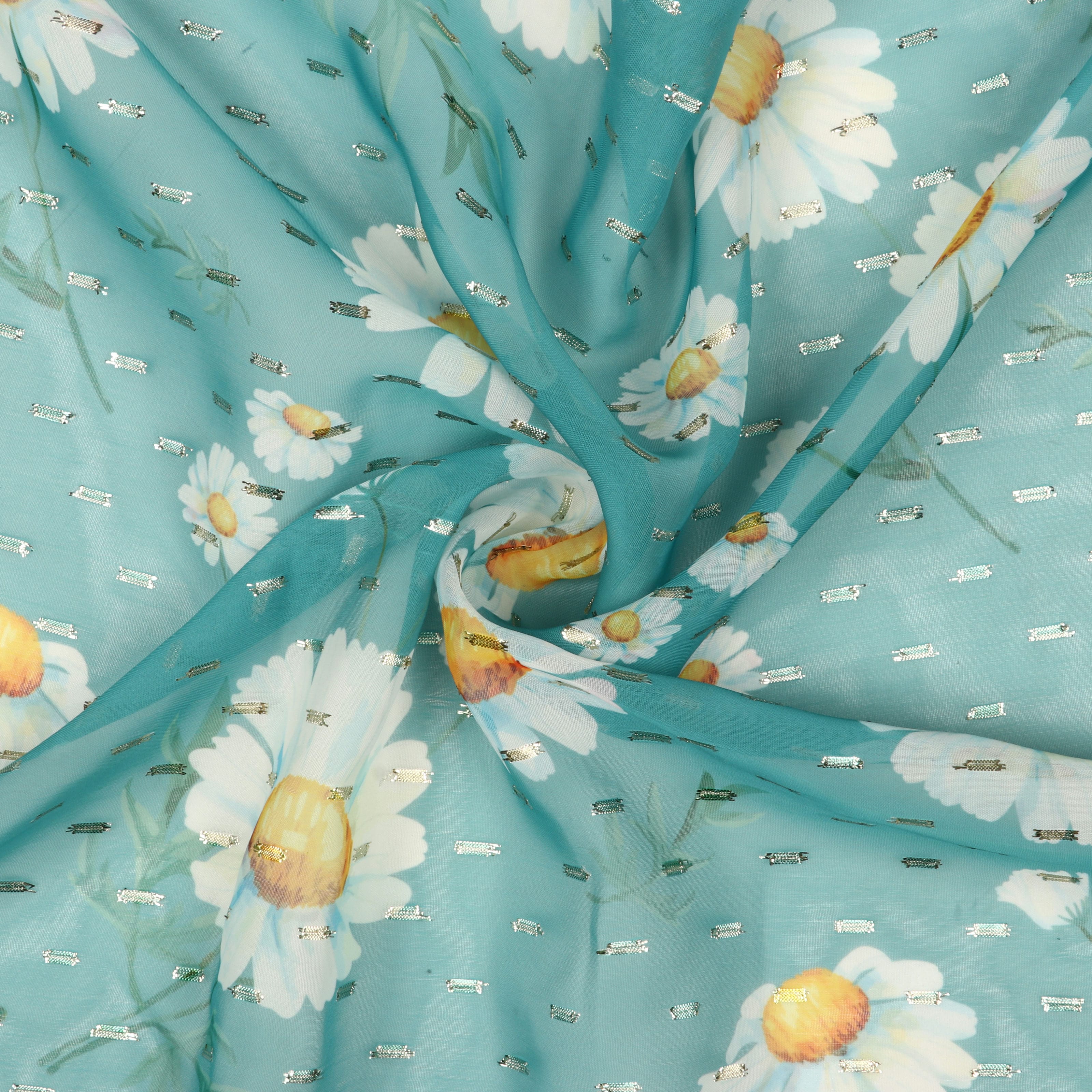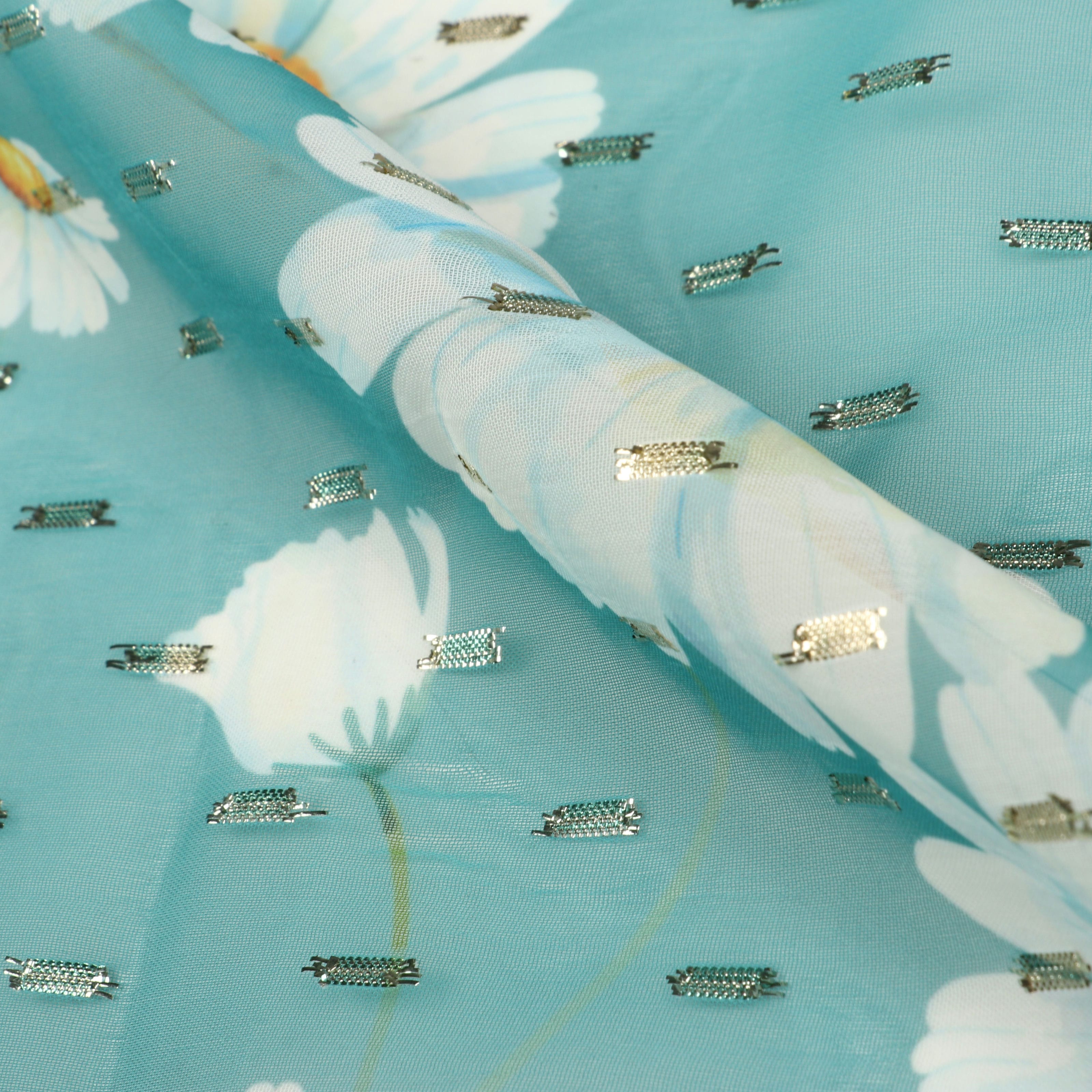 Greyish Turquoise and White Floral Pattern Digital Print Chiffon Fabric with Golden Zari Dobby