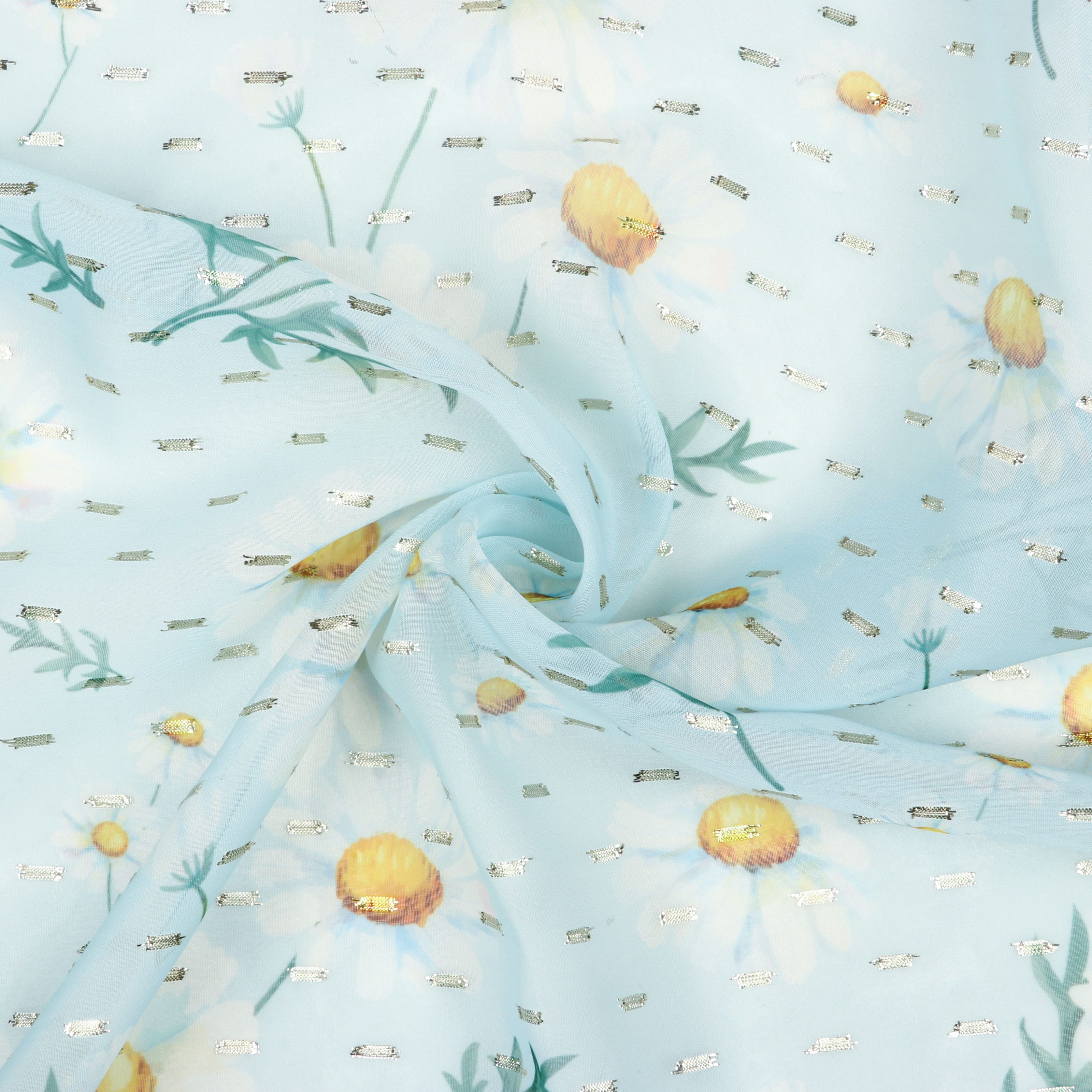 Light Pastel Blue and Yellow Floral Pattern Digital Print Chiffon Fabric with Golden Zari Dobby
