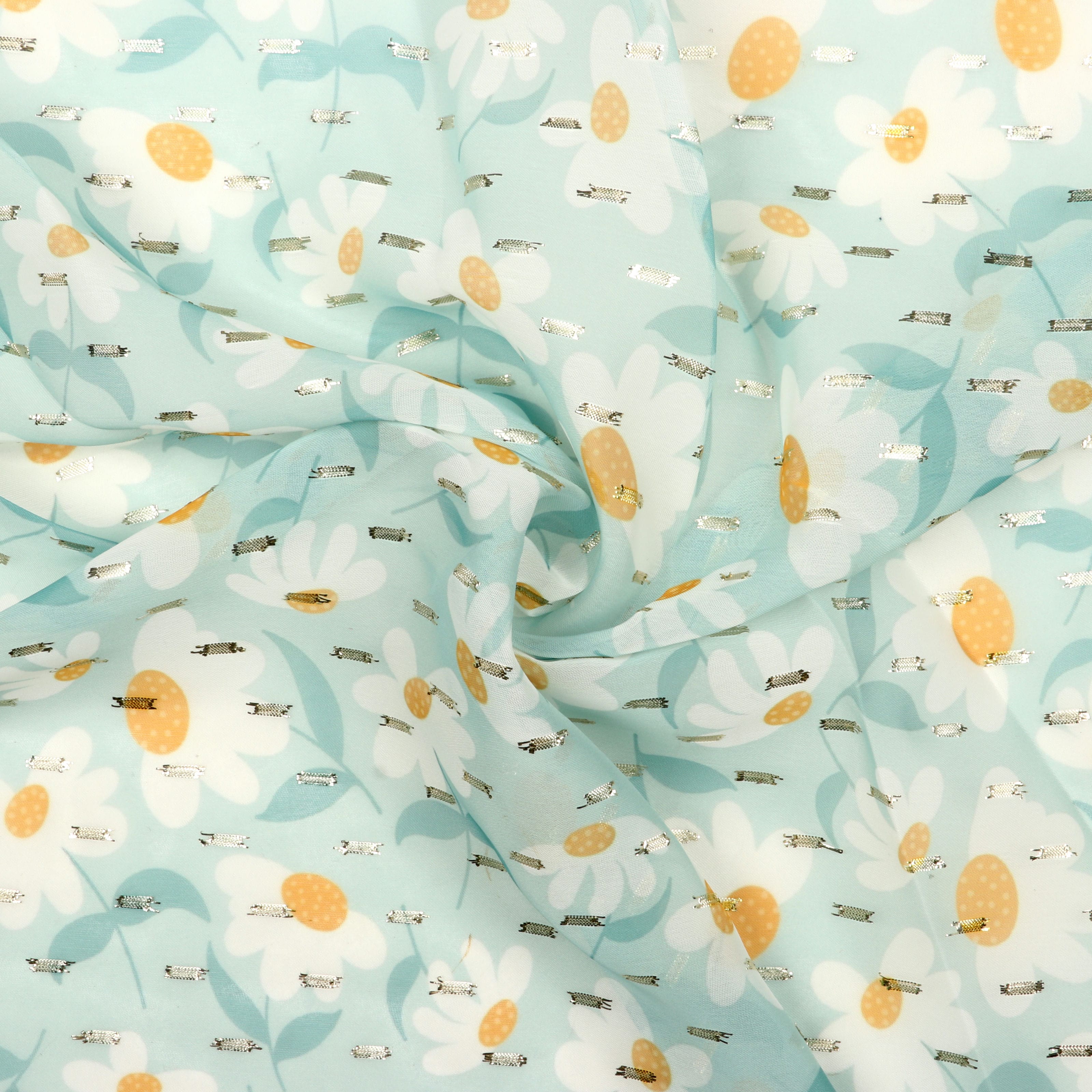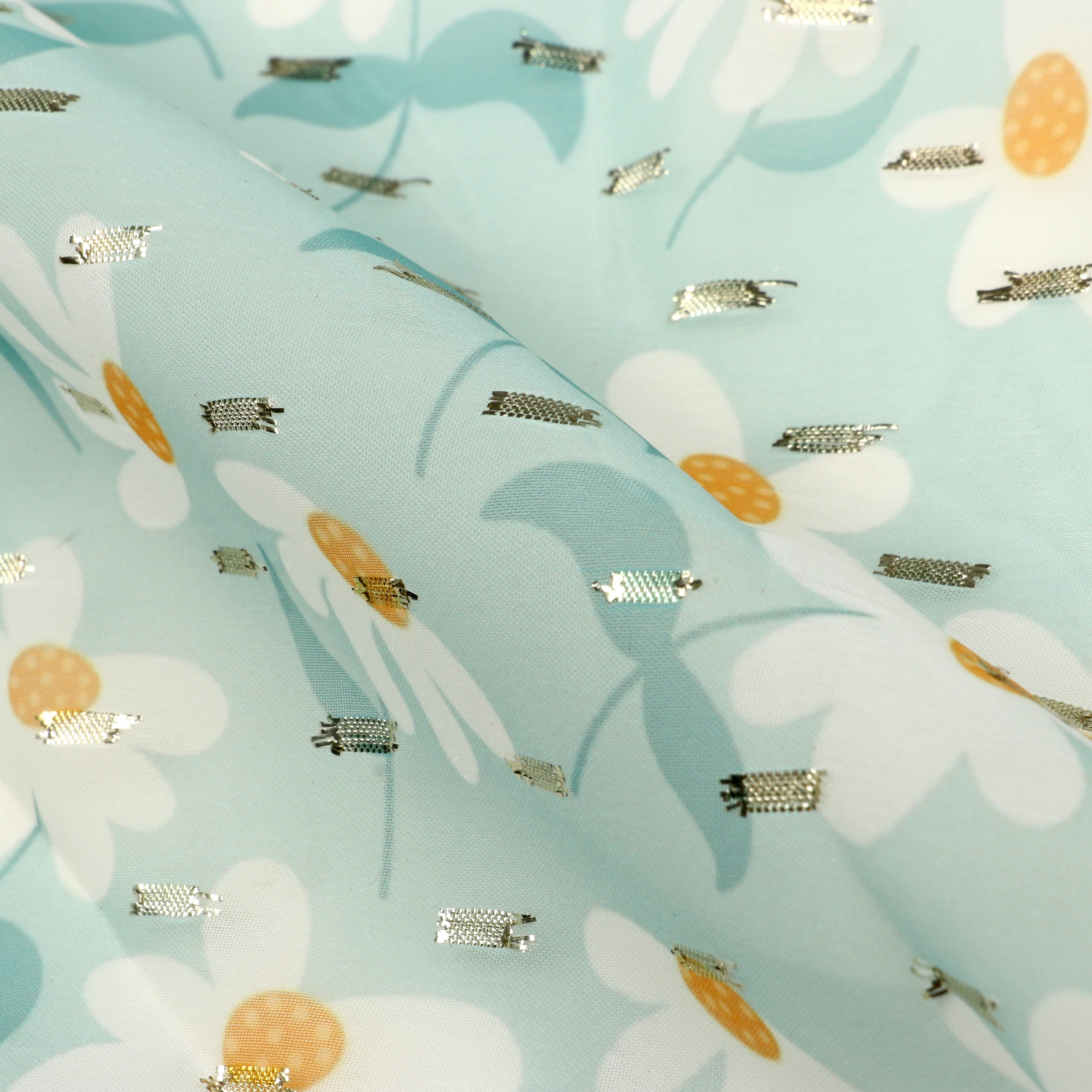 Light Teal and White Floral Digital Print Chiffon Fabric with Golden Zari Dobby Fabric
