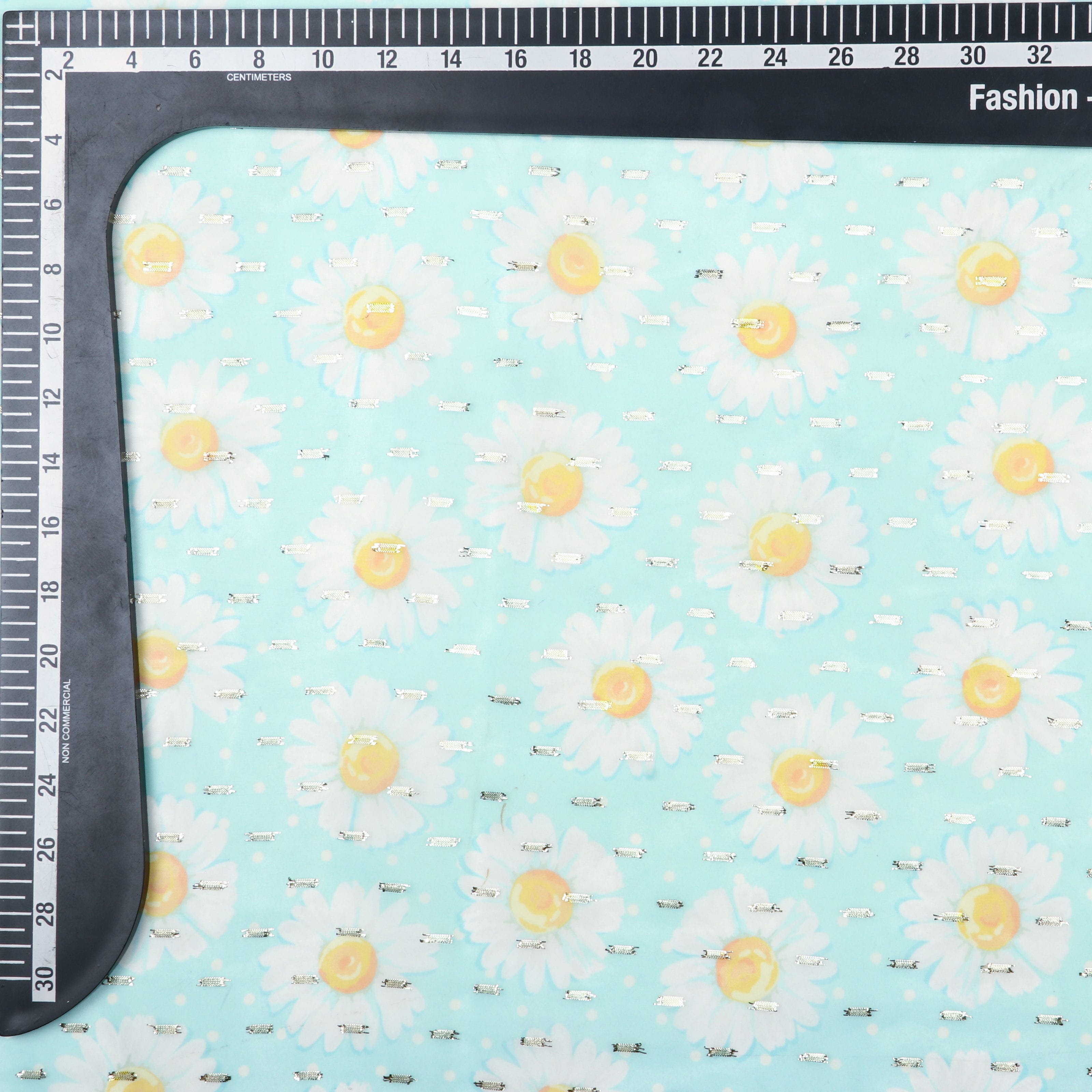 Light Turquoise and White Floral Pattern Digital Print Chiffon Fabric with Golden Zari Dobby