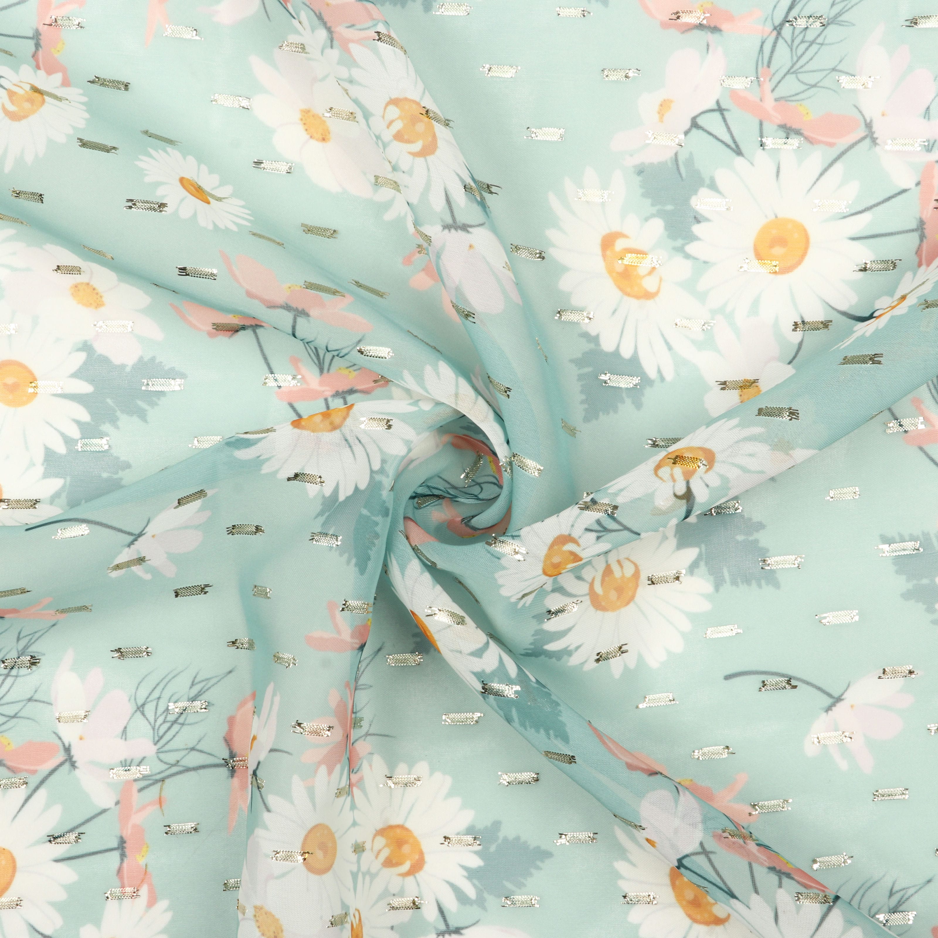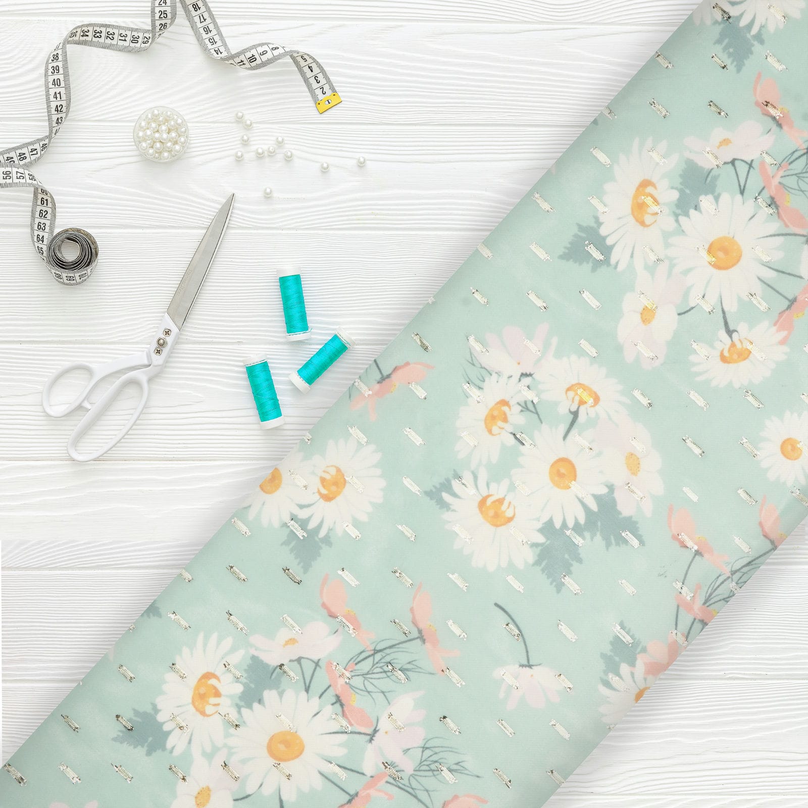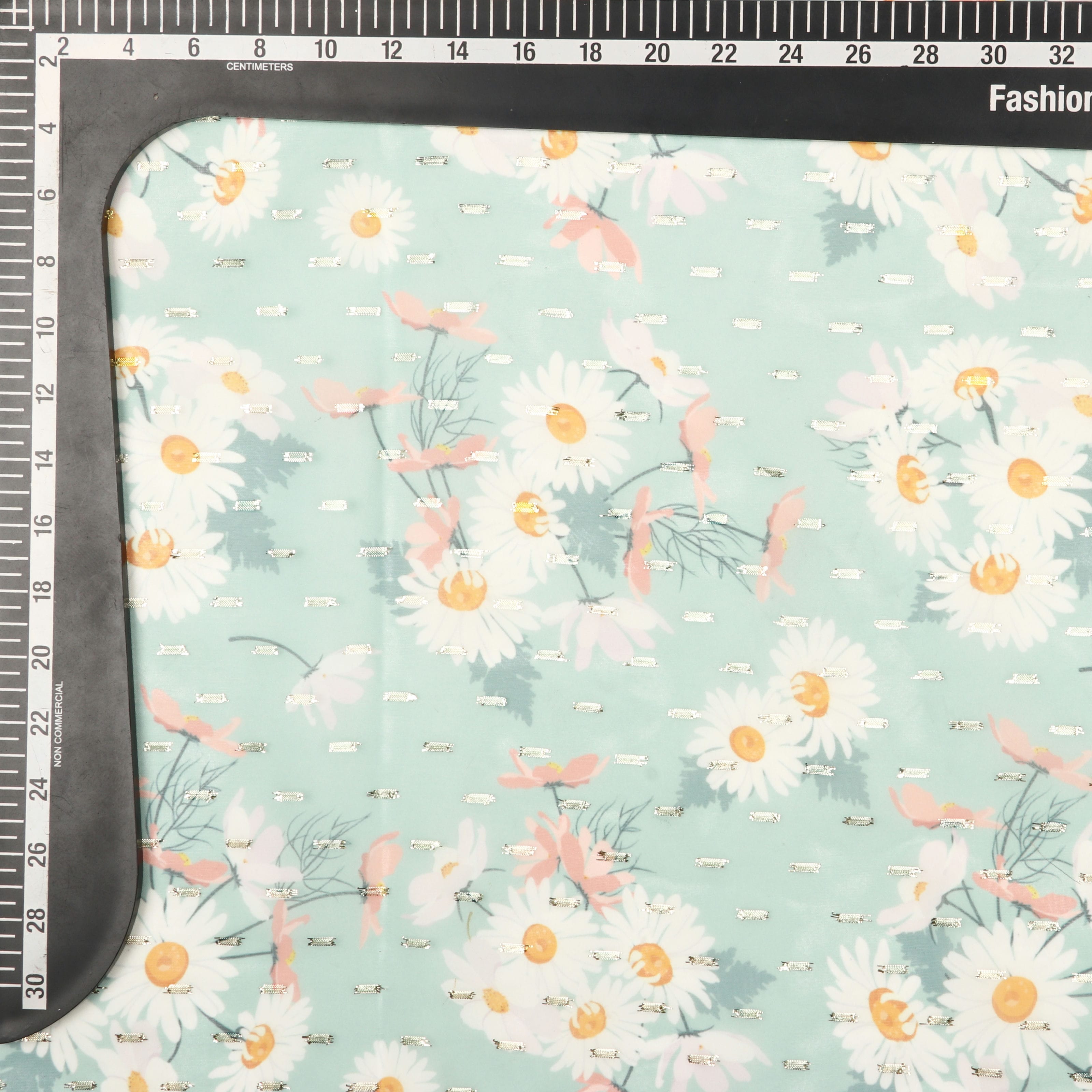 Mint Green and White Floral Pattern Digital Print Chiffon Fabric with Golden Zari Dobby