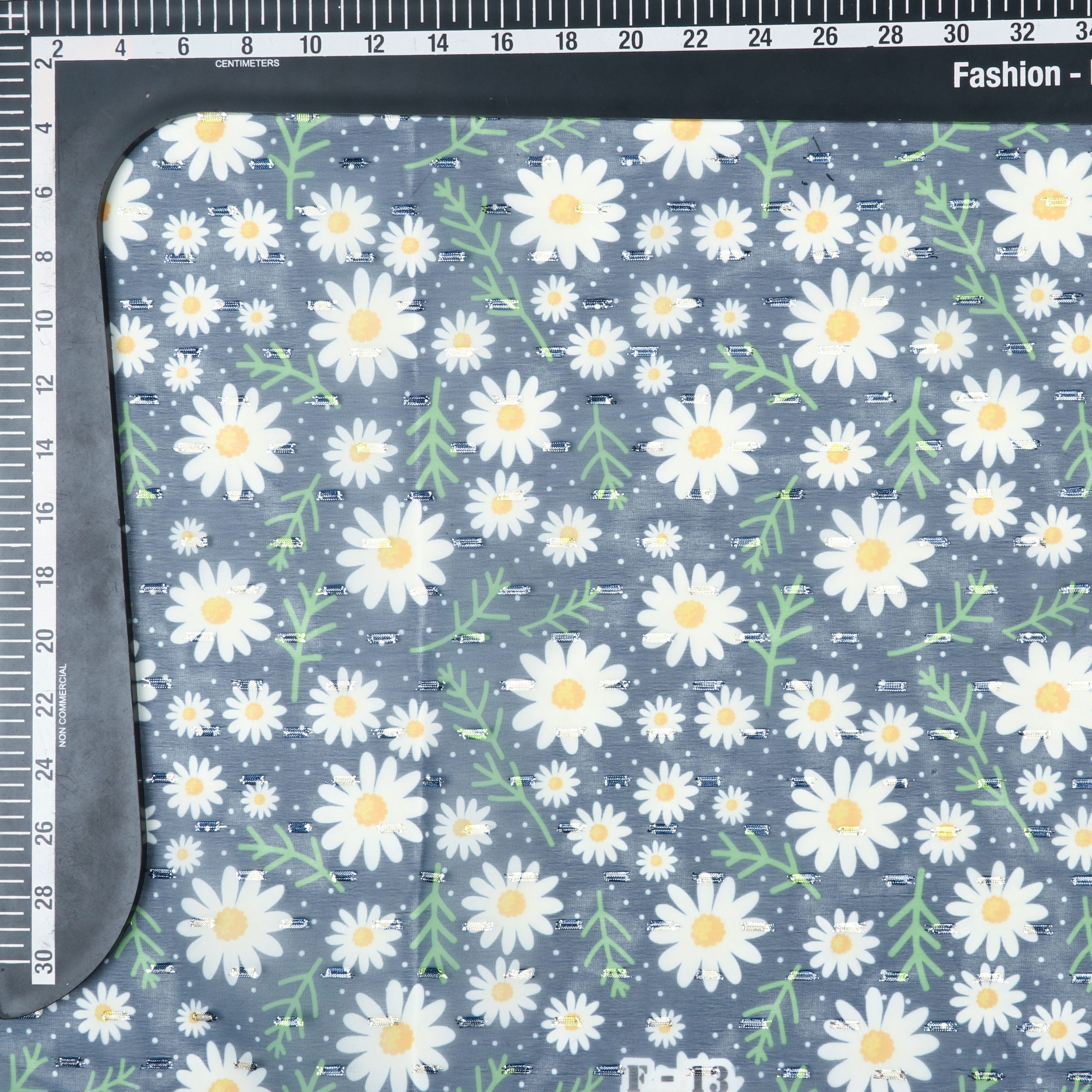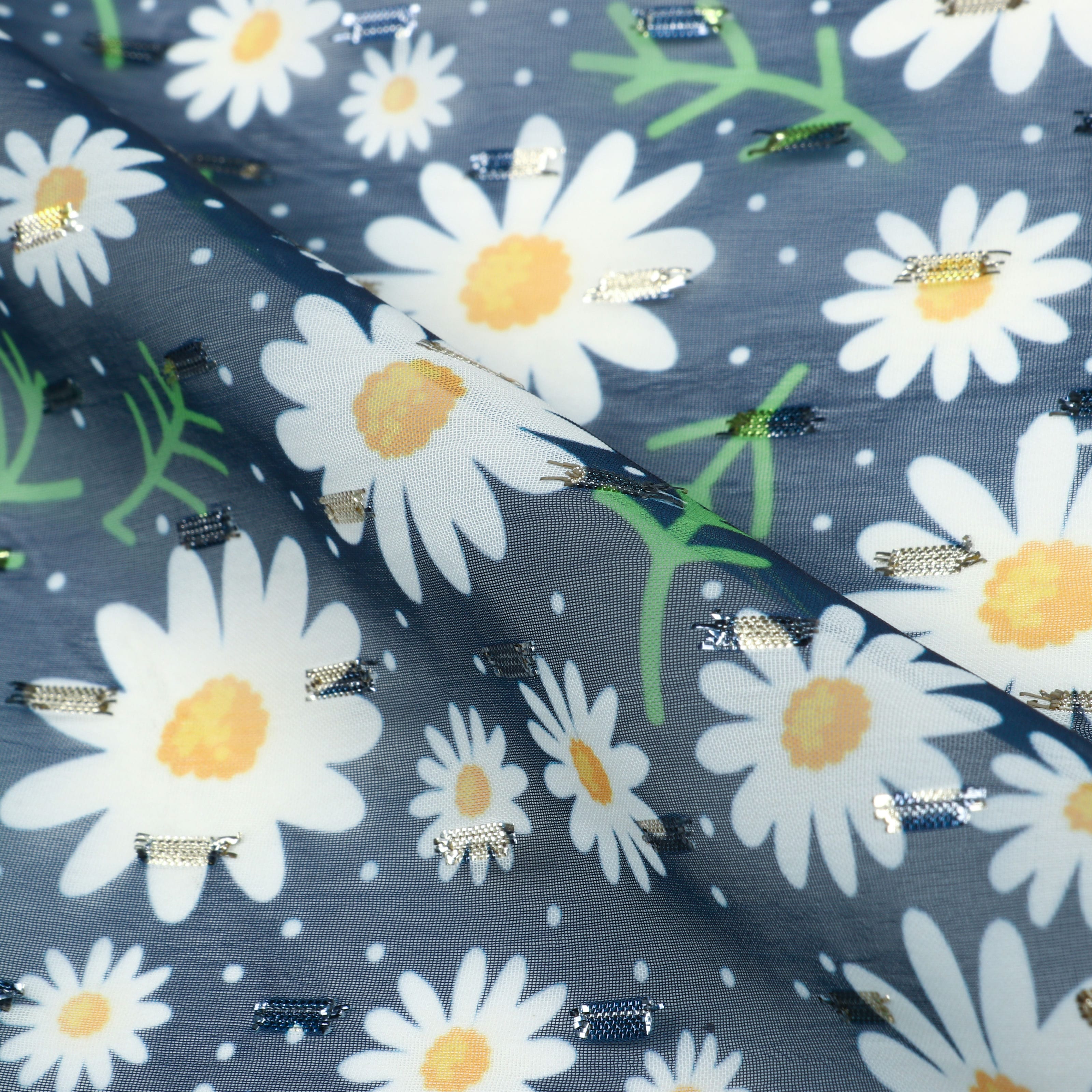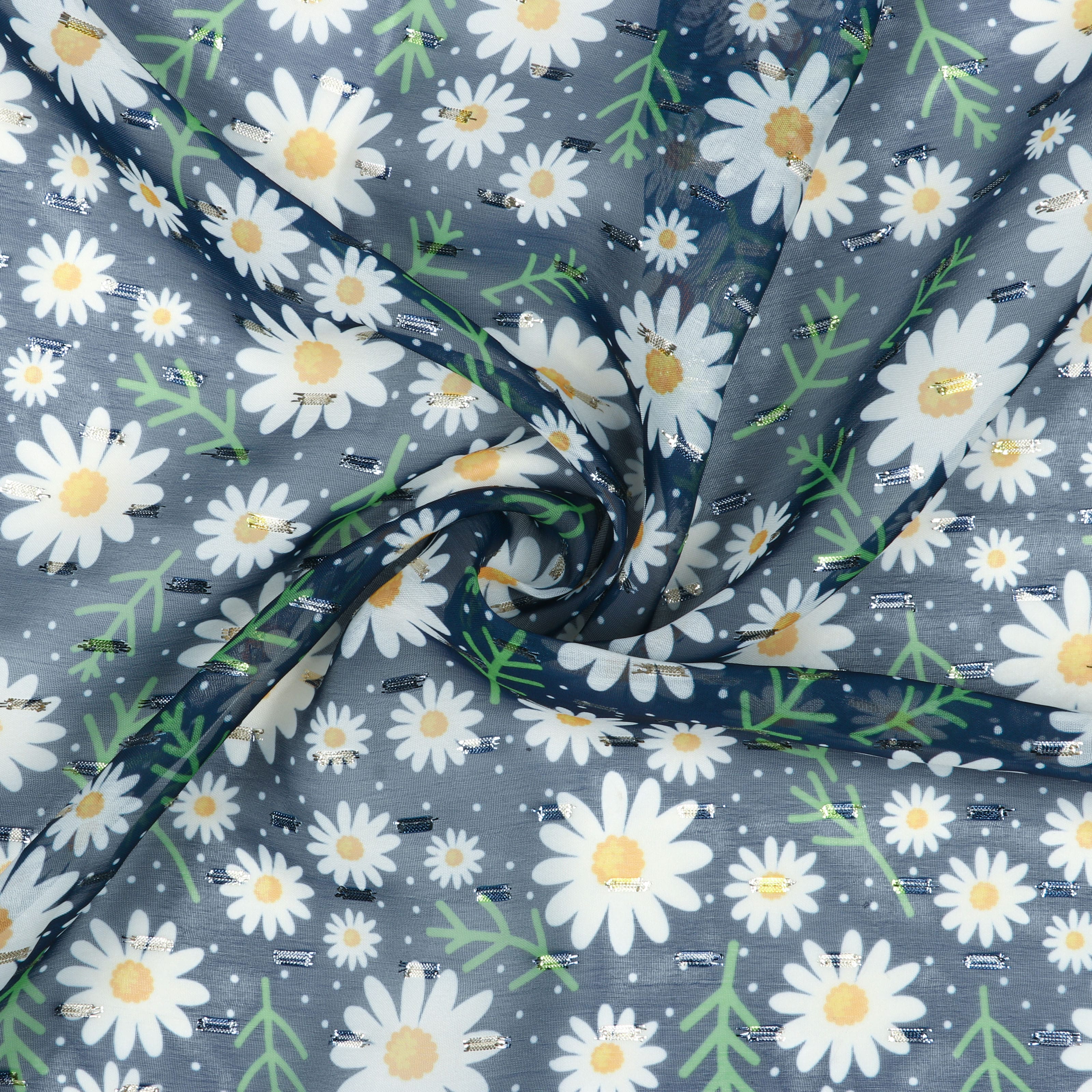 Navy Blue and White Floral Digital Print Chiffon Fabric with Golden Zari Dobby