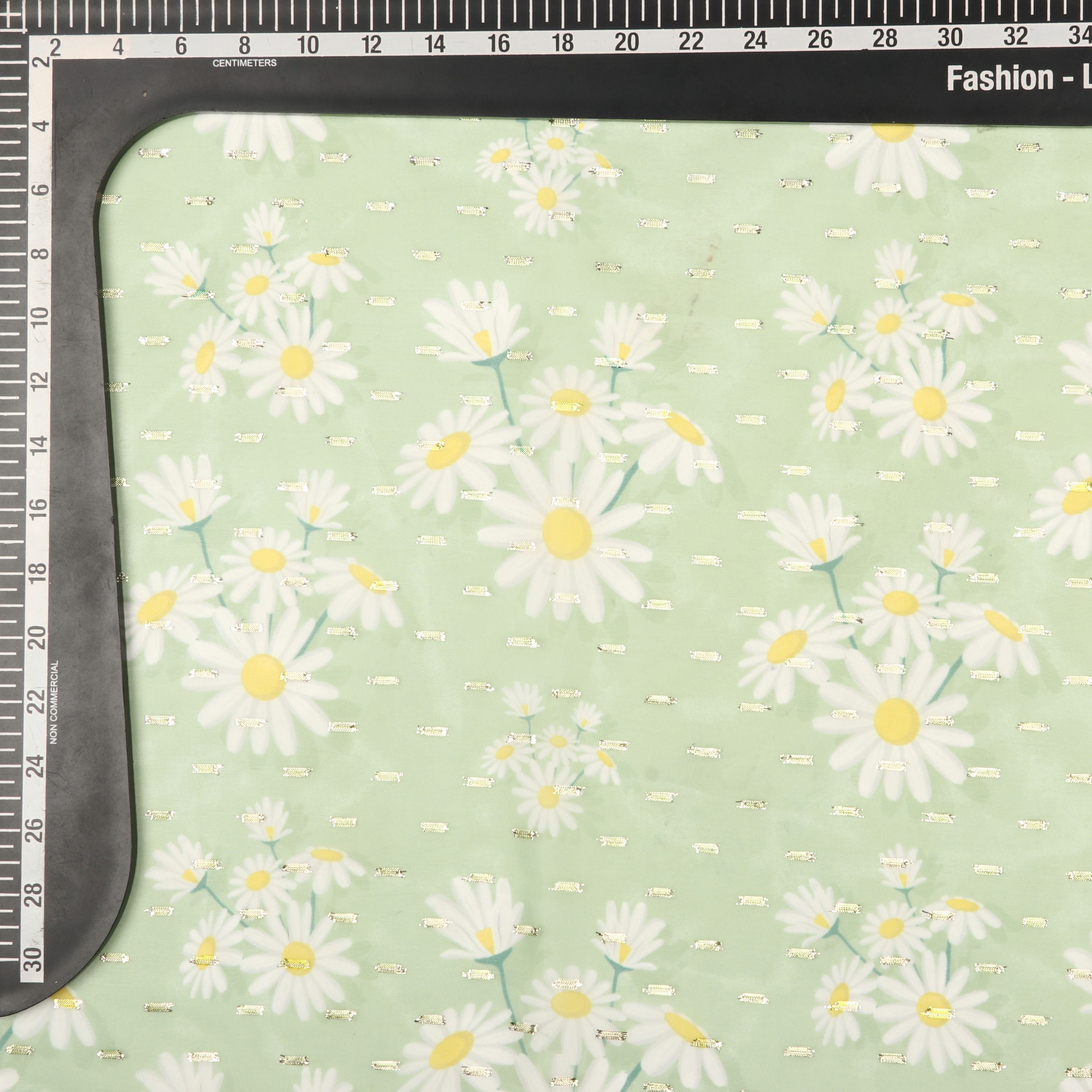 Olive Green and White Floral Pattern Digital Print Chiffon Fabric with Golden Zari Dobby