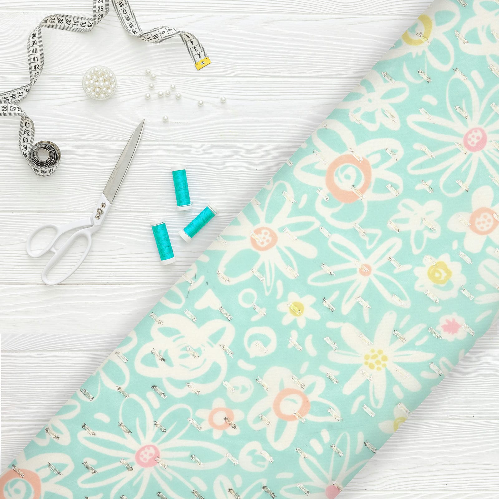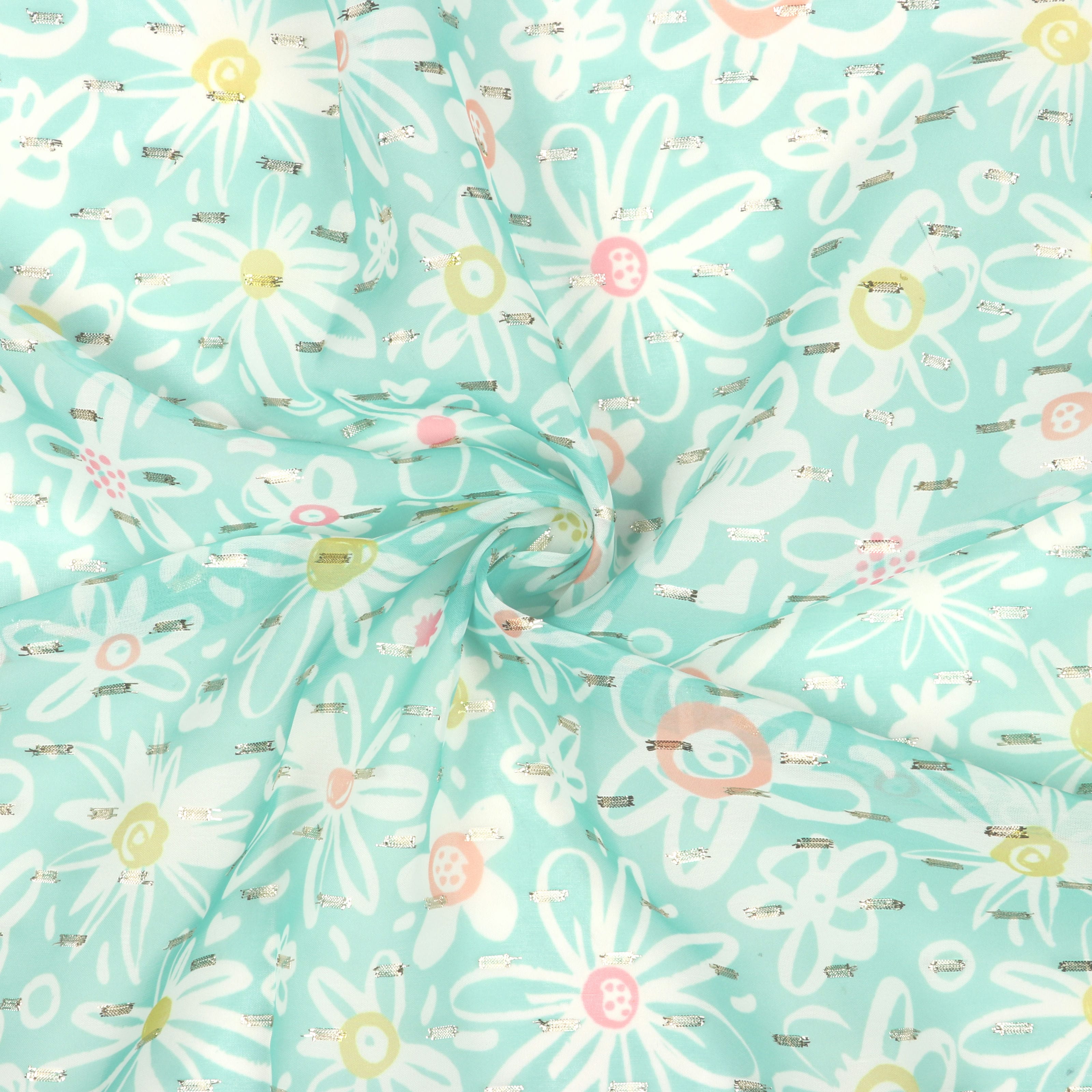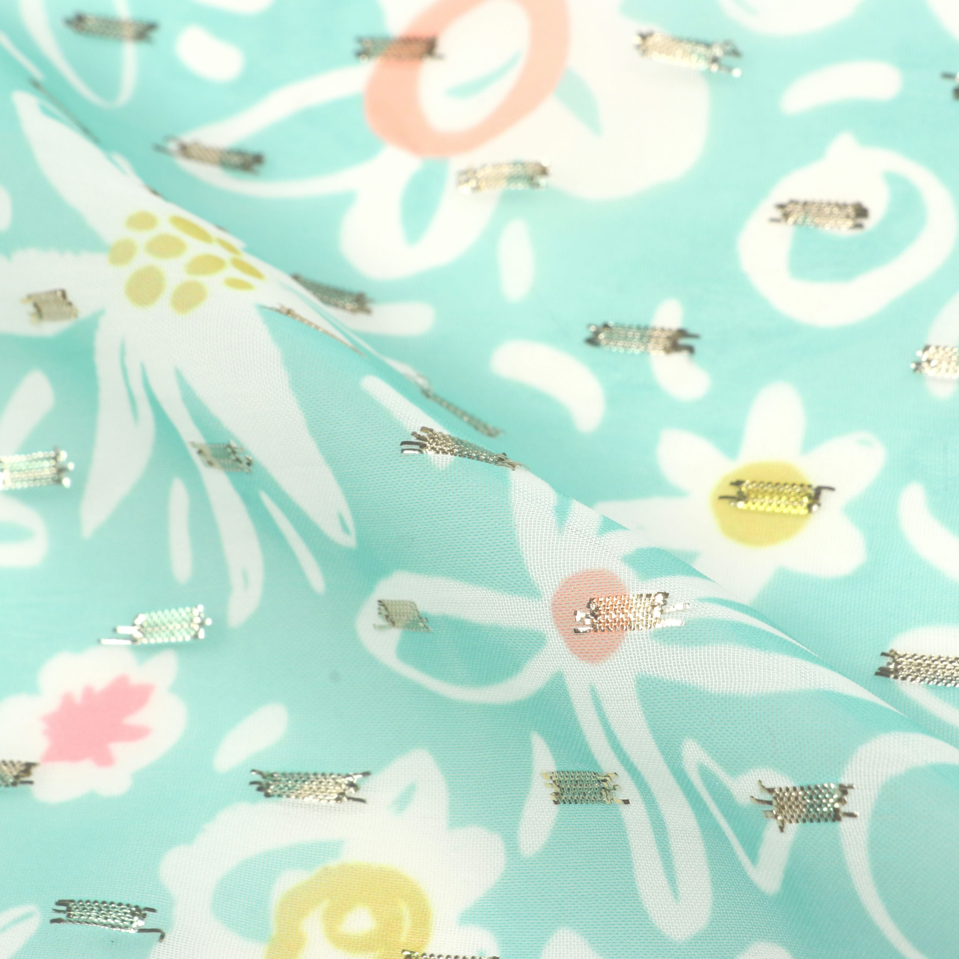 Turquoise and White Floral Digital Print Chiffon Fabric with Golden Zari Dobby