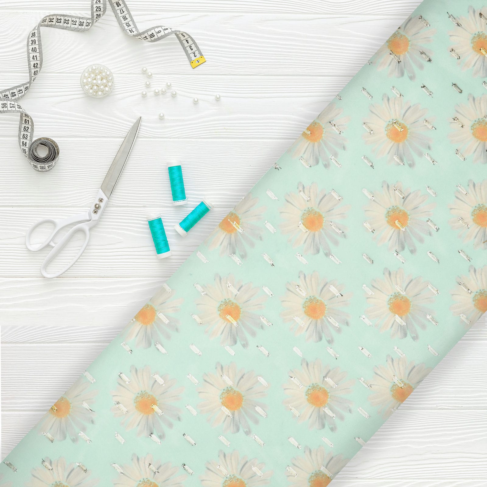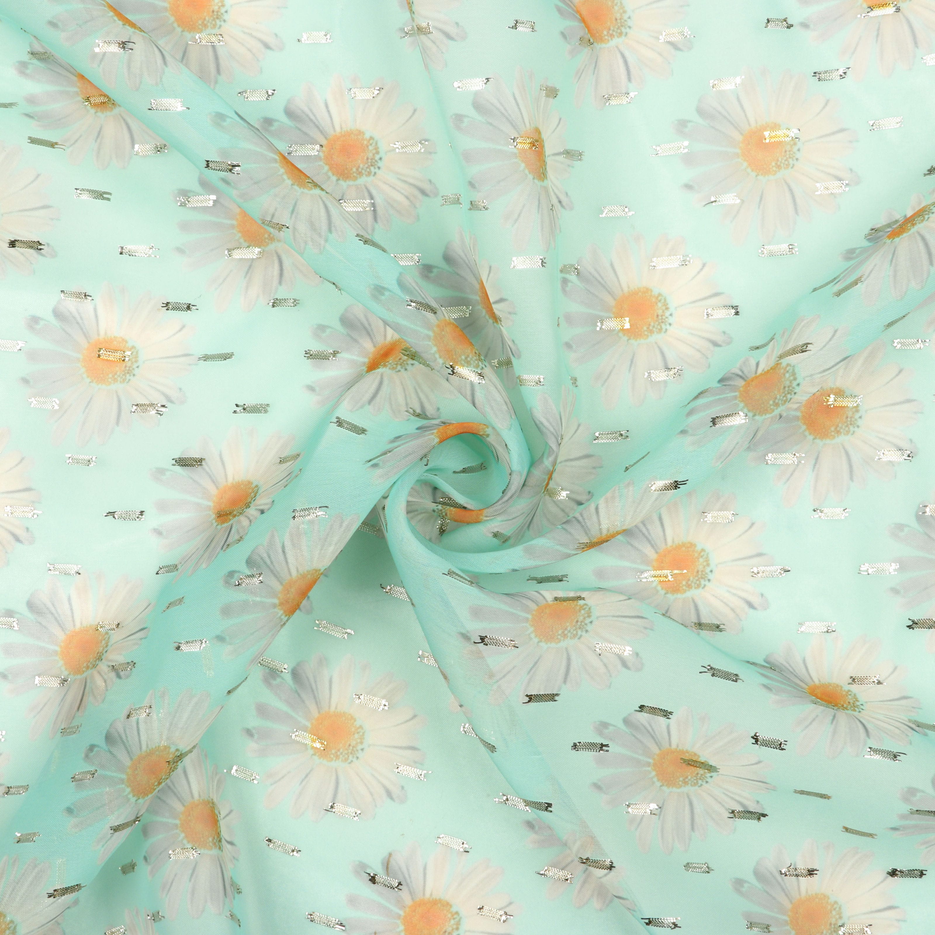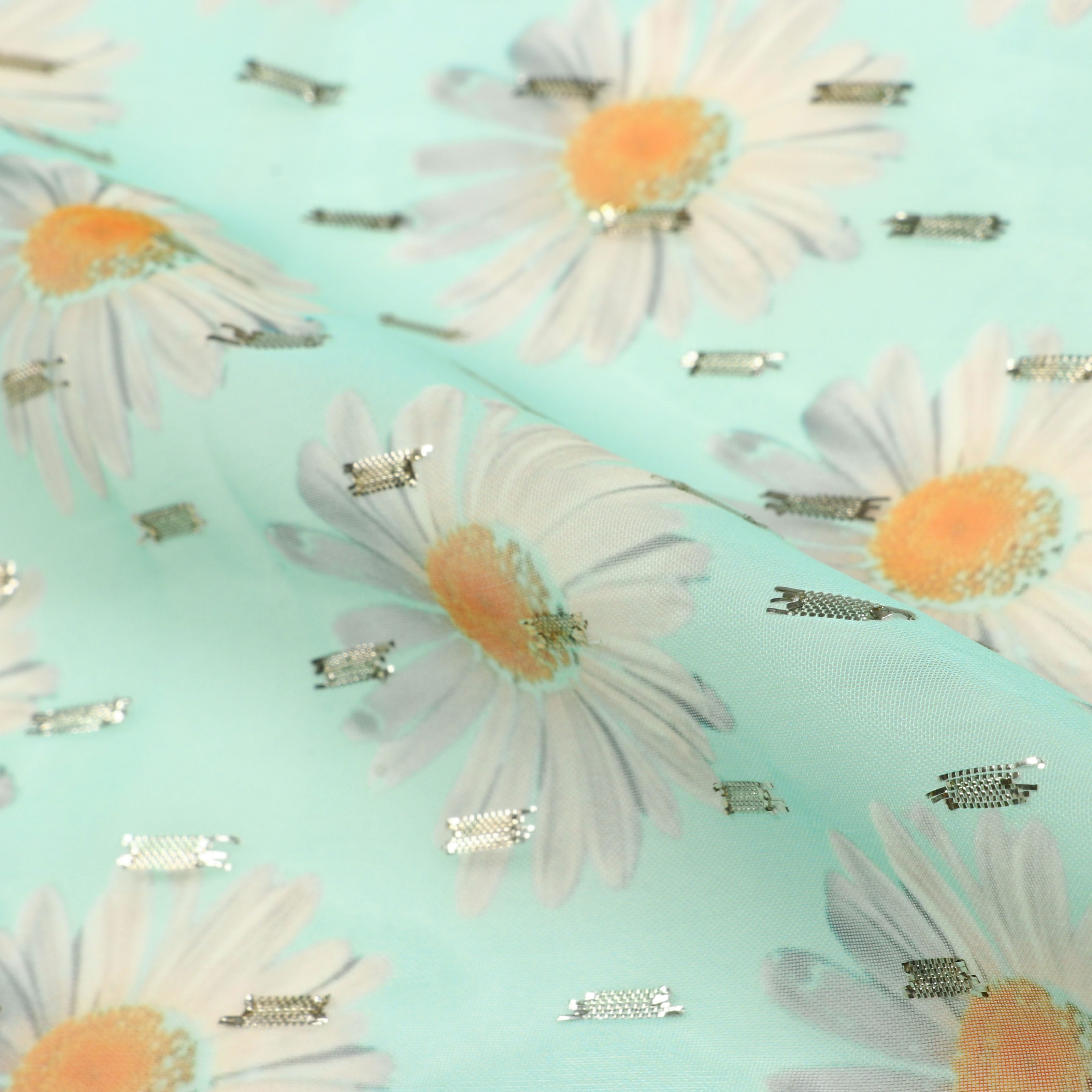 Turquoise and White Floral Pattern Digital Print Chiffon Fabric with Golden Zari Dobby