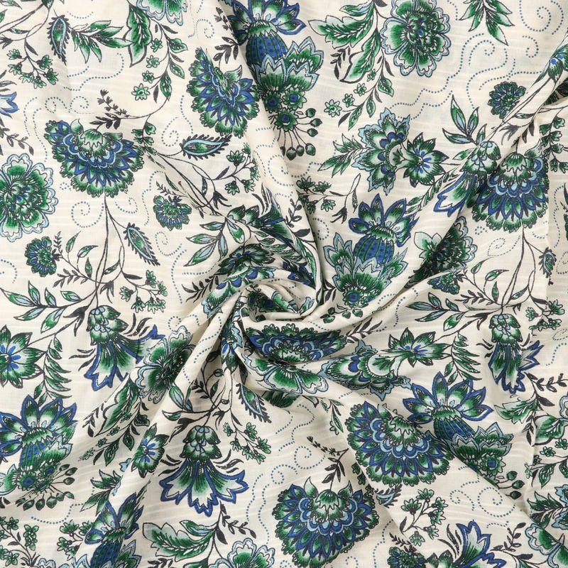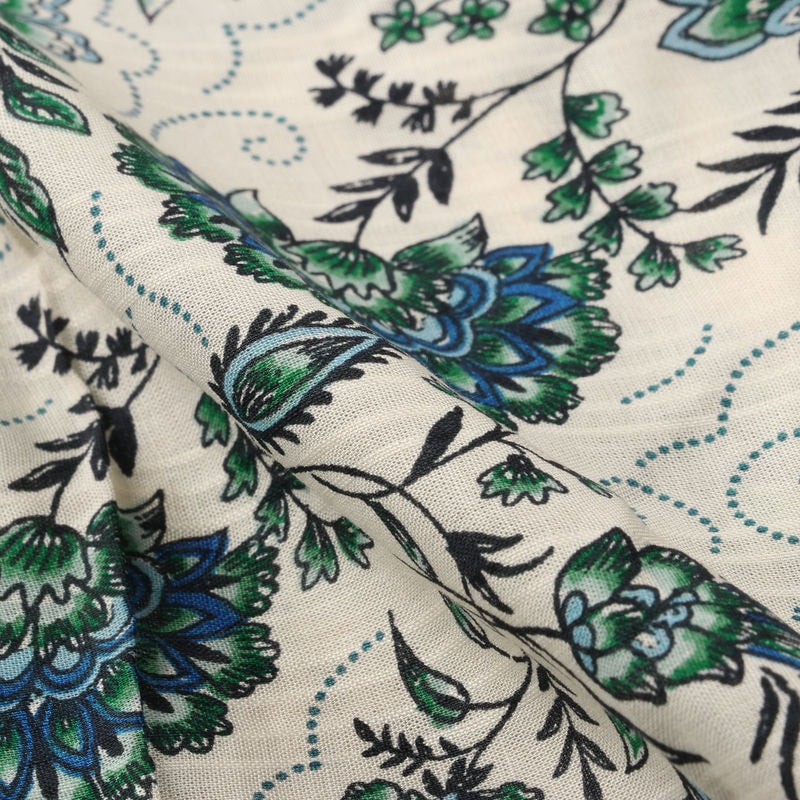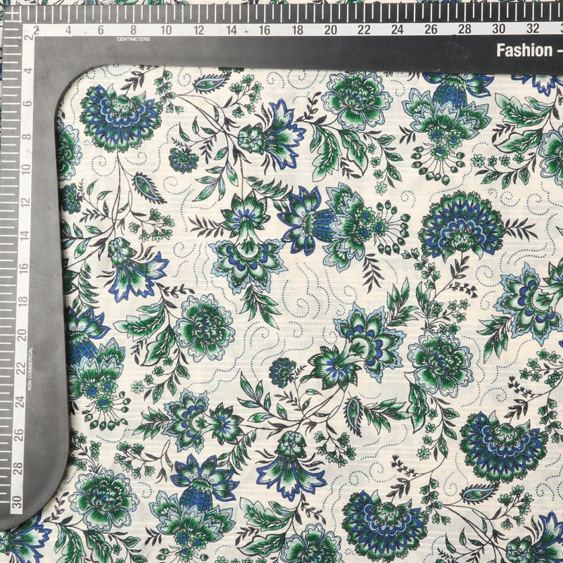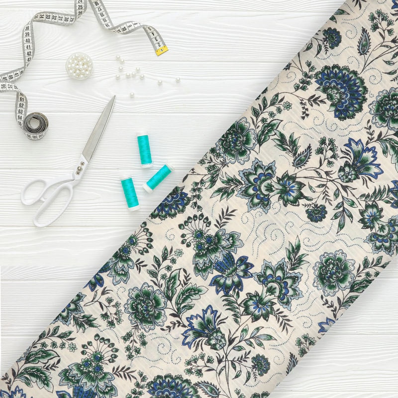 Green And Blue Floral Pattern Screen Print Cotton Silk Fabric